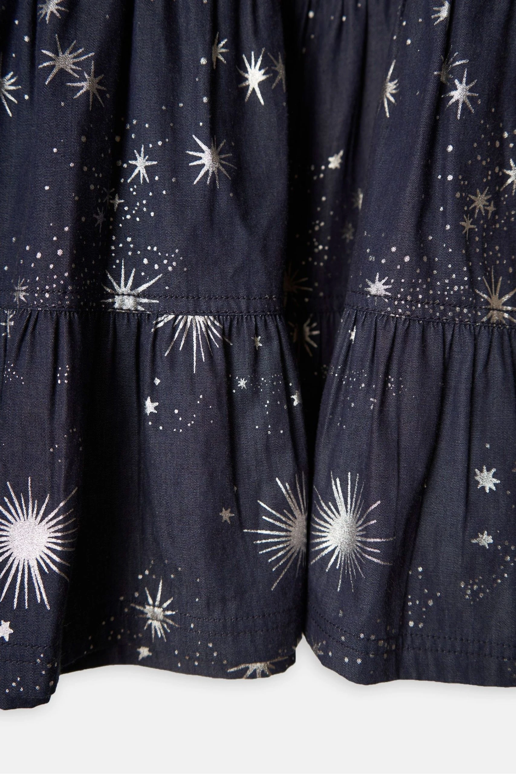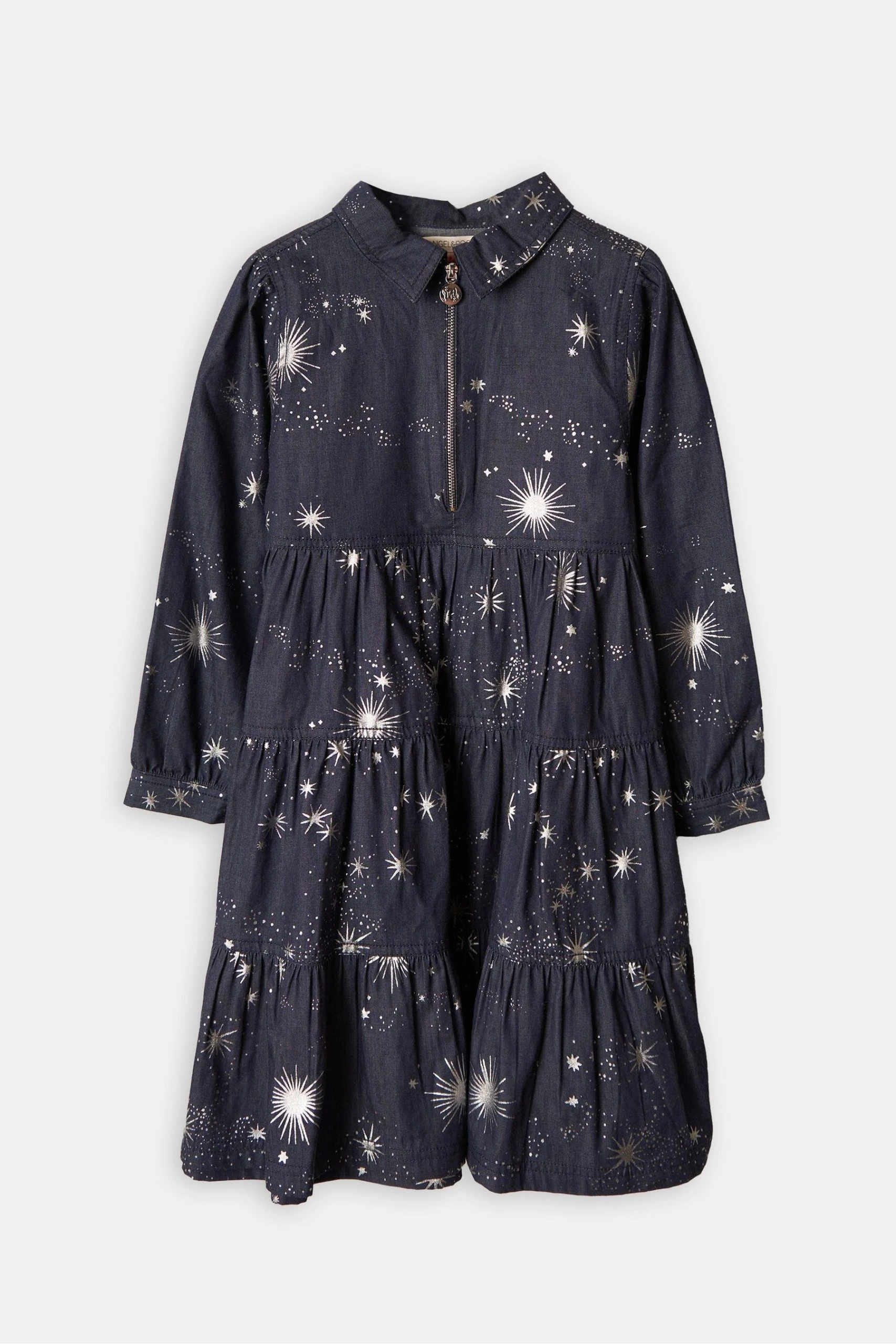 Our signature style updated for the new season. A rich ink blue chambray with a shimmering foil print makes this style stand out amongst the rest. Tiered details and front zip detail, this style can be dressed up or down.