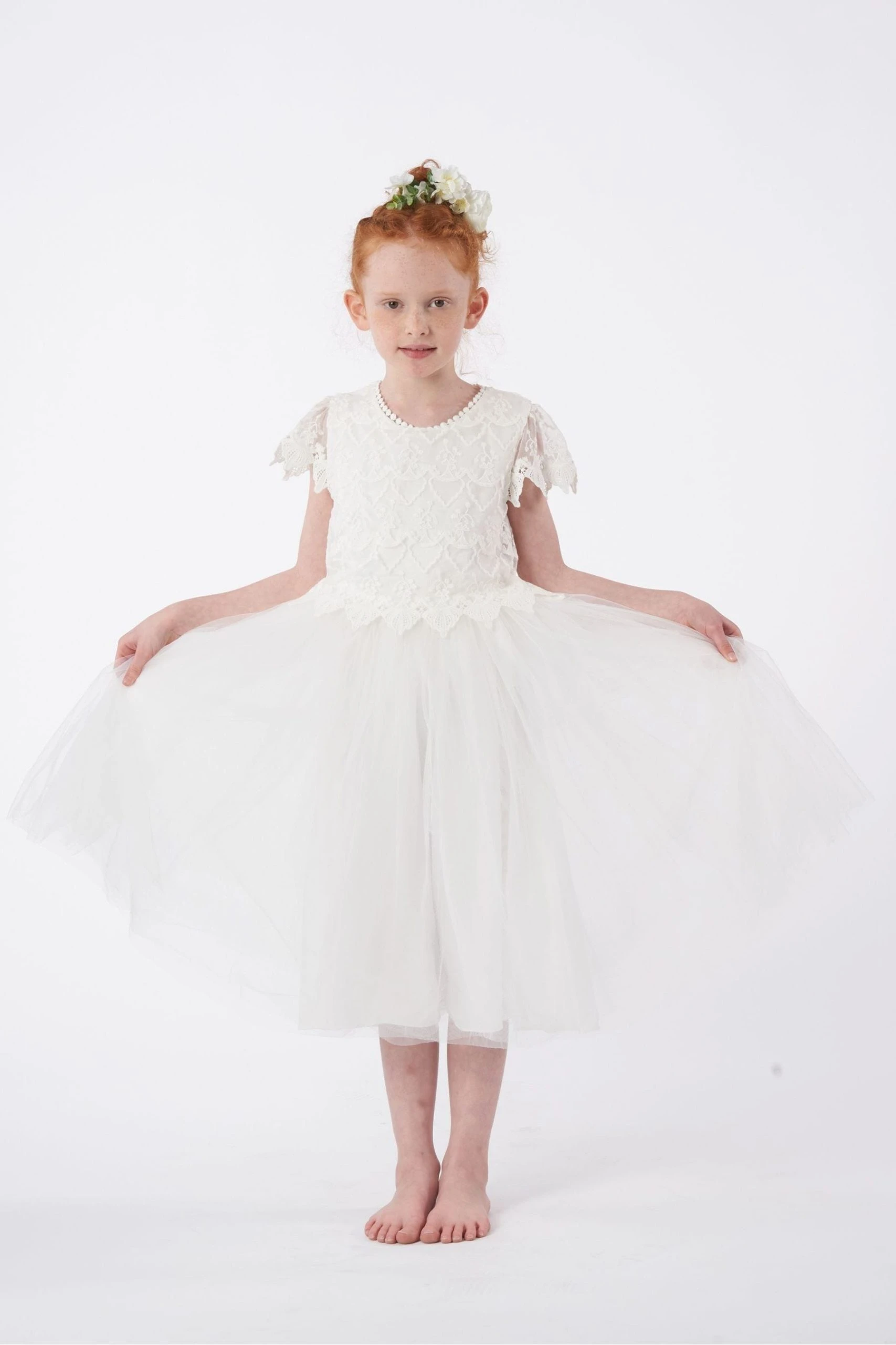 This beautiful ballerina-style dress is the perfect flower girl choice. The delicate scalloped lace bodice creates a petal effect at the waistline. The layers of soft tulle and petticoats bring volume to the sumptuous soft skirt. The dress fastens with a concealed centre back zip. Angel & Rocket cares made with recycled polyester.