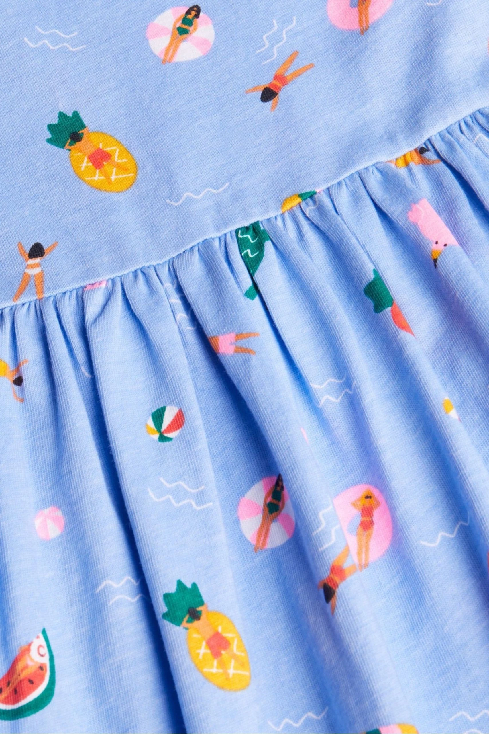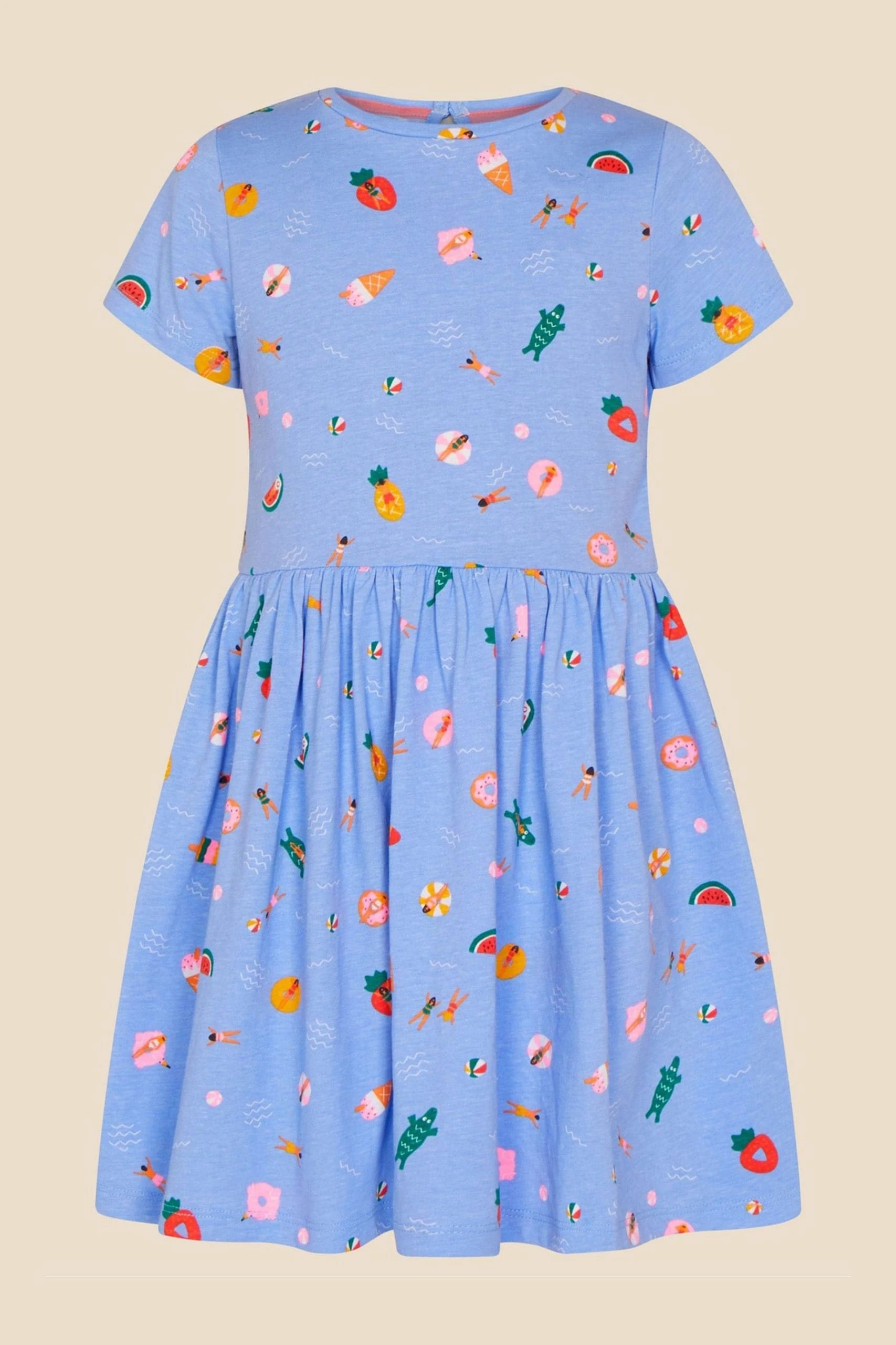 For picnics, bike rides and walks along the beach, this dress displays our Funshine print – featuring all things holiday! Designed in breathable cotton, it’s as comfortable as it is cute, built in a classic skater dress silhouette with short sleeves and a skirt. Finished with pleating, it flares beautifully as they twist and turn throughout the day.