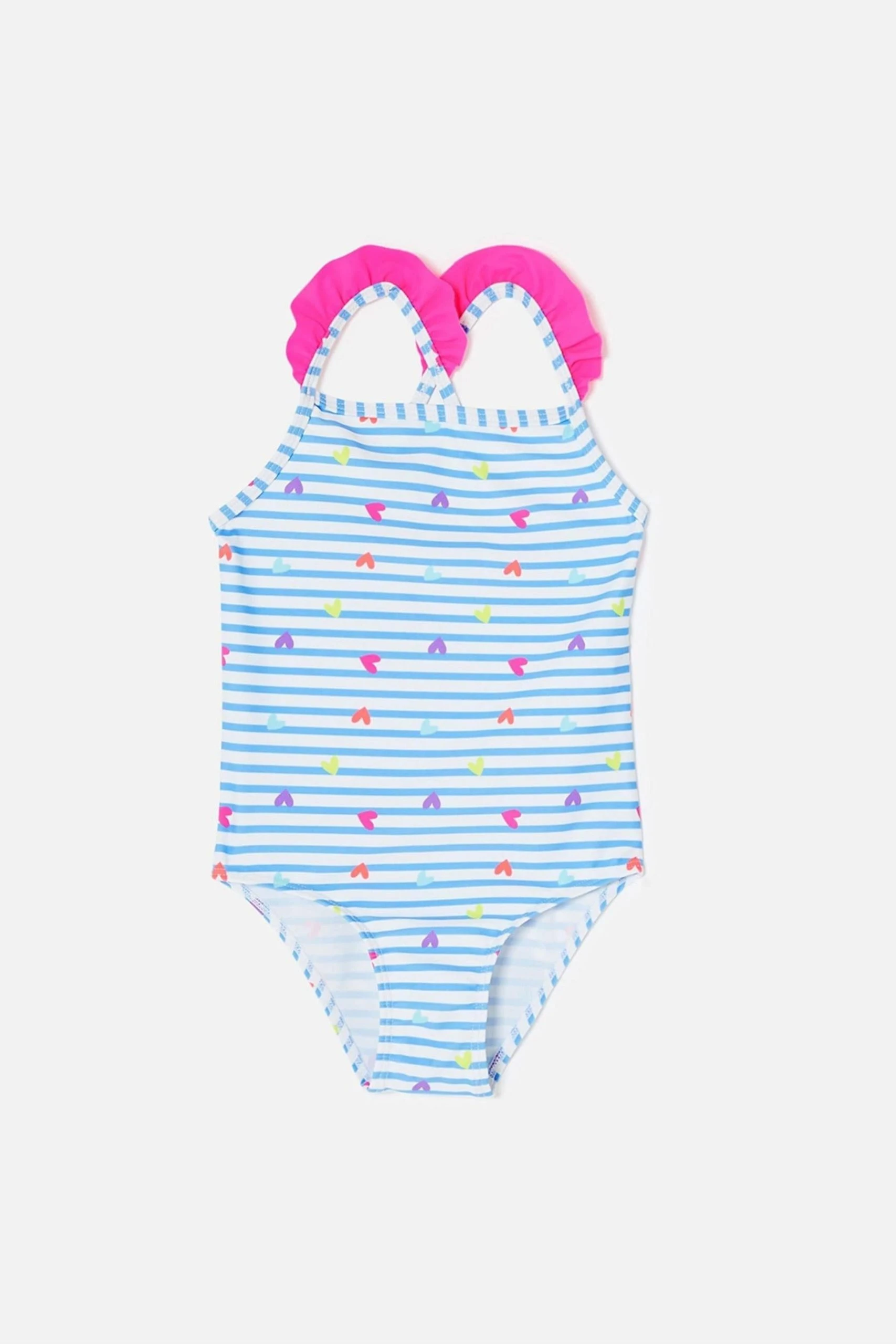 Paddling pool ready: this swimsuit combines a blue striped backdrop with a colourful heart print all-over. The stretchy crossover straps are finished with pink frills, meaning they’ll be easy to spot splashing around in the pool.