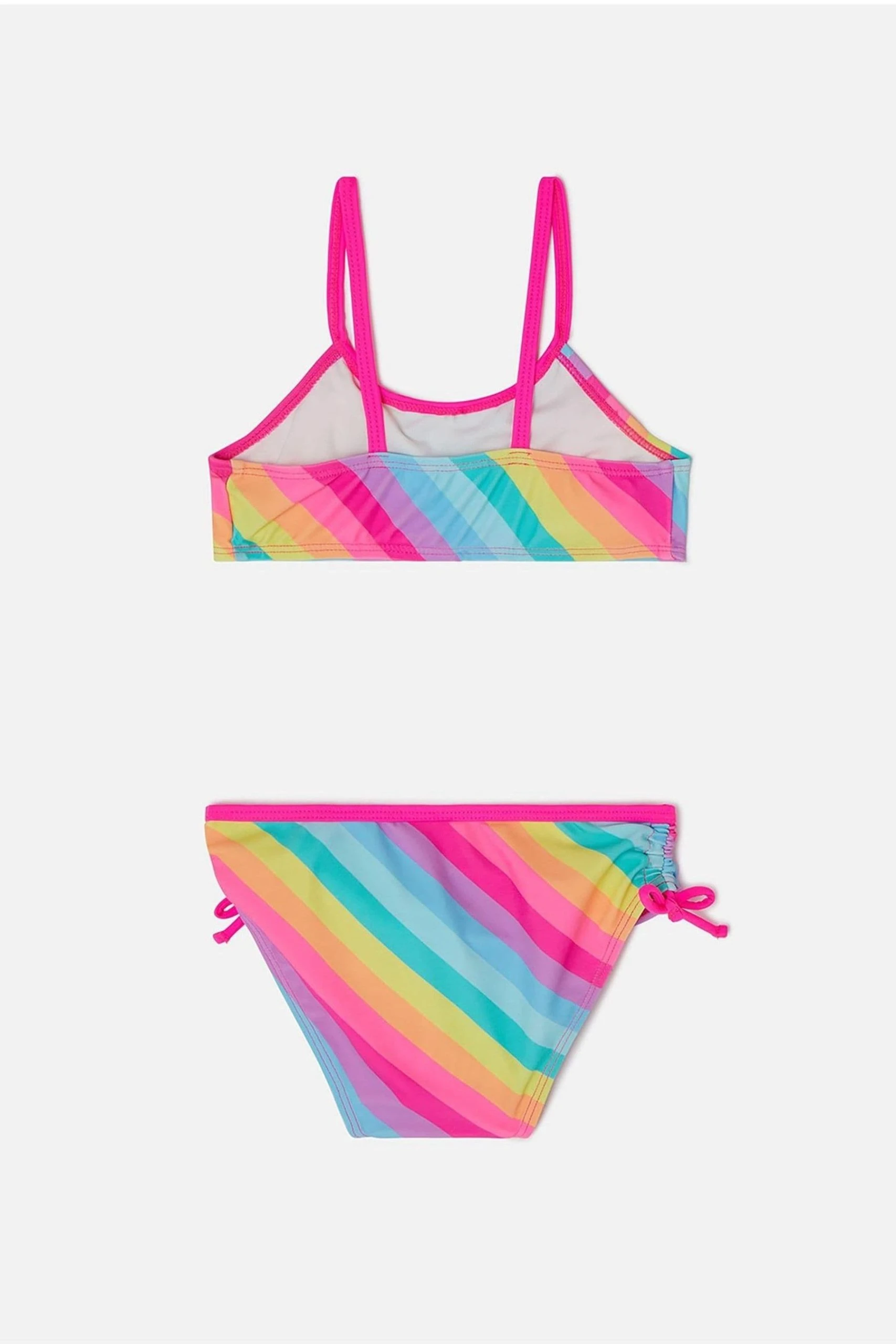 They’ll never be out of sight with this bikini set, designed in a stretchy swim fabric. It features a cropped rainbow stripe top and matching bottoms with tie detailing to the sides. The polyester used to create this piece is made from recycled materials – primarily, plastic bottles.