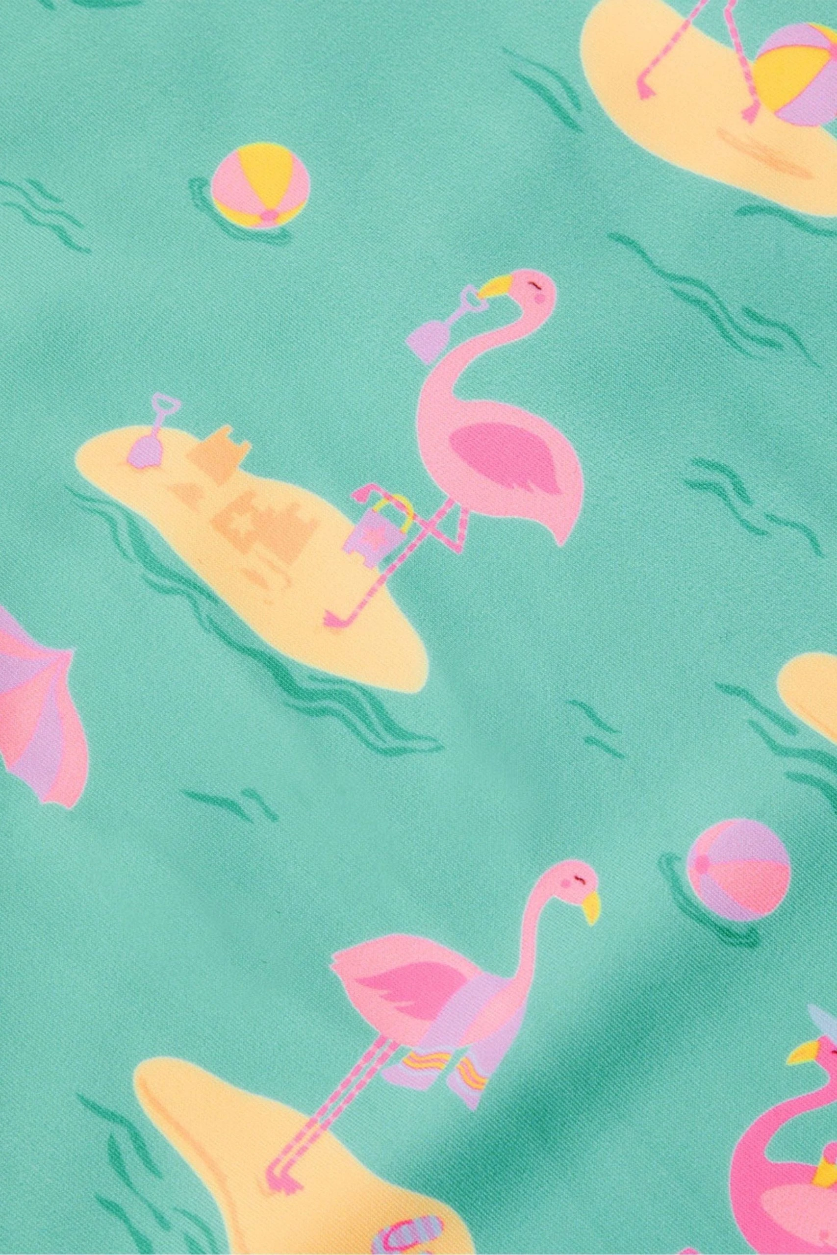 Bring on the beach! Little ones will know a long day of building sandcastles and jumping over incoming waves is ahead when they slip into this swimsuit in the morning. Splashed in an aqua hue, they’ll adore the summery print including flamingos and beach balls. Designed in stretchy swim fabric, it features spaghetti straps with a frill detail to the neckline. The polyester used to create this piece is made from recycled materials – primarily, plastic bottles.