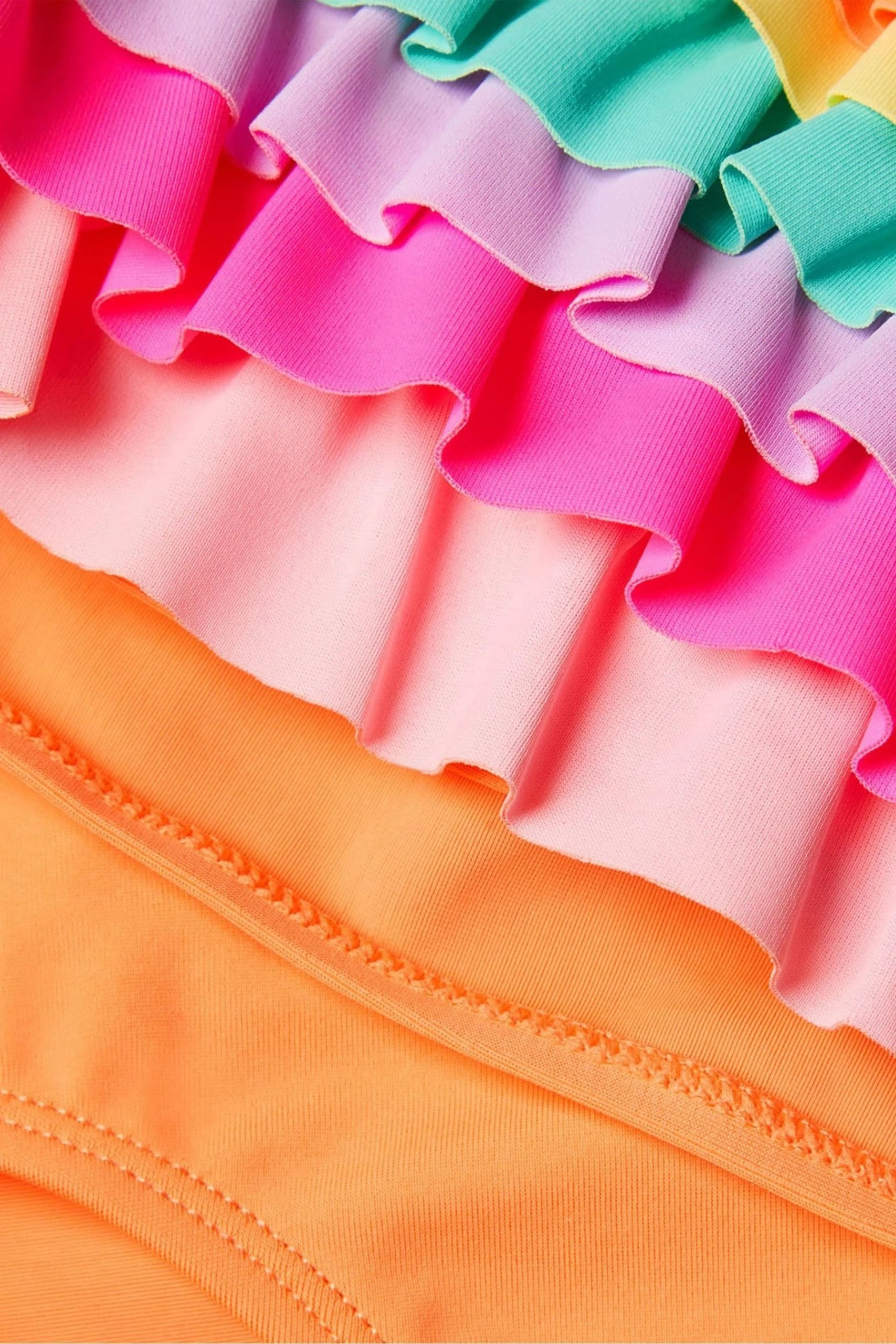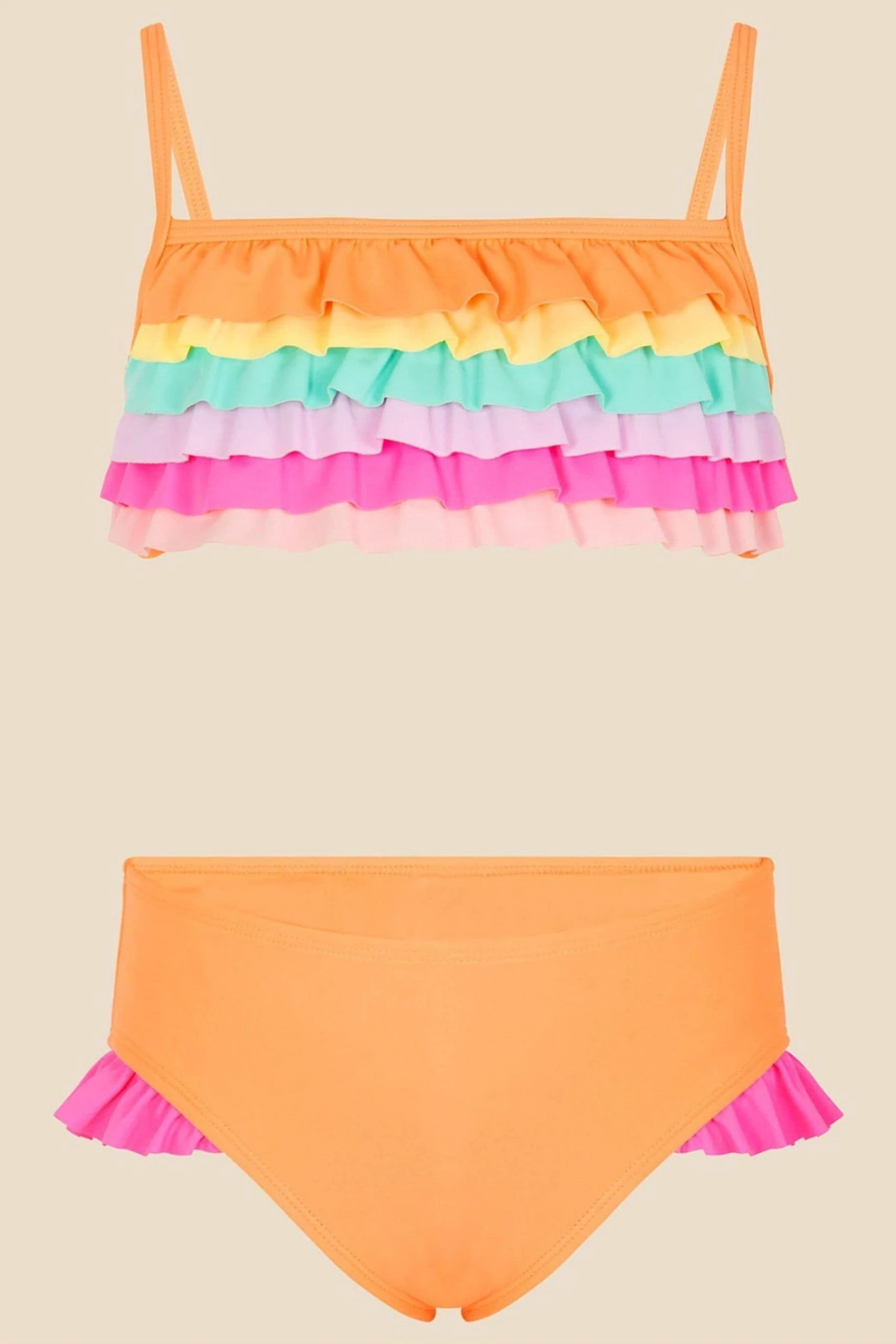Ruffles of rainbow decorate the orange backdrop on this bikini set, creating a great option for splashing under the summer sun. As comfortable as it is playful, it features a square neck and elasticated straps to the bikini top, with bikini briefs to match. The polyester used to create this piece is made from recycled materials – primarily, plastic bottles.