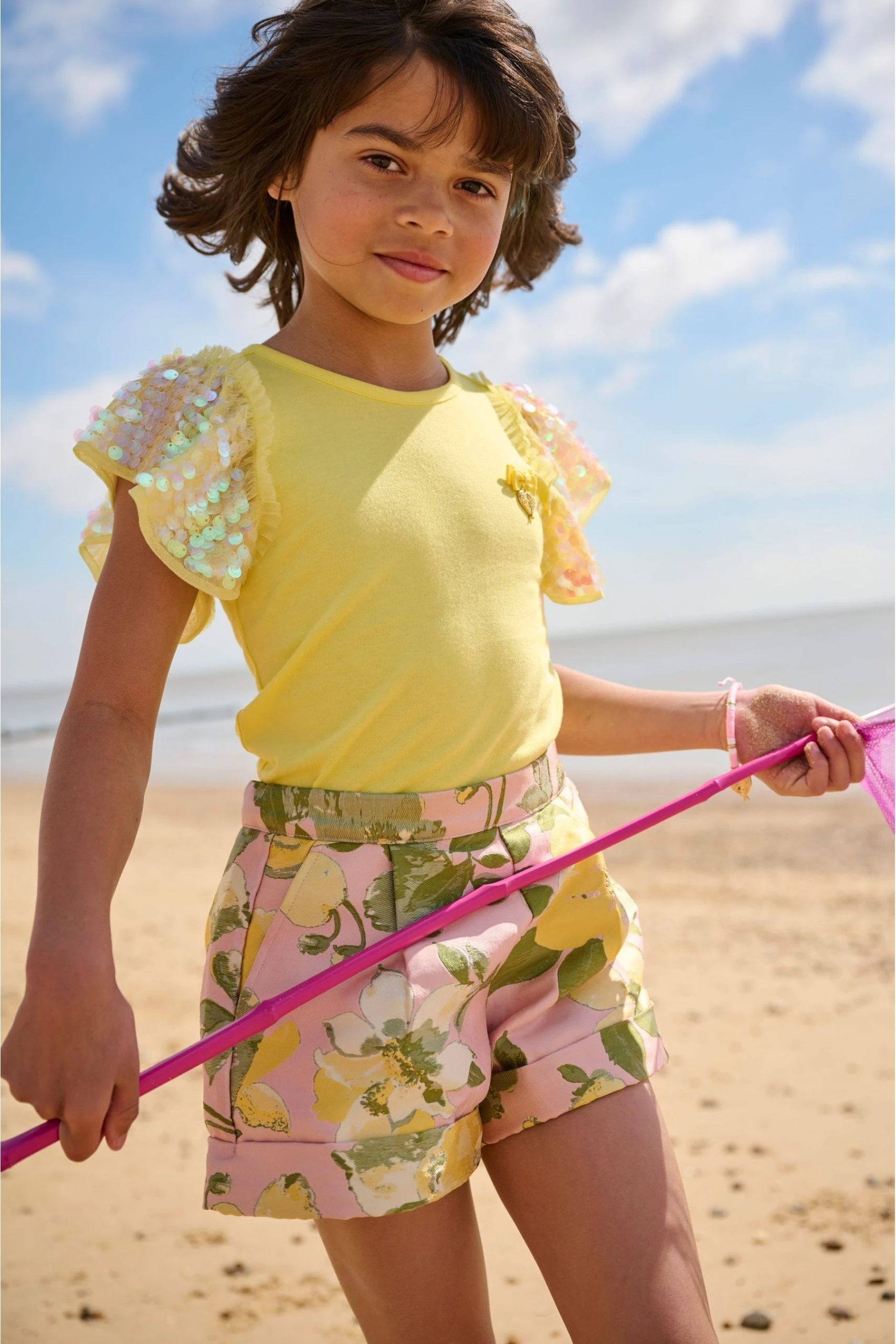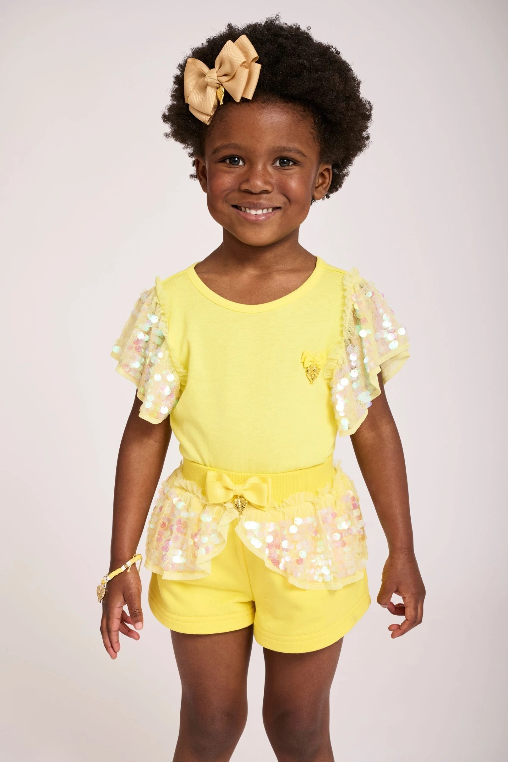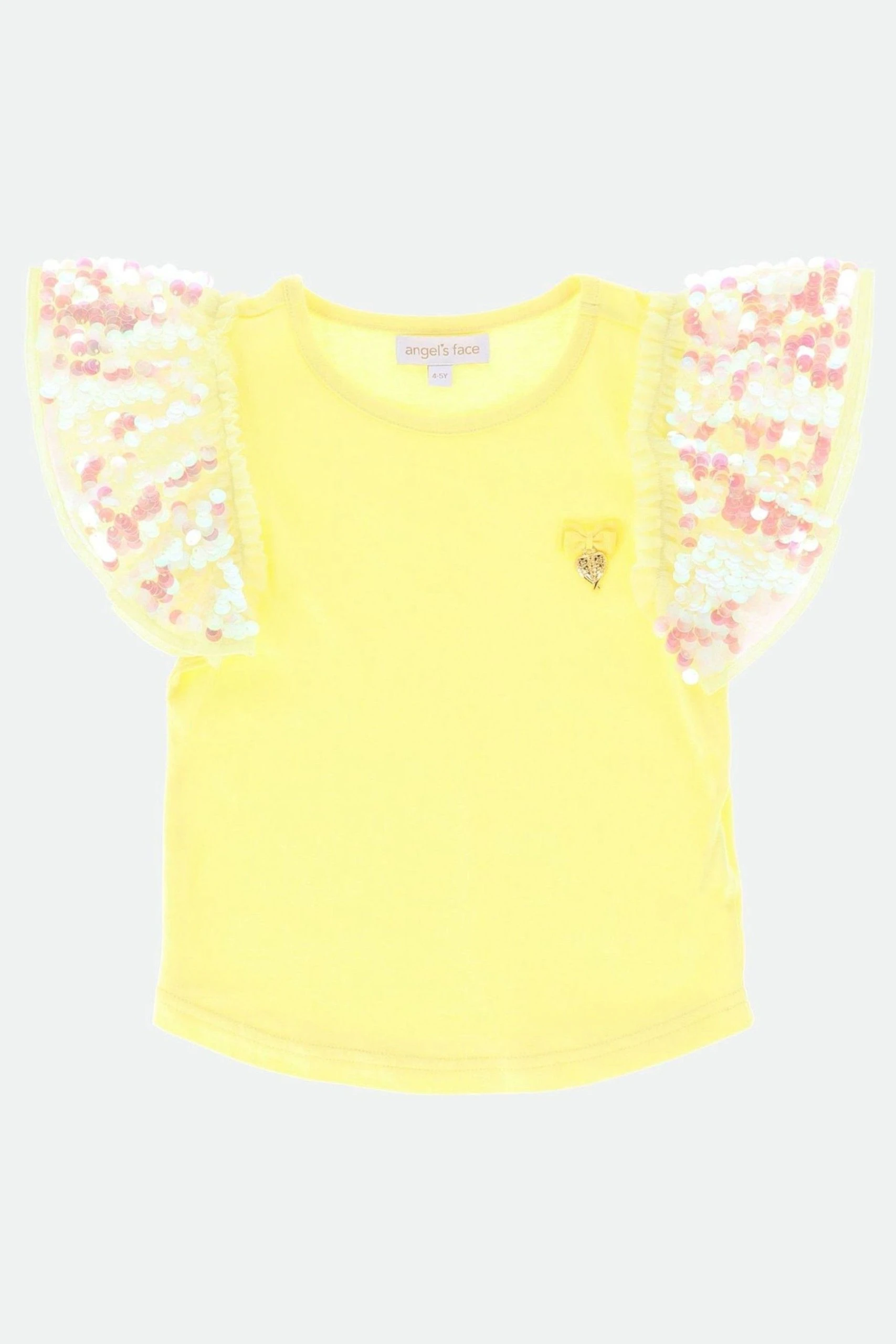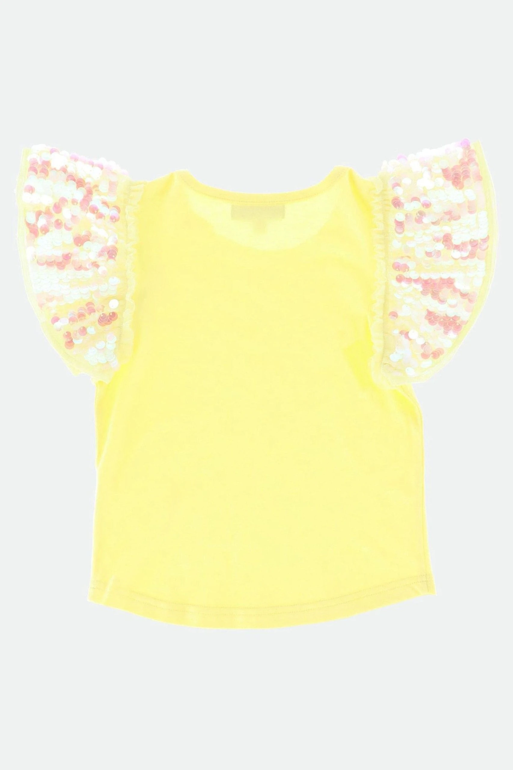 Sparkling summer t-shirt in yellow featuring our signature bow and gold heart charm on the chest. Glamorous ruffle sleeves decorated with iridescent sparkling sequins on a soft tulle base. Bodice is made from a soft stretch cotton with an easy pull on fit.