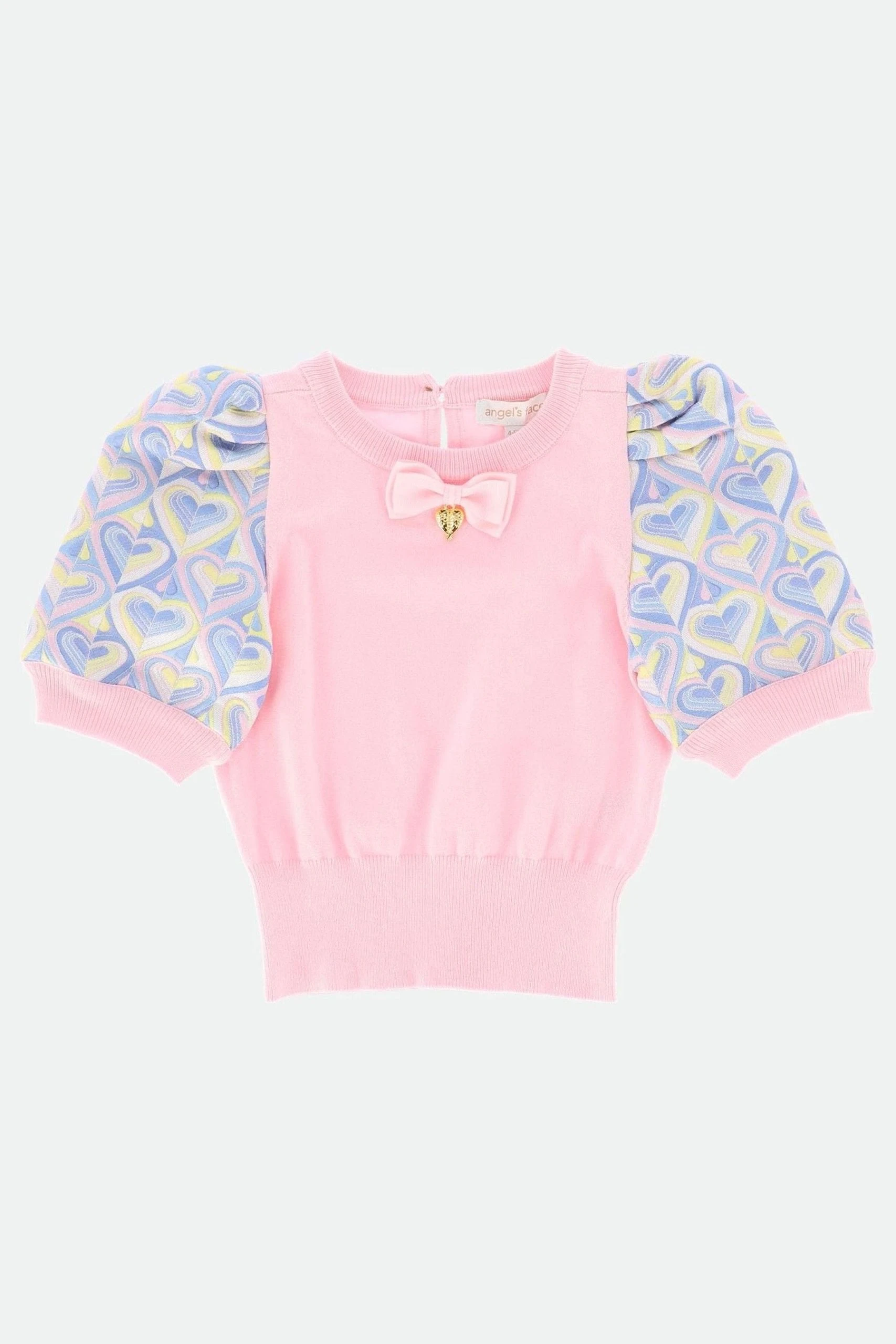 Short sleeve fine knit with jumper for girls in pink. Detailed with gorgeous jacquard puffed sleeves and out signature bow and gold heart charm centre of the neckline. Top fastens at the back with a crystal button.