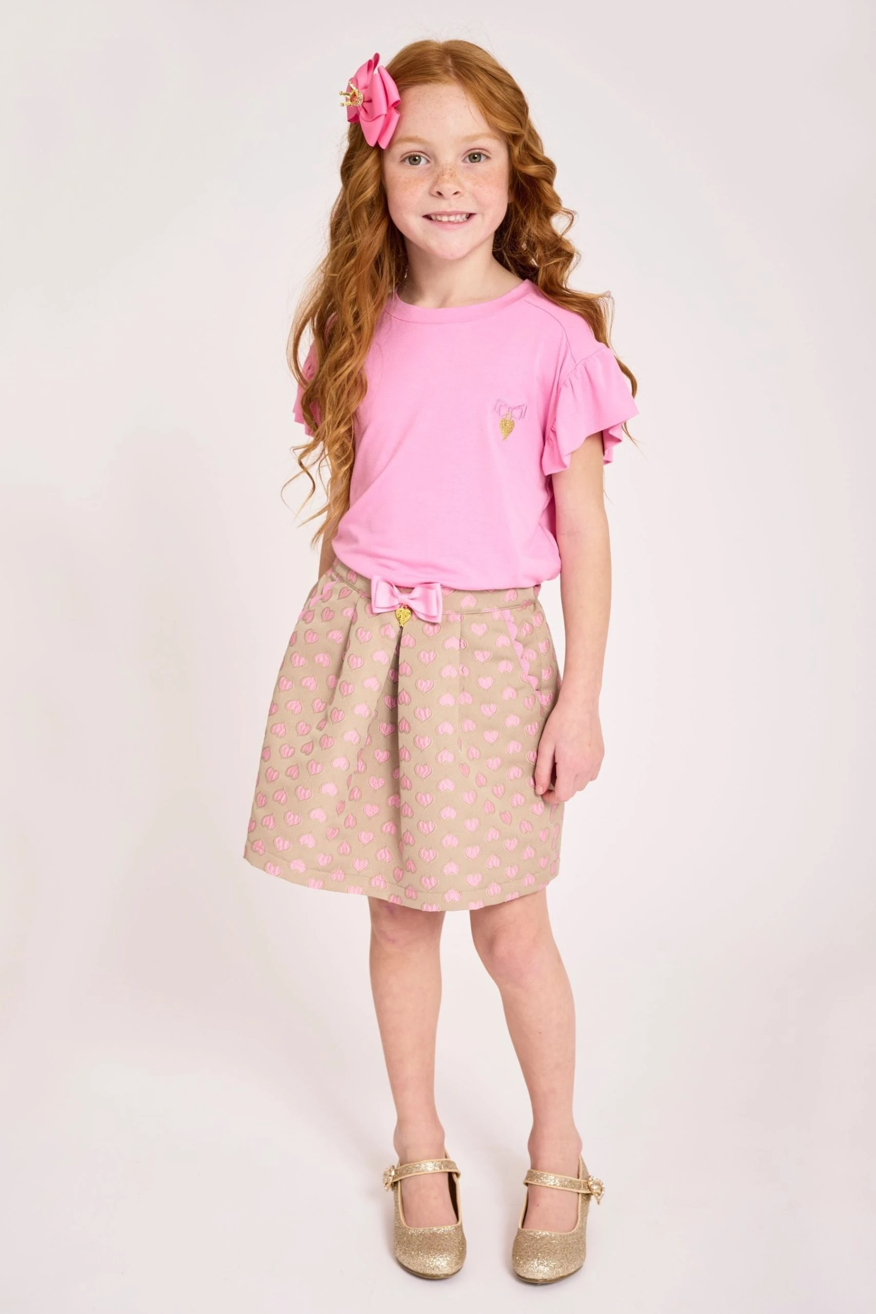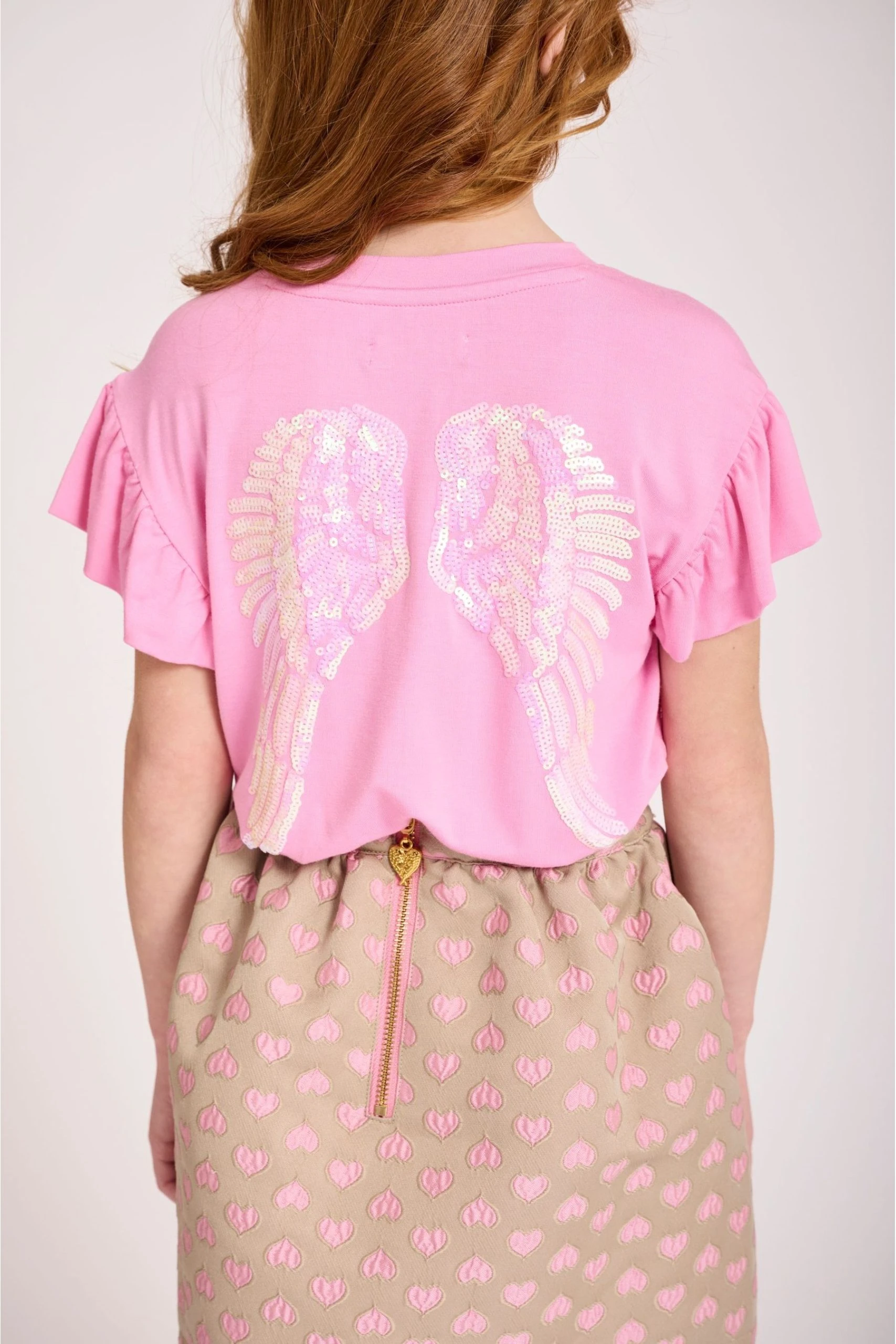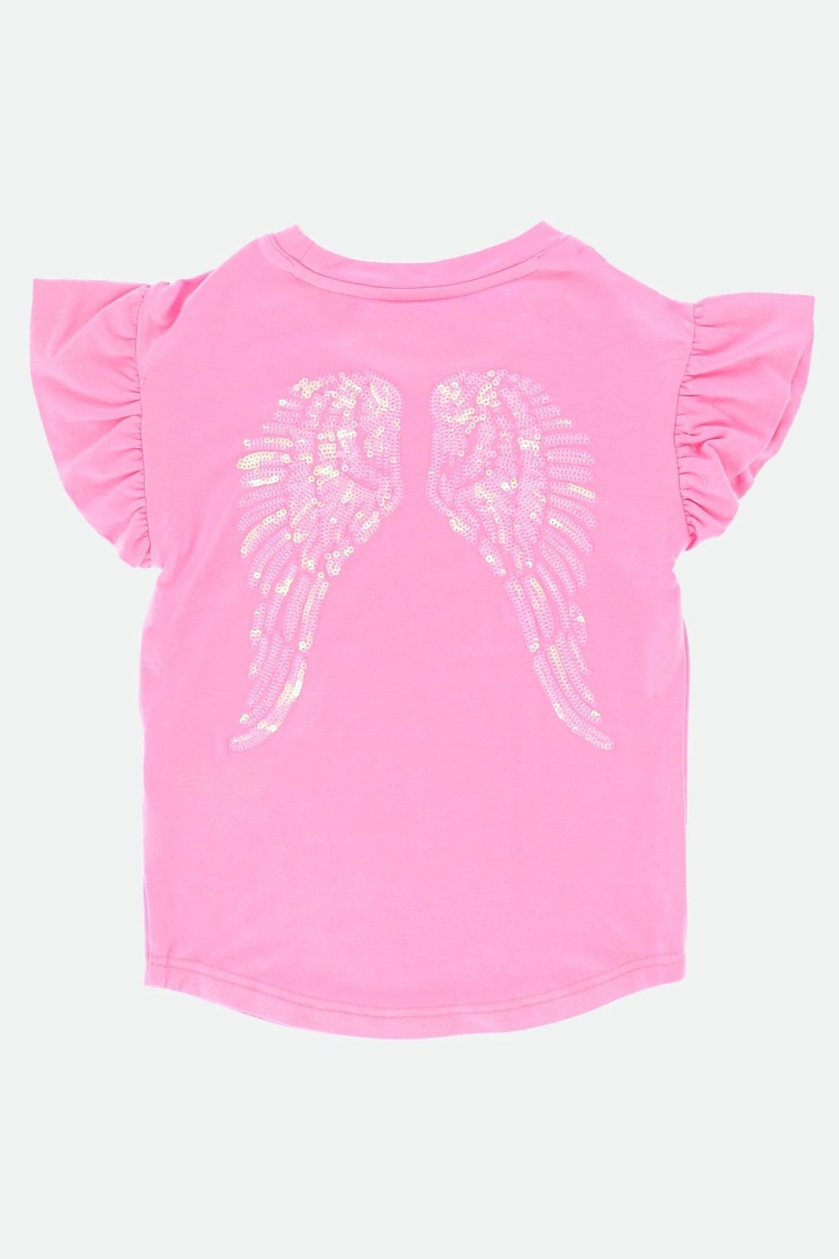 Luxuriously soft short sleeve summer t-shirt for girls in pink. Detailed with iconic Angel’s Face sparkling sequin wings on the back. T-shirt features stylish ruffle sleeves, complete with our signature bow and gold heart charm embroidered on the front.