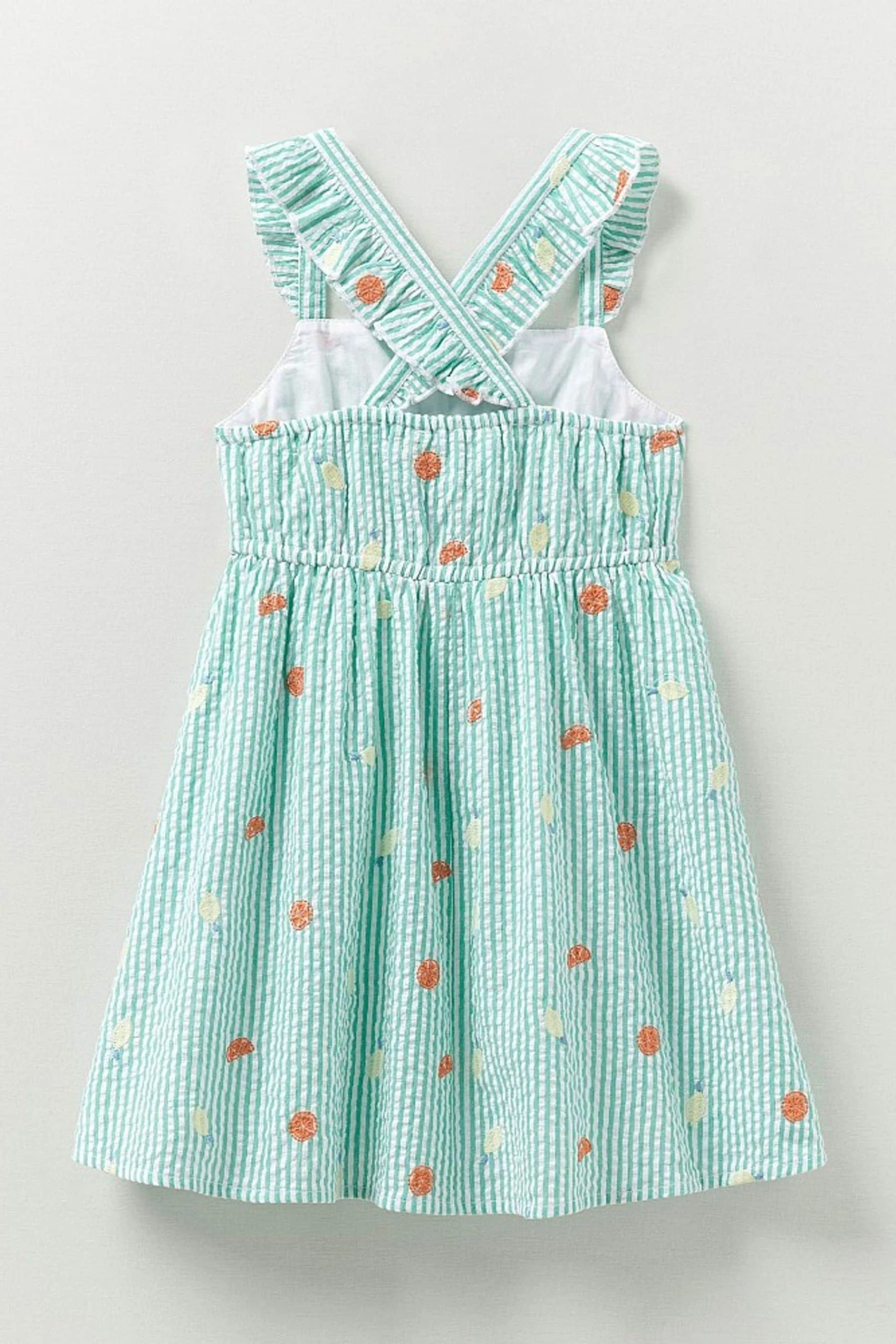A green and white striped dress. Crafted in seersucker and dotted with fruity embroidery, this is the perfect summer dress. The frilly cross-over sleeves add that extra touch.. 100% cotton. Embroidery thread: 100% polyester. Machine wash.