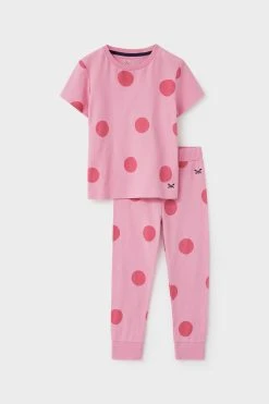 A short sleeve pink pyjama set. In an oversized spot print, this two-piece has been made with a stretchy waistband for comfort. Tuck them into bed in style. Crossed oars embroidered at the hem and waist.