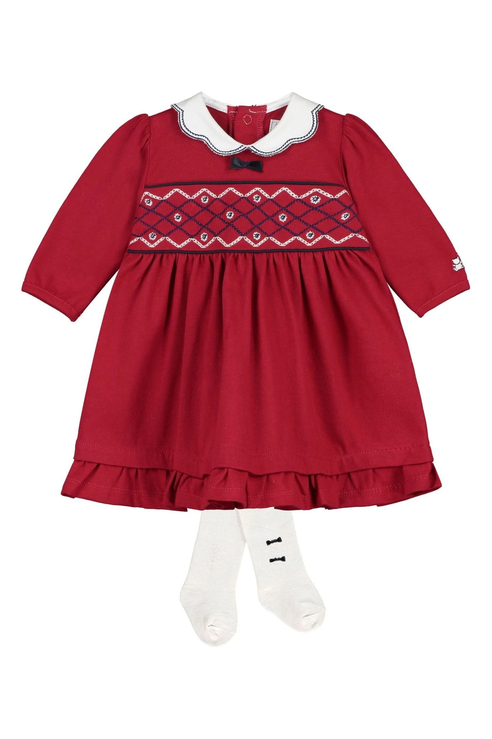 Perfect for a festive party, this party dress complements their other red styles. A contrasting embroidered chest panel in blue and white, feminine white scallop collar and little navy satin bow, make this a very striking dress. The full skirt has a frilled bottom and contrasting white tights with blue satin bows bring everything together!