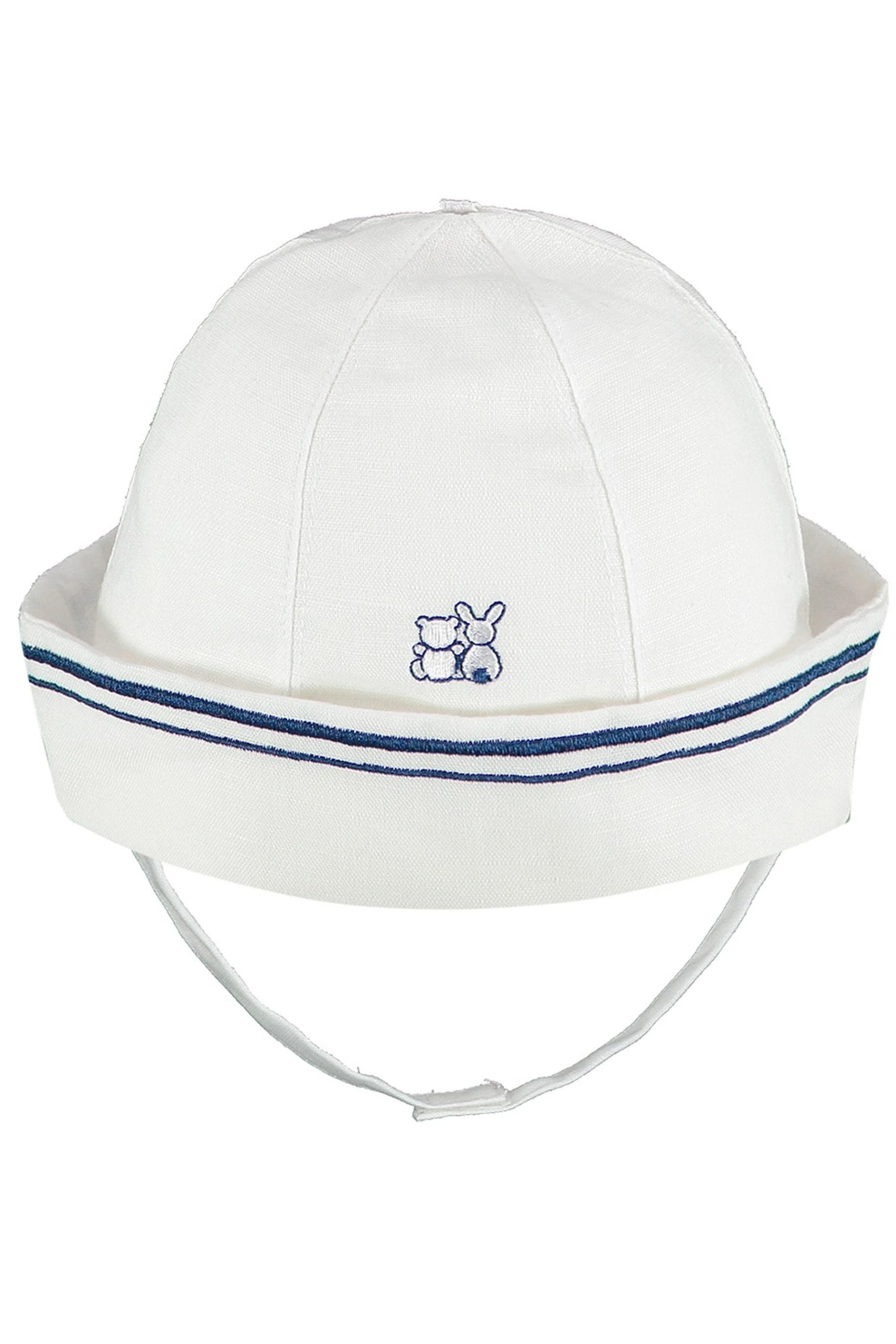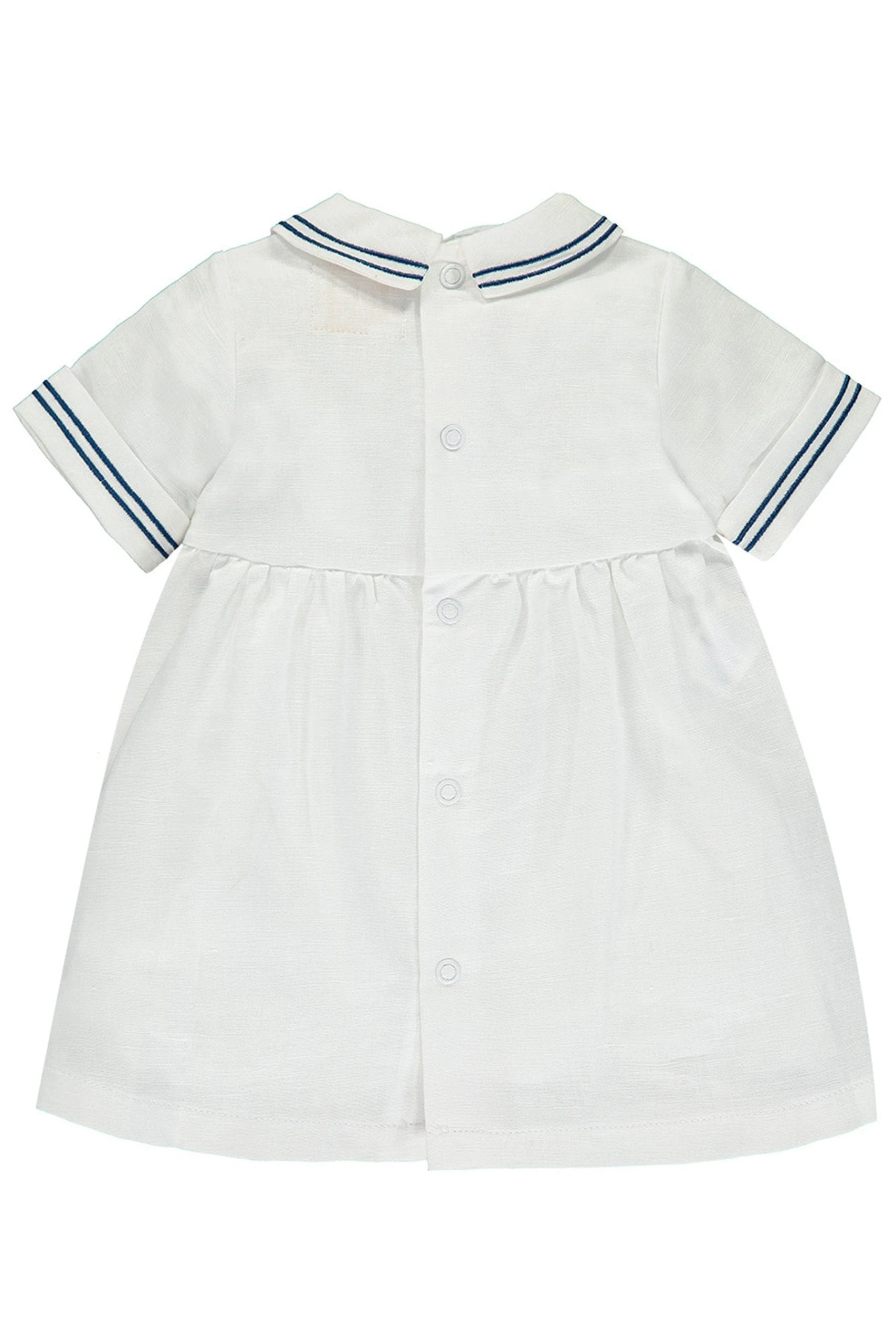 This is a modern take on a traditional baby girl’s sailor dress, in white linen embroidered with navy. The smart collar is trimmed with an embroidered topstitch, which ties in with the hem and sleeve cuffs. Pretty pleats sit along the bottom of Shelley, the centre pleat trails up to the collar, and six mock pearlised buttons sit just below. This lovely dress comes with pants and a navy and white sailor hat, with a velcro-fastened chin strap.