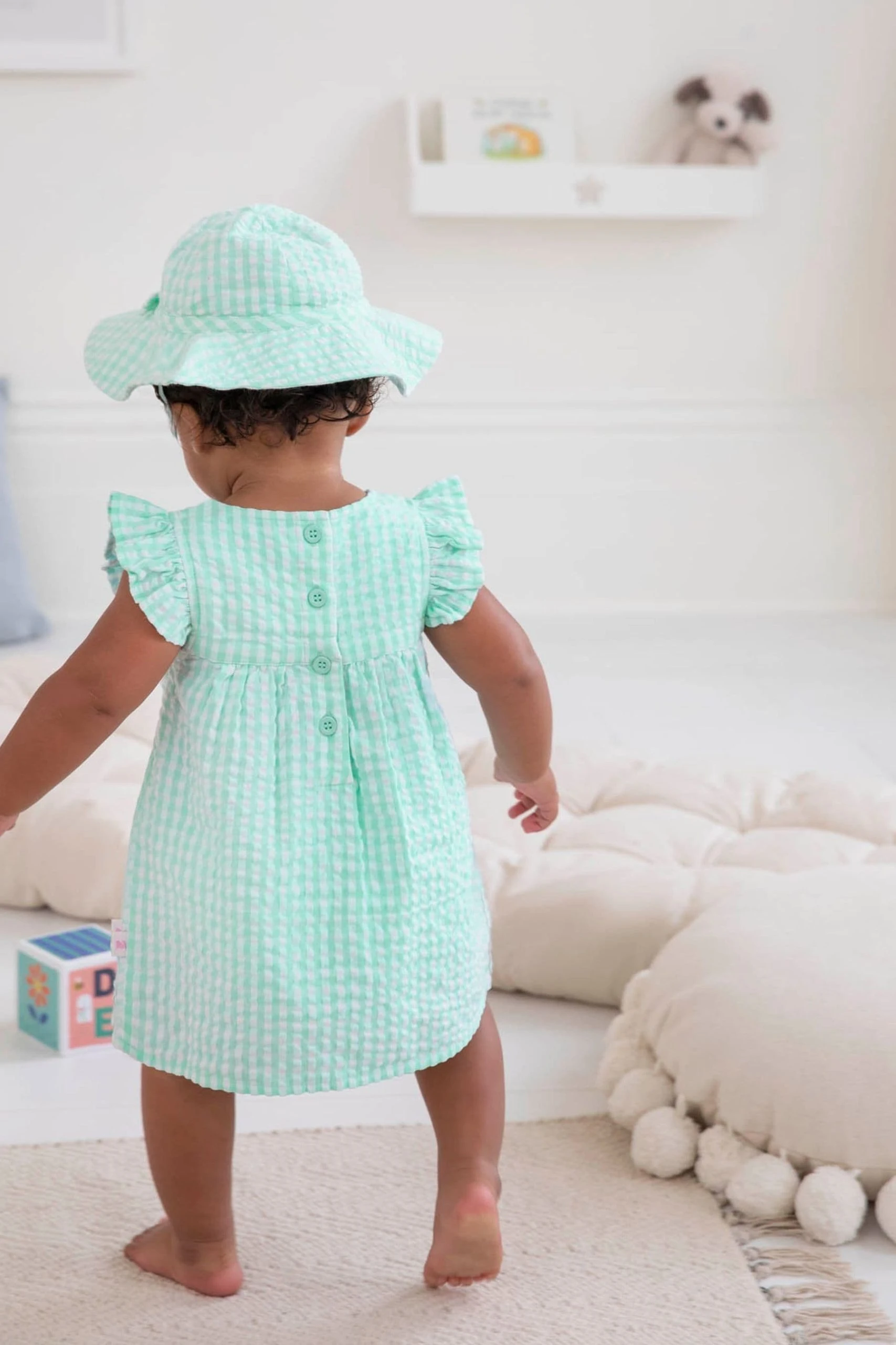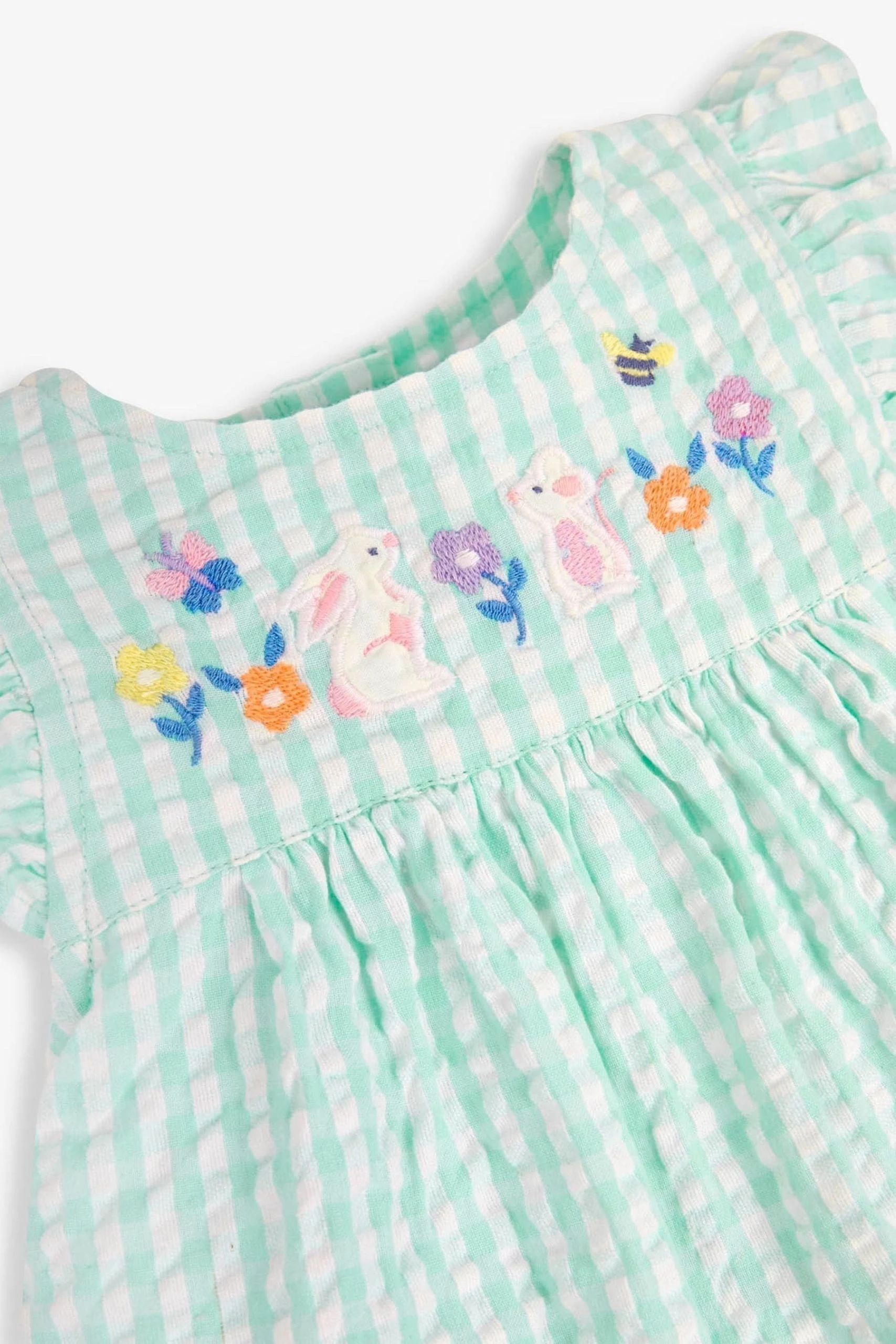 Summery floral embroidery and sweet frills make this dress perfect for your baby. You’ll love this 3-Piece Green Gingham Bunny Embroidered Dress With Knickers & Floppy Hat Set if the weather is hot and you’re attending a special event – it even comes with a matching hat and knickers. Classic gingham. Bunny appliqué. Frill sleeves. Round neck. Popper back opening for easy dressing. Co-ordinating knickers to use as a nappy cover. Co-ordinating hat.