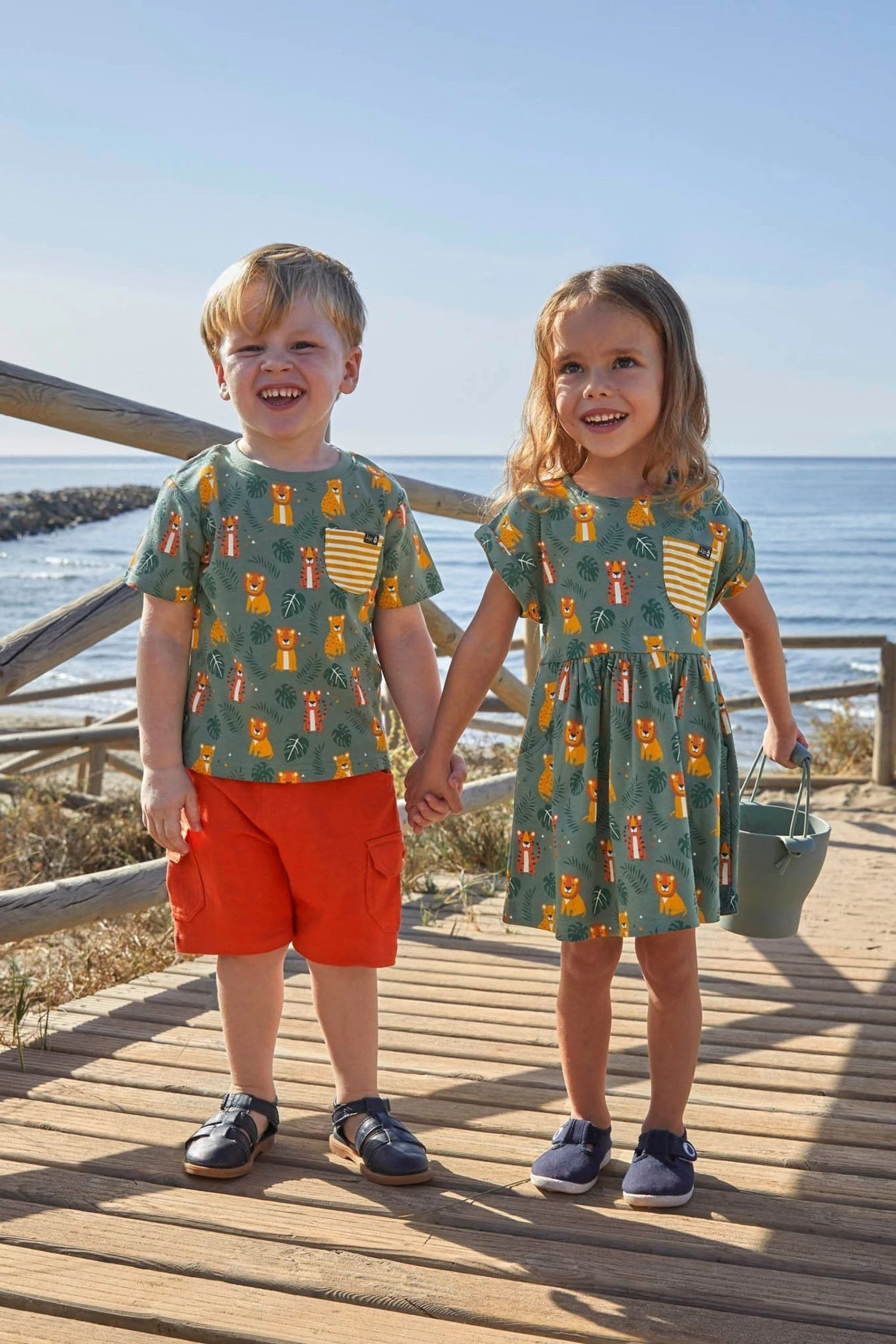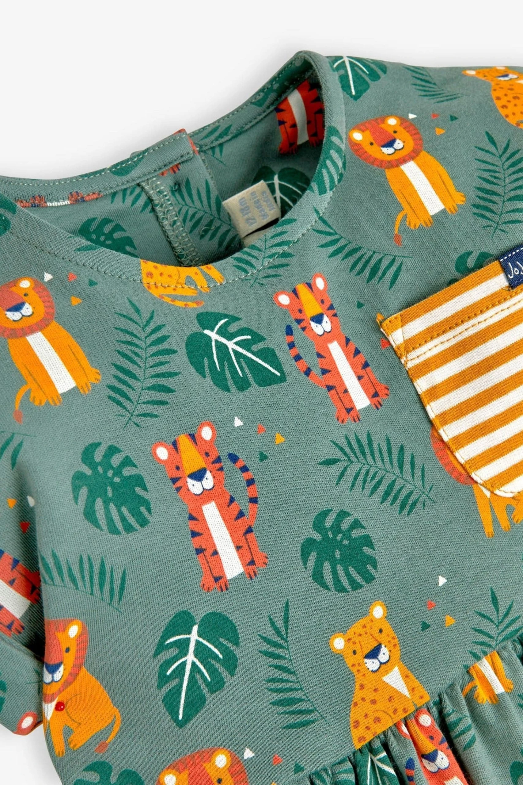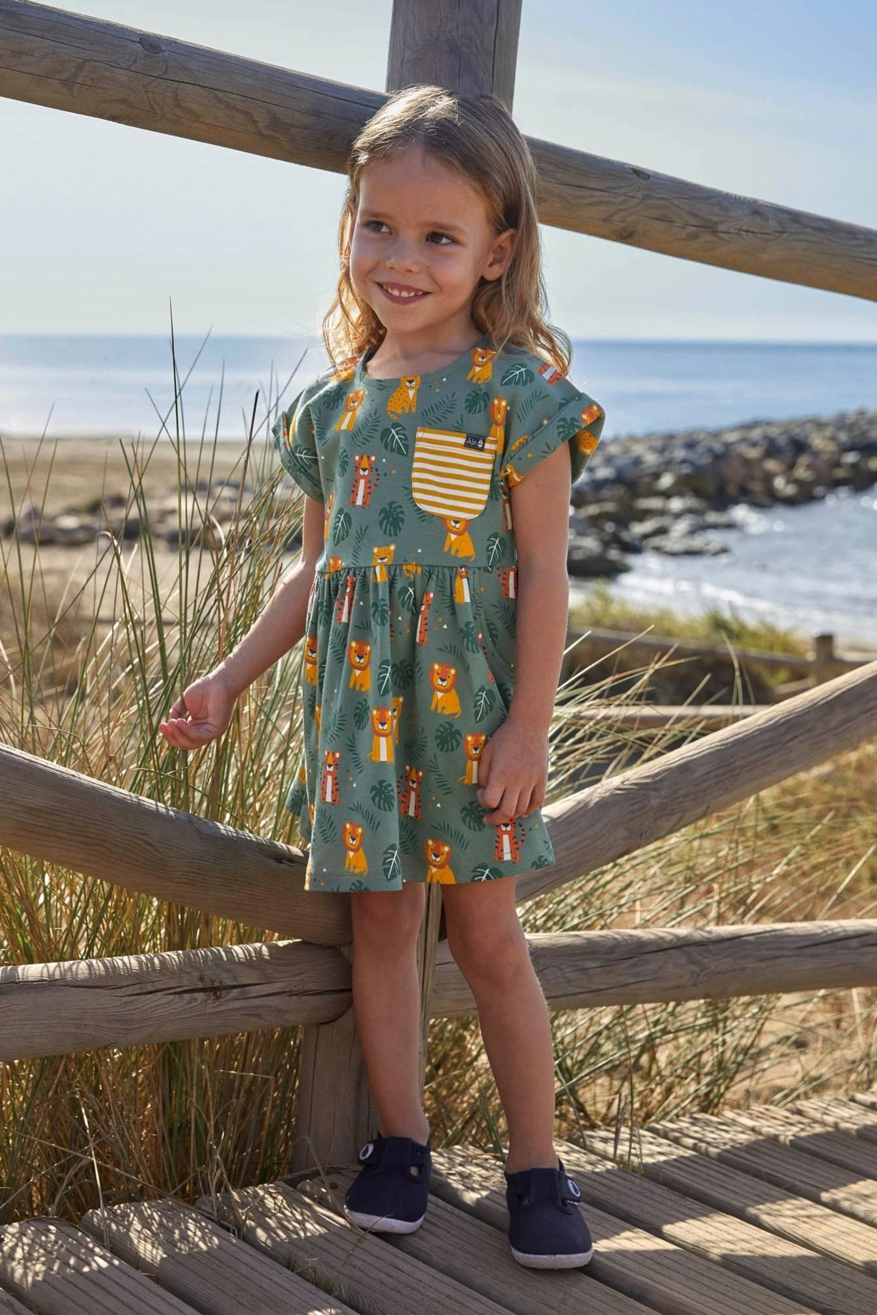 A smart casual look is easy to achieve with this Khaki Big Cats Print Drop Shoulder Dress. Featuring a colourful lion and tiger print, tropical leaves, and a contrast striped pocket, this dress is sure to make their day. Available in soft and comfortable cotton, it is the perfect summer dress for kids. All-over big cat print. Pocket to front. Round neck. Gathers at the waist. Button back opening for easy dressing.