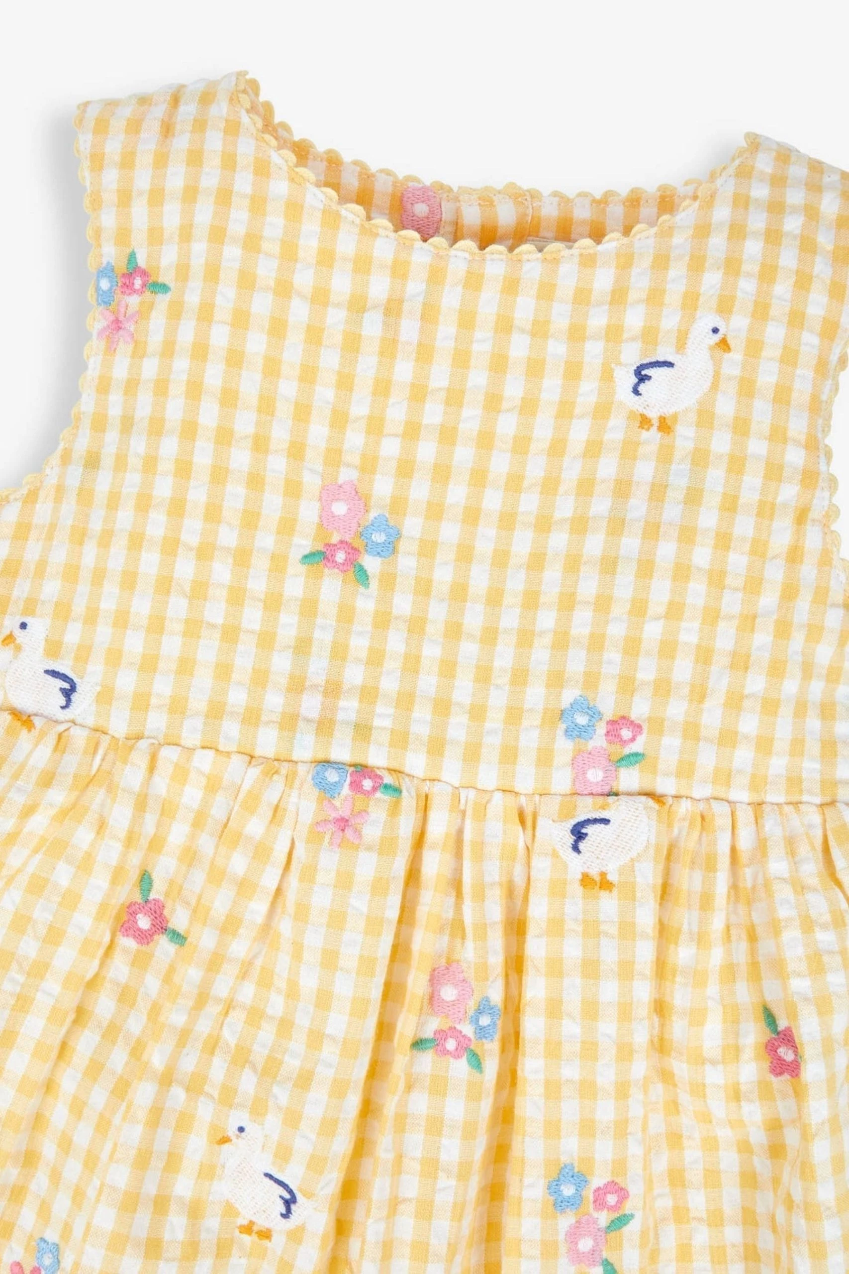 Our Yellow Gingham Duck Floral Embroidered Dress is the perfect summer dress, with classic gingham in a muted yellow tone, and sweet duck and floral embroidery to make it special. Simply pair it with sandals for the perfect summer look. Classic gingham Duck & floral embroidery. Round neck. Popper back opening for easy dressing.
