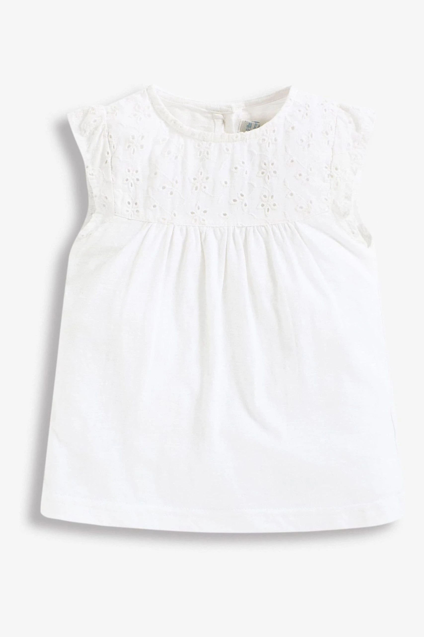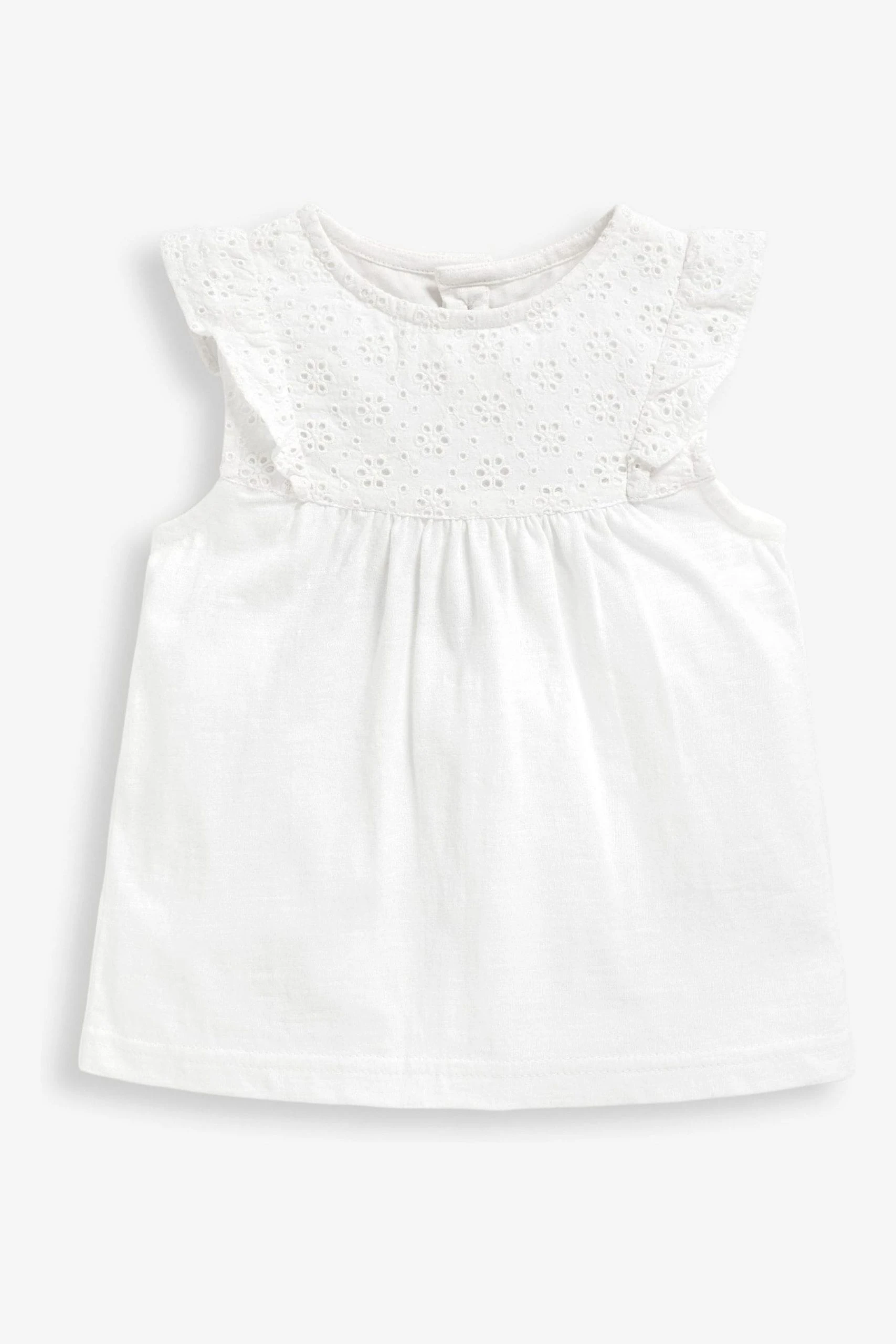 Cool and crisp cotton is a must for every wardrobe, especially for warmer days or holidays abroad. The Pretty Embroidered Top offers a sweet, smart and comfortable look that can be teamed with skirts or leggings for an effortlessly adorable outfit. Pretty broderie anglaise detailing on the chest and ruffles. Ruffle shoulders. Round neck. Popper back opening for easy dressing.