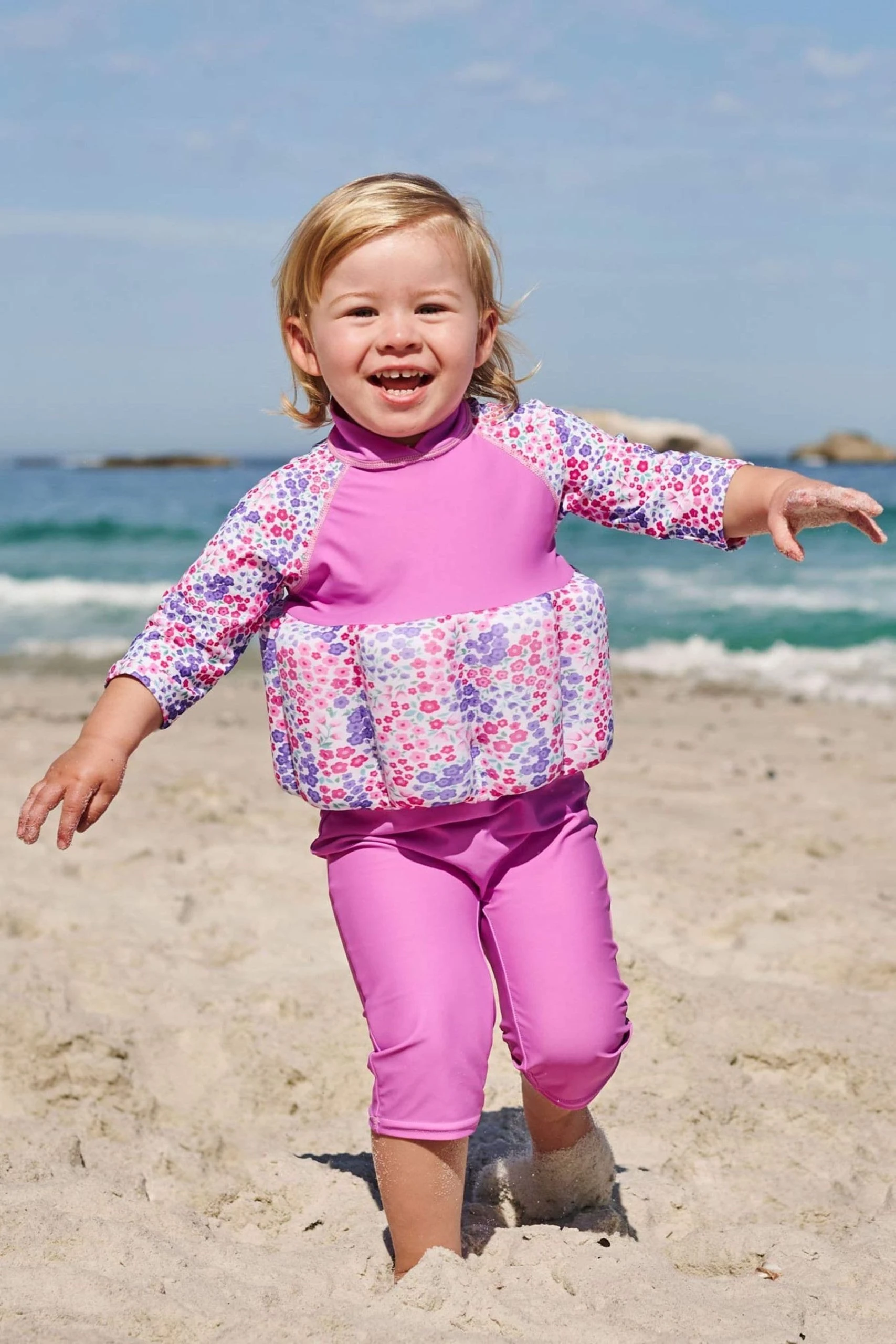 The Floral Print Sun Protection Float Suit is designed to help protect your child from harmful UV rays at outdoor pools and on beaches, while also supporting them in the water as they learn to swim. The floats are arranged to hold your child in the correct position, helping them gain confidence in the water. Ocean print. UPF 50+ (98% effective at blocking UVA rays). Back zip opening for easy changing. Floats for buoyancy. Promotes natural learning to swim position. 82% Polyamide, 18% Elastane. Use a delicate setting. Do not tumble dry. Do not iron. Do not dry clean.