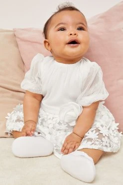 A cute 2in1 occasion dress from Lipsy baby range, featuring a sequin embroidered skirt, a mesh bodice with puff sleeves and a pretty corsage at waist. Perfect for Flower girl or Bridesmaid!