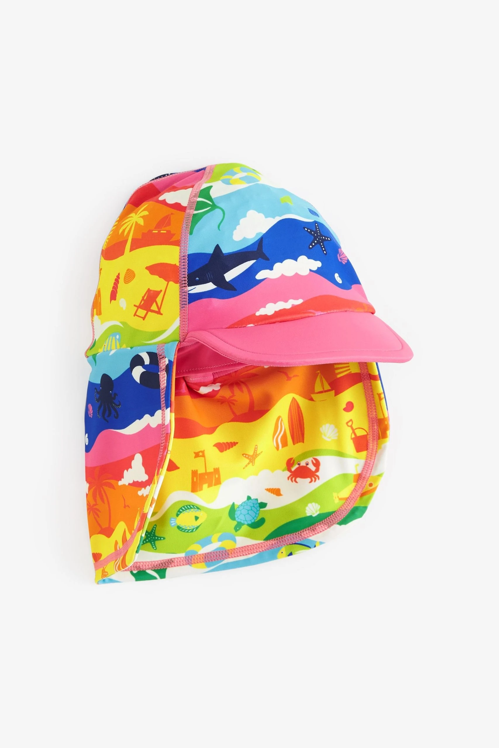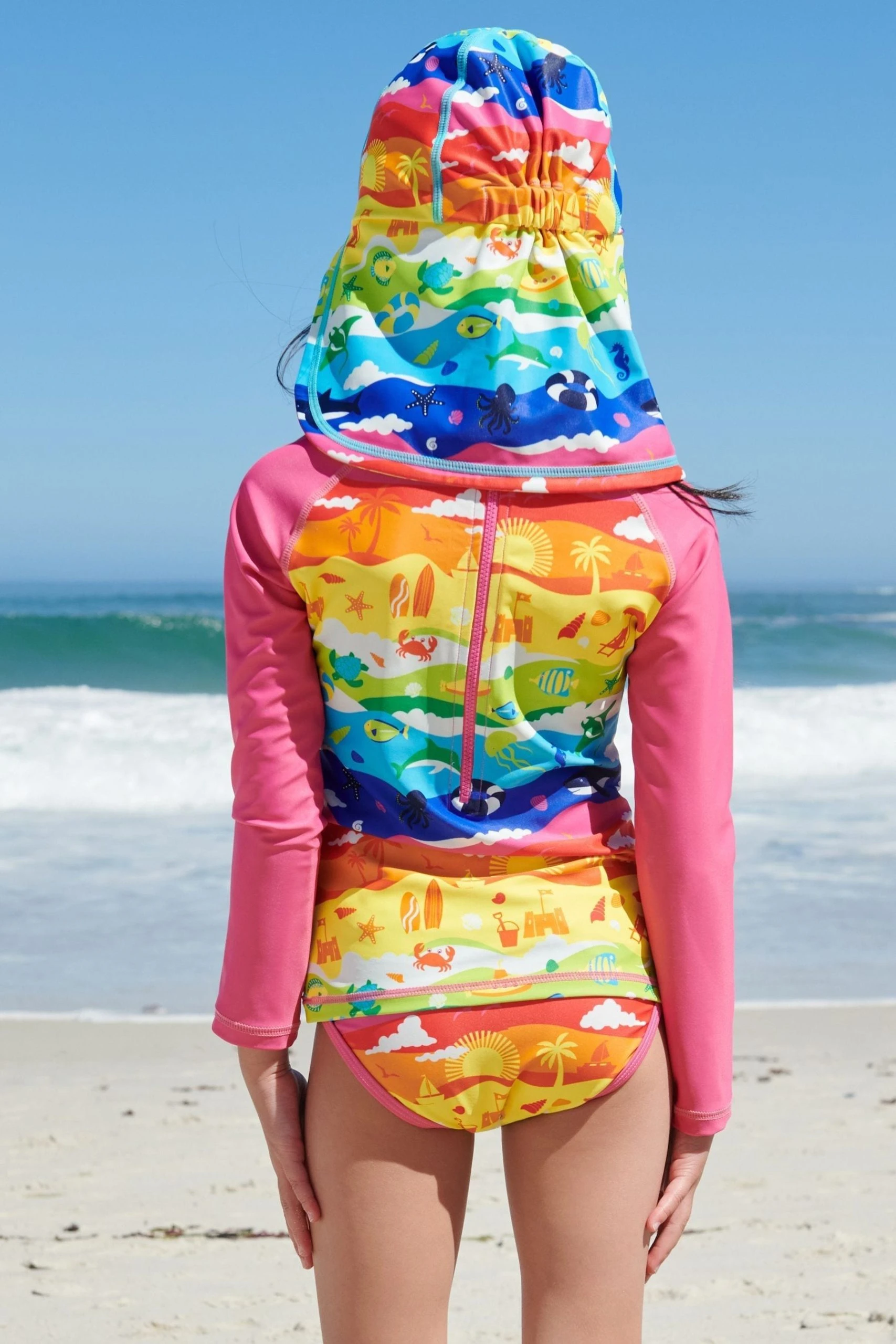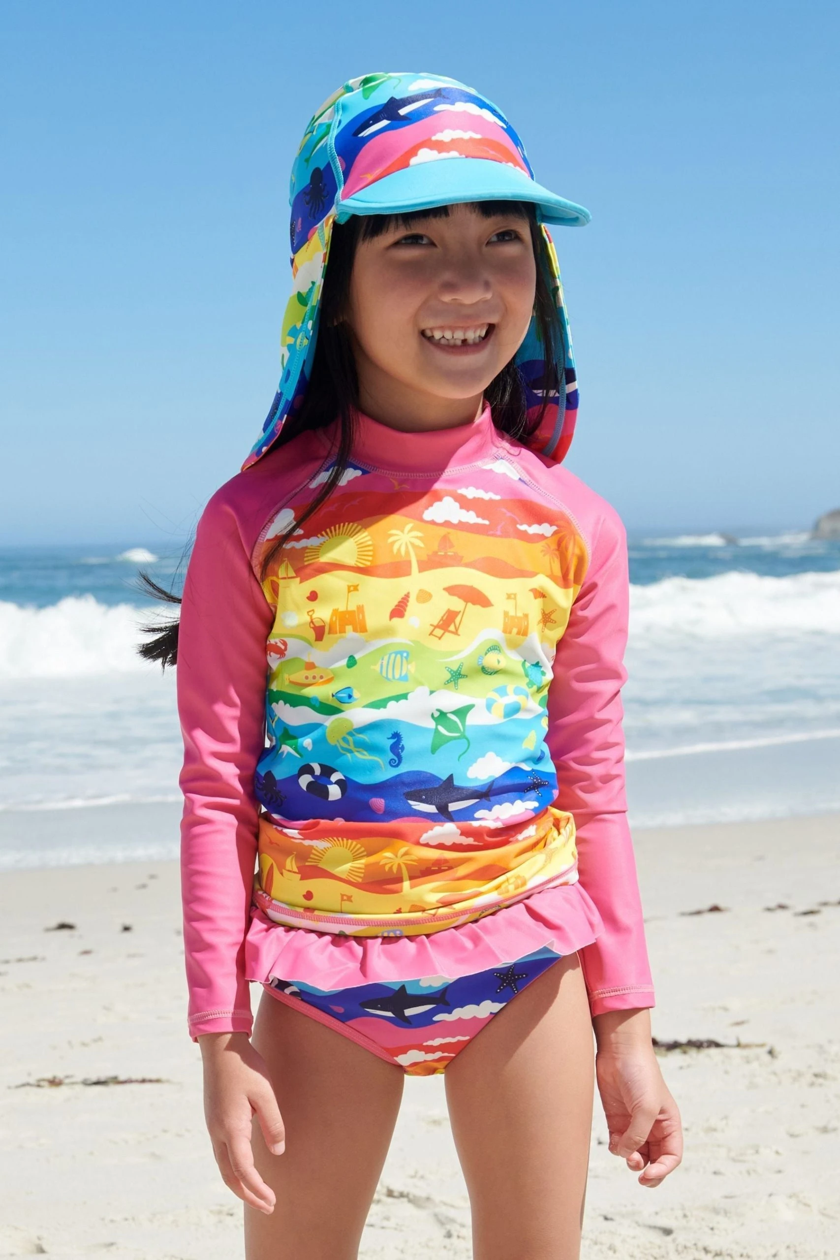 This brightly coloured swim set from Little Bird by Jools Oliver is perfect for fun pool and beach days. With a long sleeve rash vest in a fun and colourful print with pink sleeves and an easy zip fastening down the back, matching bikini bottoms with a cute frilled edge and a sun-safe hat with a peak and neck flap for added protection from the sun.