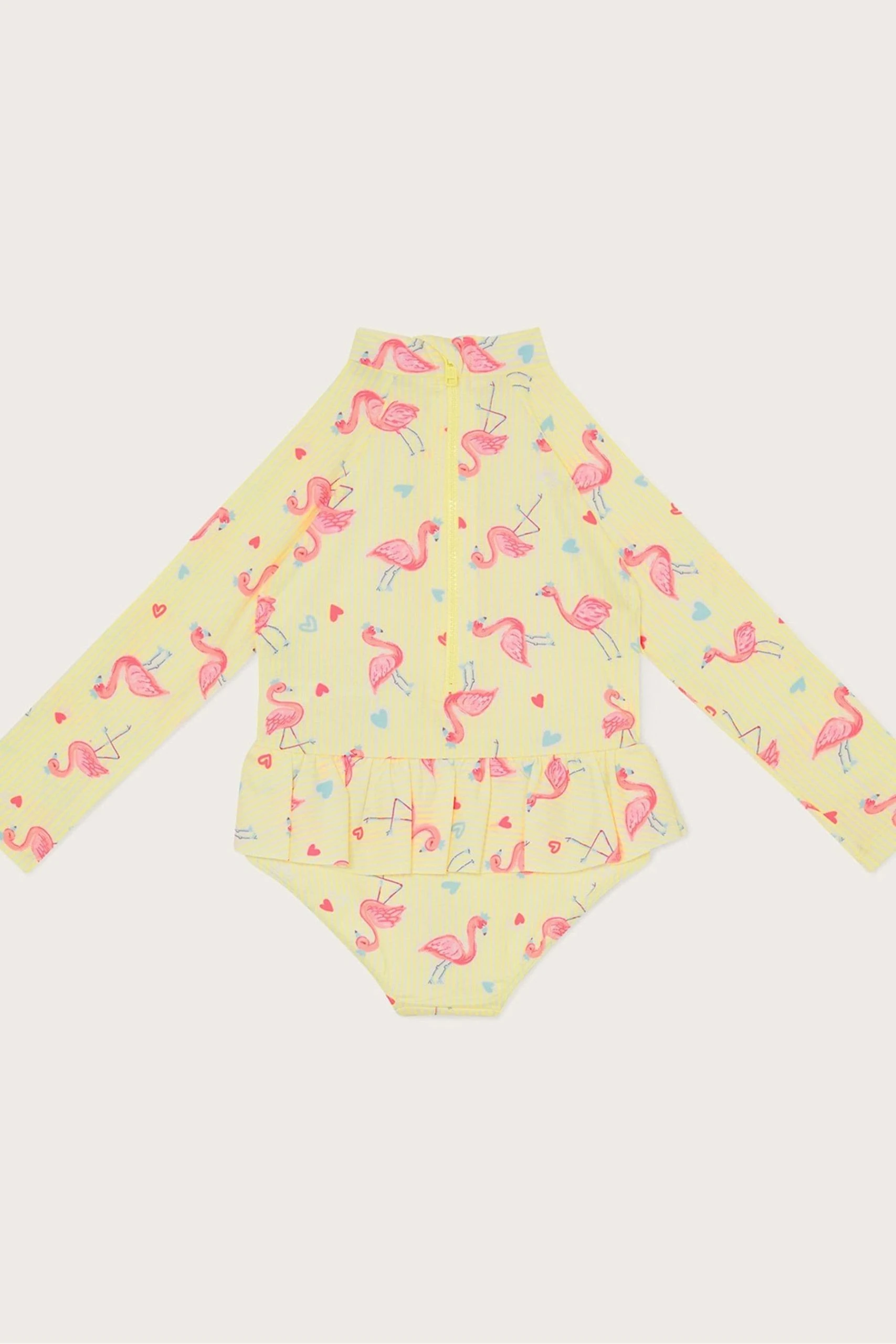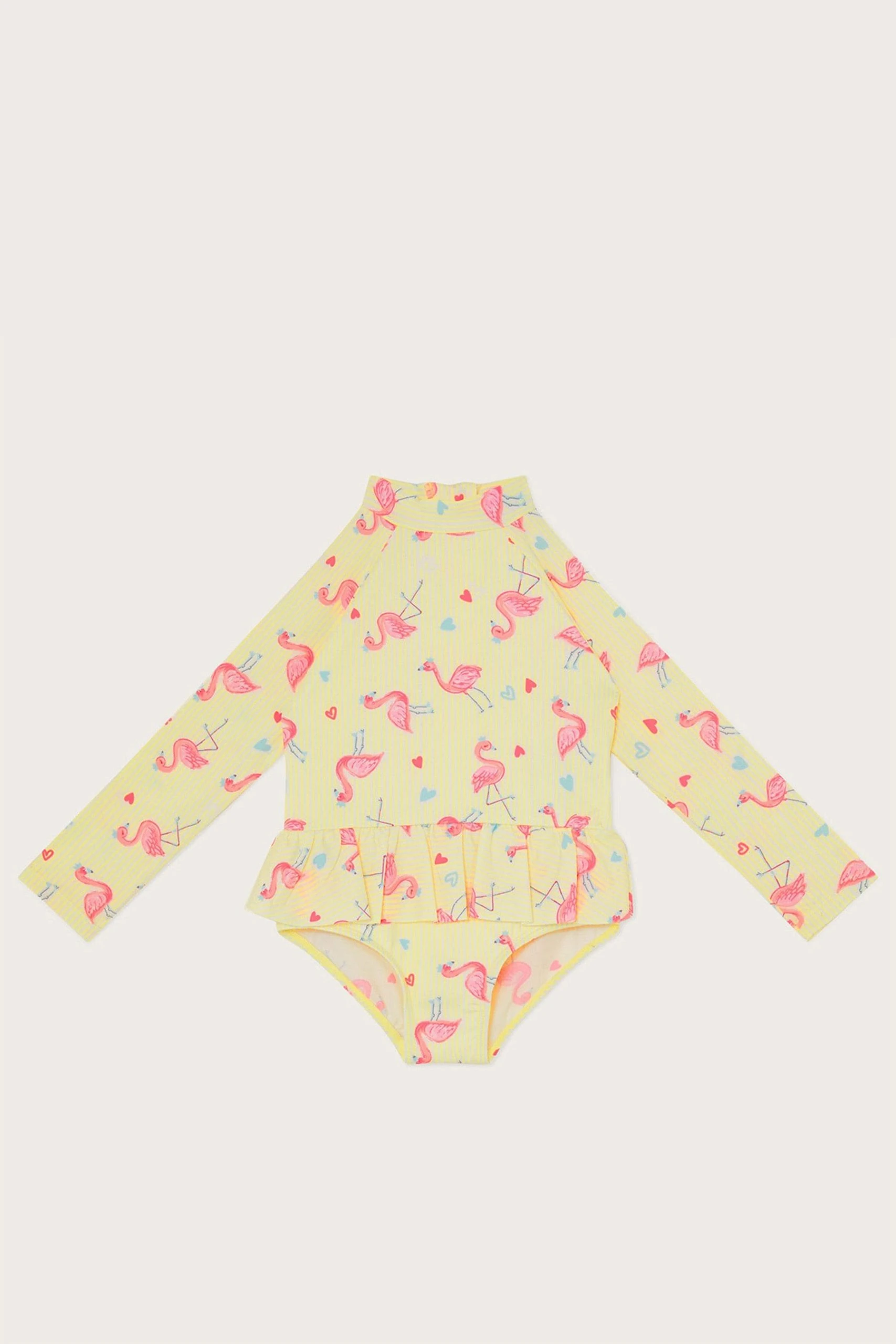 A pretty and protective piece for their first paddle in the sea, this swimsuit features a flamingo print, a ruffle skirt, and long sleeves that’ll keep little ones covered under the summer sun. This piece provides protection against ultraviolet solar radiation. It has been independently tested and achieved a UPF rating of 50+. Just one of our steps towards a future for sustainable fashion, we introduce S.E.W: our commitment to using more eco-conscious materials in our ranges. This capsule collection is created using fabrics that are both kinder to the planet and have a reduced environmental impact. You’ll see blends of organic and better-sourced cotton, viscose from more responsibly grown forests and recycled polyesters made from post-consumer waste.