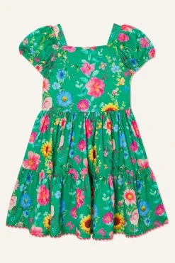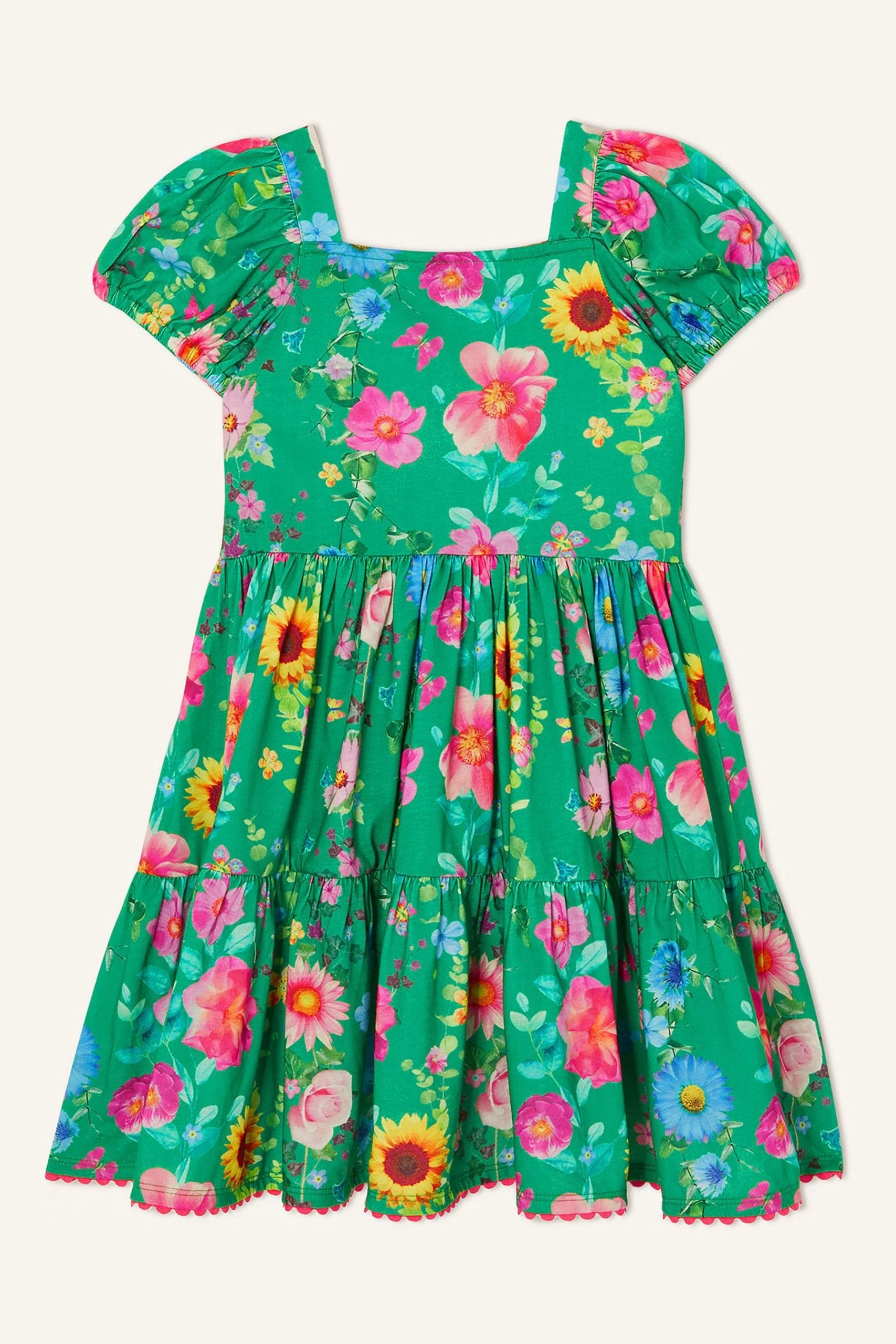 Spring into daytime fun in this dress, featuring a grassy green backdrop topped with a cheerful floral print. Designed in comfortable jersey fabric, the preppy silhouette combines puff sleeves with a tiered and pleated skirt. Finished with a square neckline and a scallop trim, little ones can simply slide on their comfiest plimsolls to complete the look. Just one of our steps towards a future for sustainable fashion, we introduce S.E.W: our commitment to using more eco-conscious materials in our ranges. This capsule collection is created using fabrics that are both kinder to the planet and have a reduced environmental impact. You’ll see blends of organic and better-sourced cotton, viscose from more responsibly grown forests and recycled polyesters made from post-consumer waste.