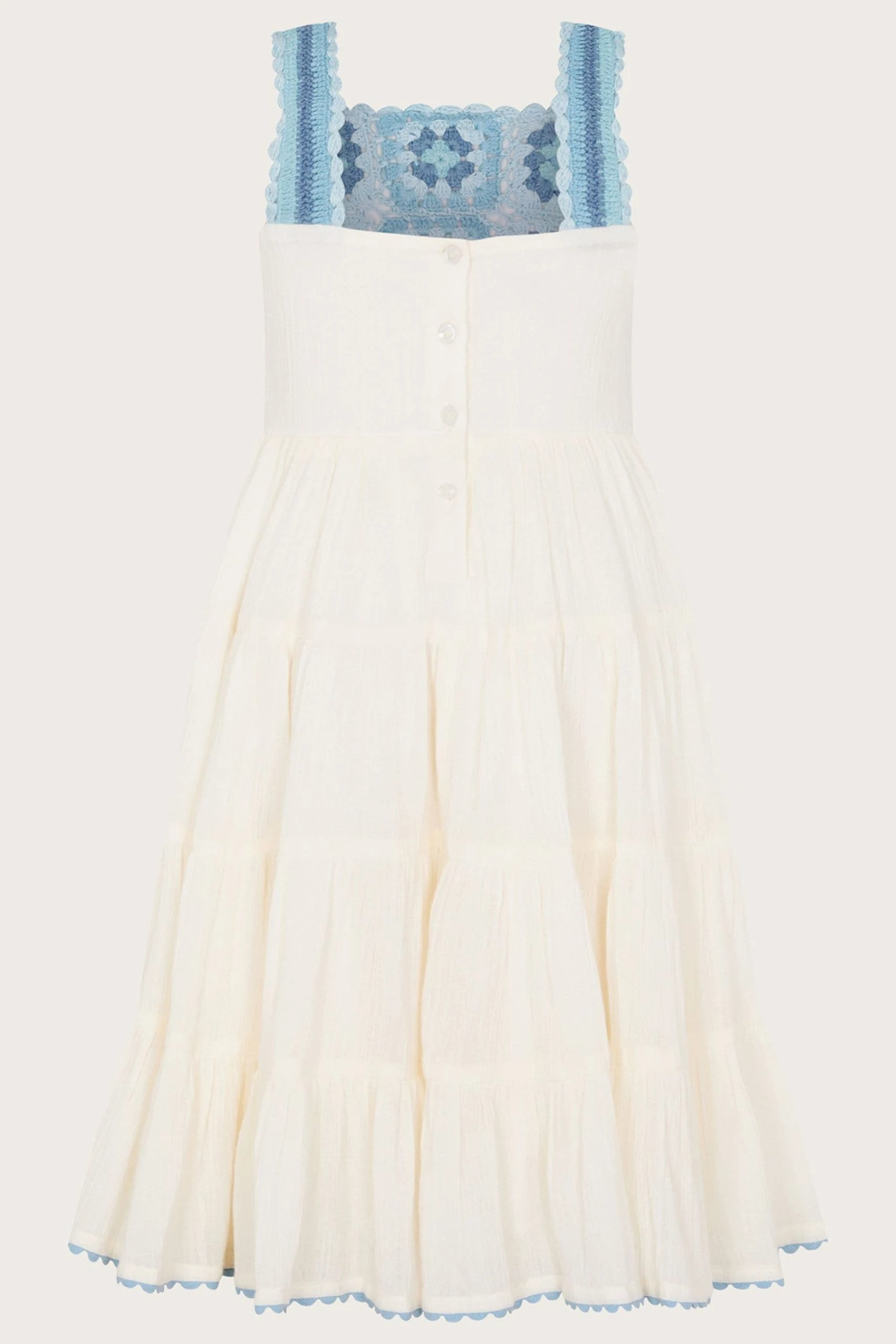 Crochet and the beach? The perfect combination. Ideal for coastal dinners with the family, this maxi dress features a flowing skirt, with an oceanic blue crochet bodice. As part of the journey to make our clothes kinder to the world around us, this item was made using more sustainable raw materials, such as organic cotton, recycled polyester and viscose from responsibly grown forests.