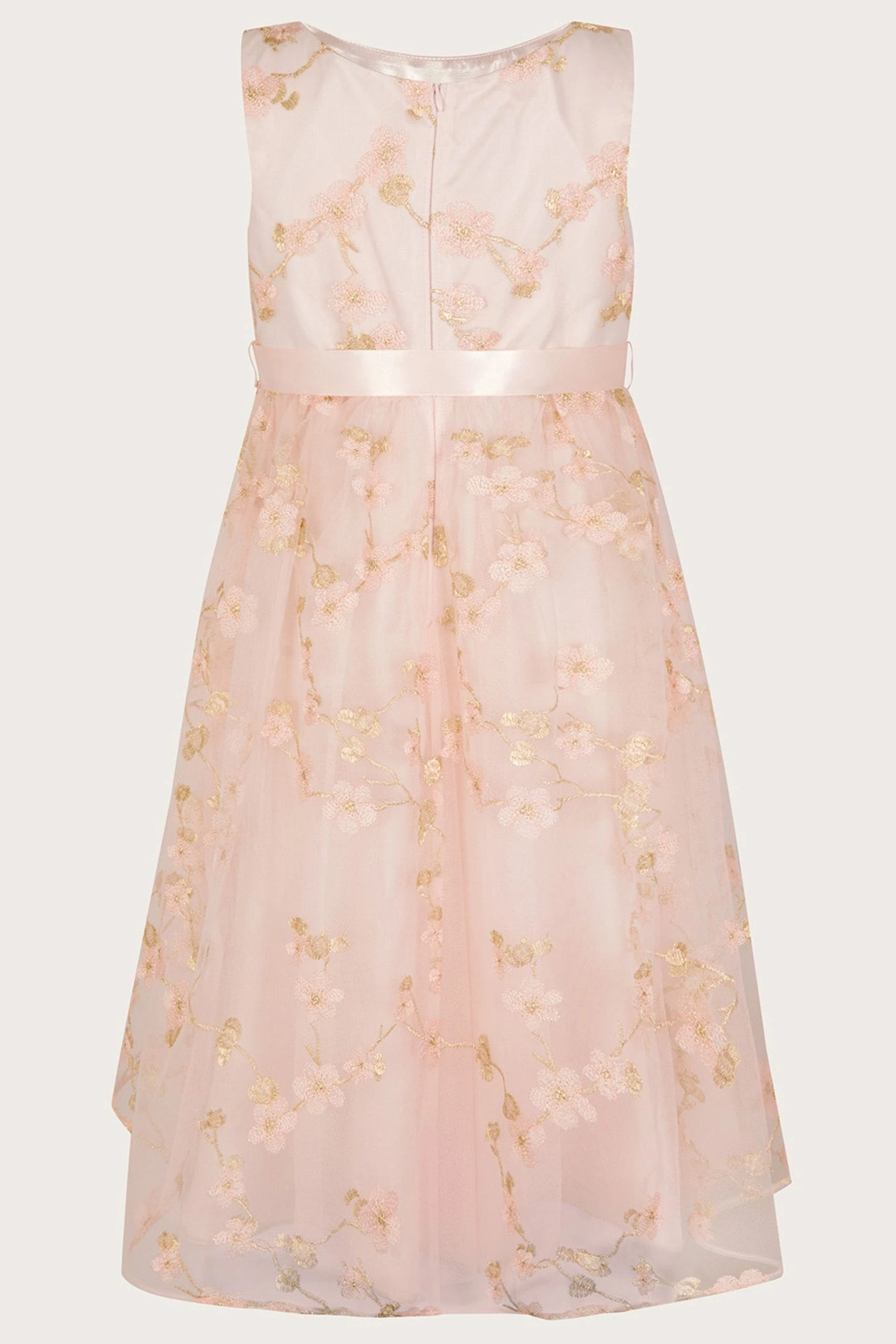 Blooming with beautiful embroidered florals, this dress is ideal for upcoming spring parties. The sleeveless bodice allows plenty of room for playtime with other little partygoers, whilst the dipped hemline adds space to show off their party shoes.