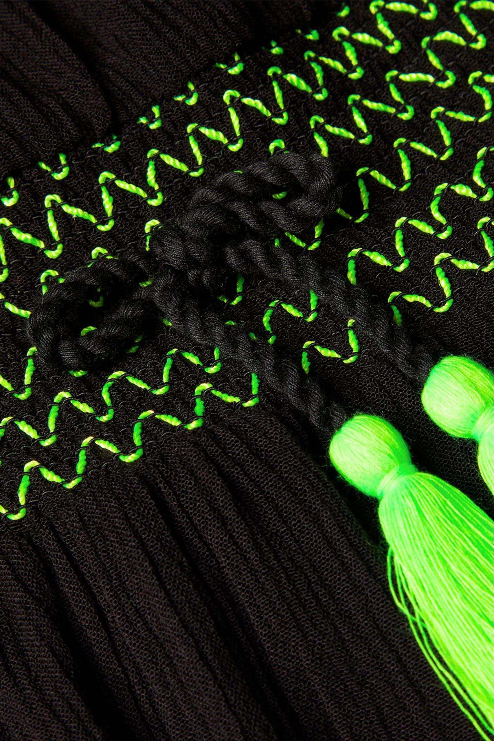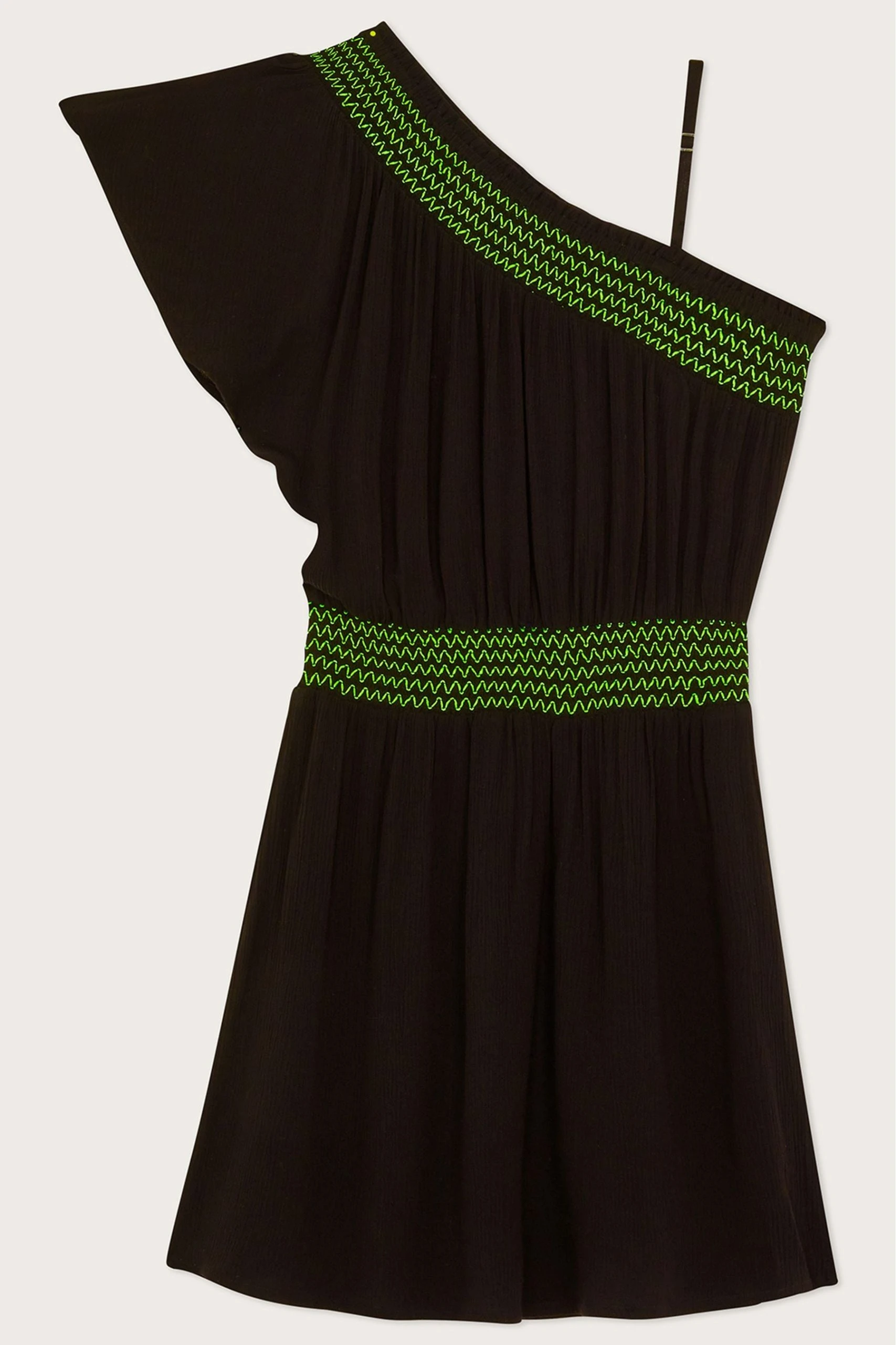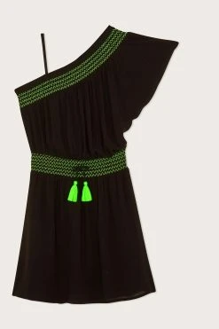 With a striking neon stitching that pops against the black backdrop, this summer staple is perfect for playing on the beach. It features an asymmetrical one-shoulder design with a contrasting tassel on the shirred waist for those fun summer vibes.