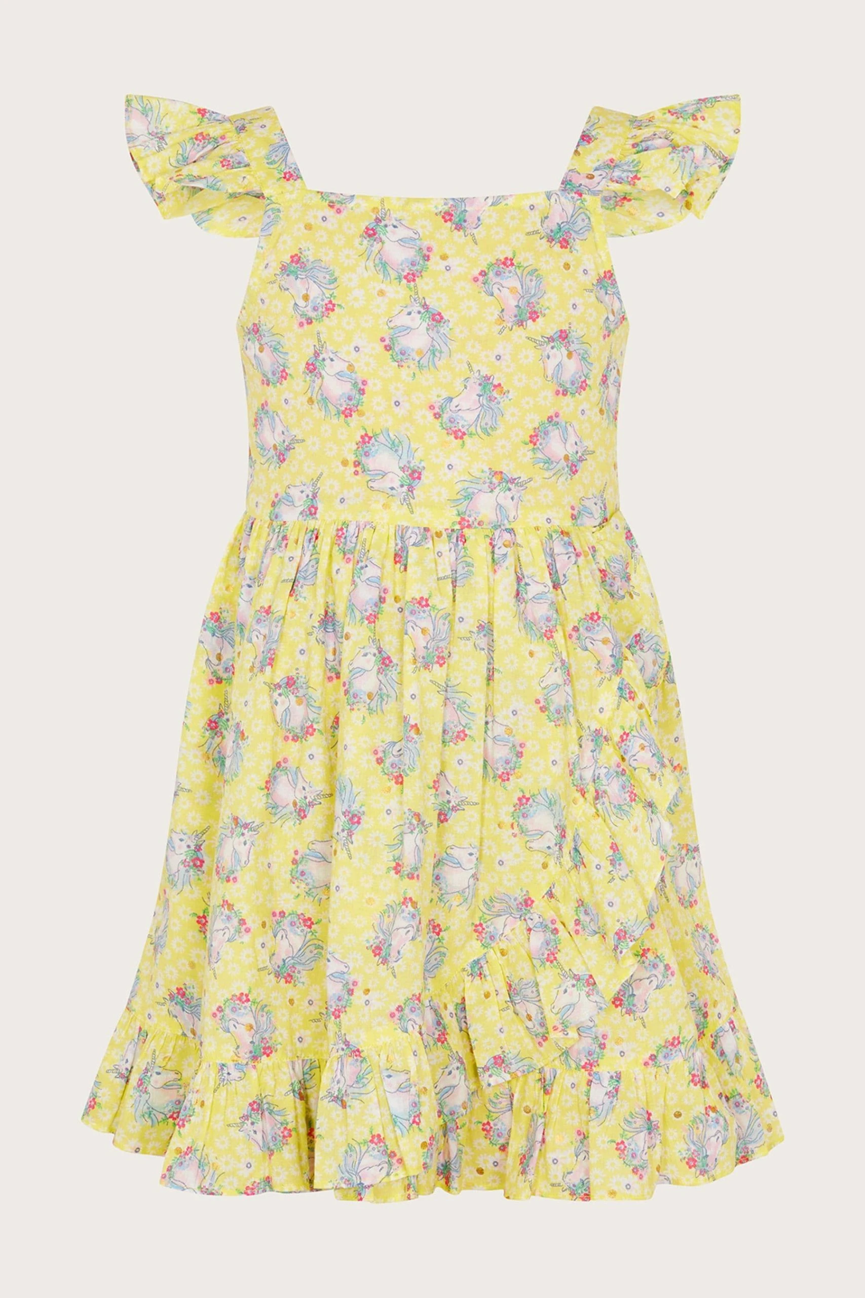 Only seen in their dreams, this dress showcases an enchanting print of unicorns and ditsy flowers over a lemon backdrop. The profile includes flutter sleeves and a square neck, before falling into a wrap-style skirt that’s complete with a frill hem. Crafted in better-sourced cotton. As part of the journey to make our clothes kinder to the world around us, this item was made using more sustainable raw materials, such as organic cotton, recycled polyester and viscose from responsibly grown forests.