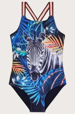 A zebra sits amongst tropical palm leaves on this swimsuit, perfect for their summer holidays. It’s crafted in stretchy swim fabric, with cross strap detailing to the back, keeping them secure on adventures around the waterpark. Just one of our steps towards a future for sustainable fashion, we introduce S.E.W: our commitment to using more eco-conscious materials in our ranges. This capsule collection is created using fabrics that are both kinder to the planet and have a reduced environmental impact. You’ll see blends of organic and better-sourced cotton, viscose from more responsibly grown forests and recycled polyesters made from post-consumer waste.