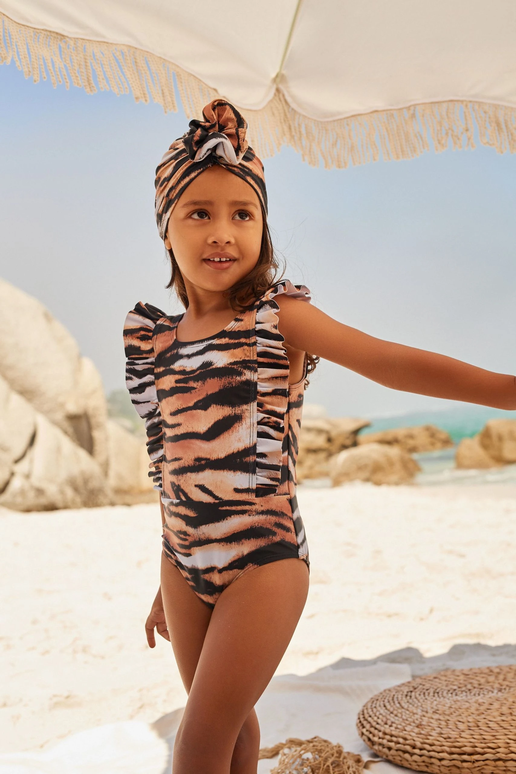 Your little lady will look fierce in our stylish swimsuit from Myleene Klass. Made from lightweight recycled polyester and covered in a striking animal print, the one piece also features ruffle trims down the front with a scooped back and it comes with a matching turban. This outfit is perfect for a day by the pool or on the beach.