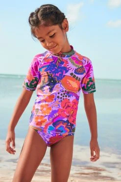 The set includes a swim top with high neck for added protection. Matching swim briefs are soft, stretchy and fully lined for comfort. Swim top has a zipper fastening to the back up to age 12-18 months, to allow easy dressing, and a cute peplum hem.