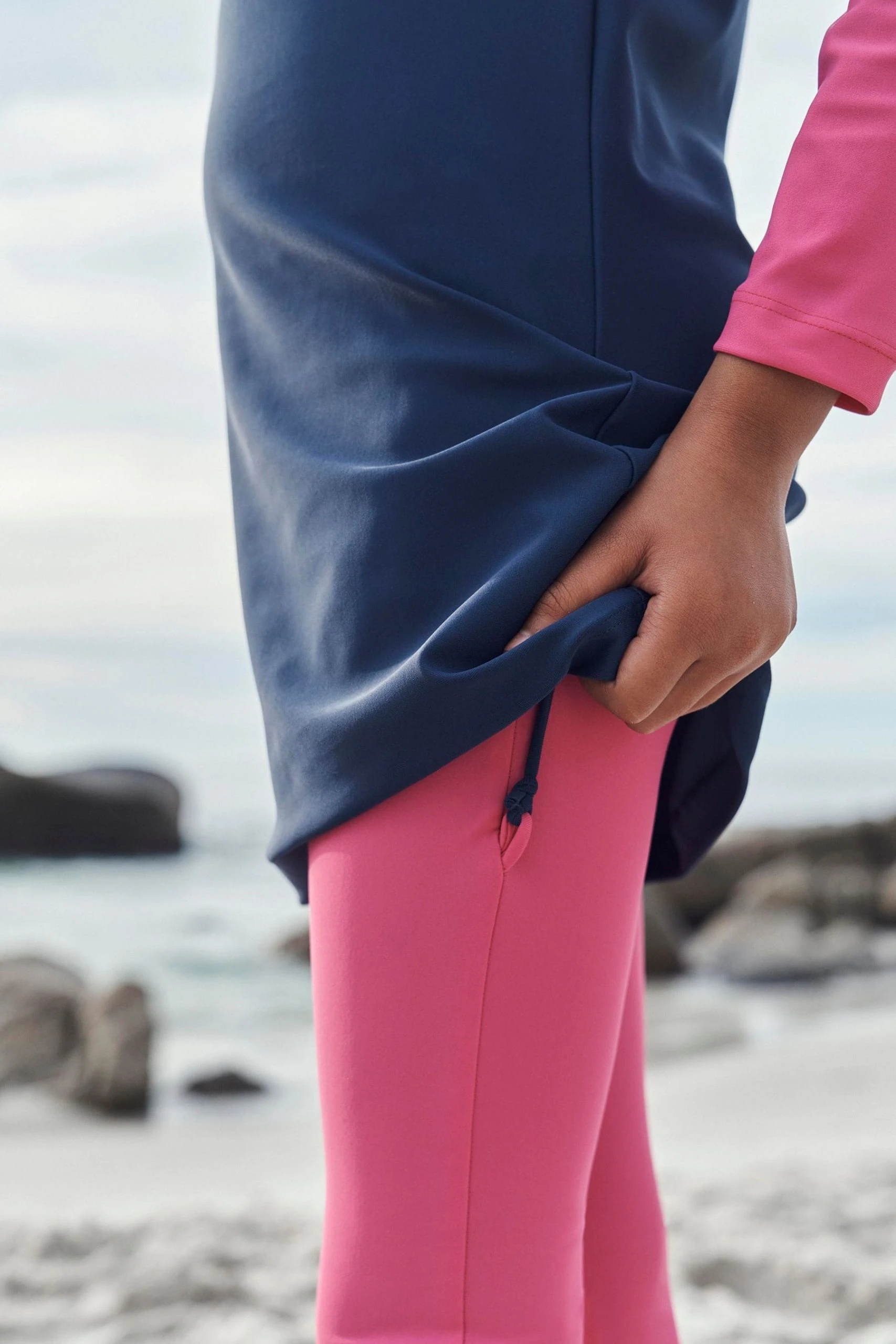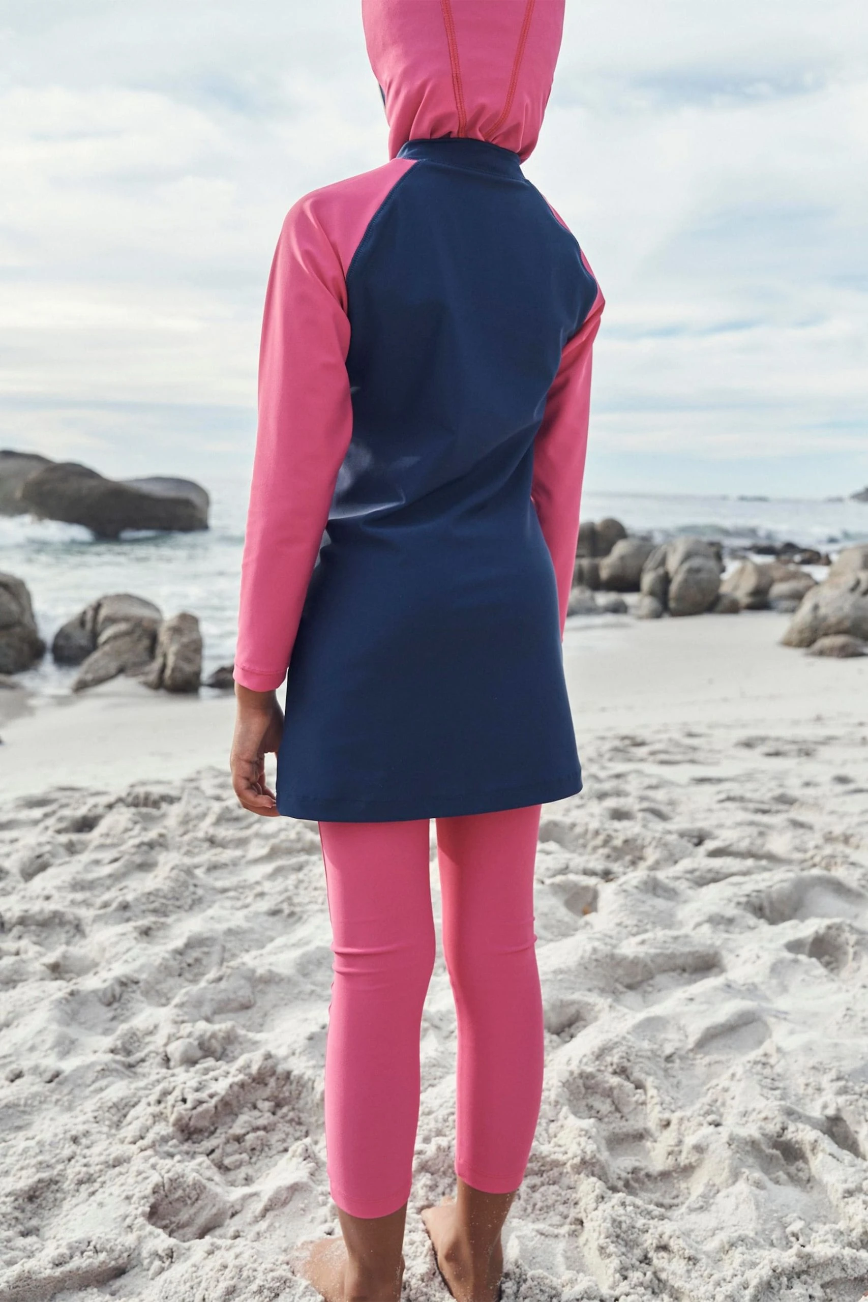 Made with UV 50+ protection fabric, this 3 piece swim set perfectly blends comfort and style covering the whole body apart from the face, feet and hands. Made from a comfortable fabric, it features a stretchy fitted hood, longline tunic and full-length leggings.