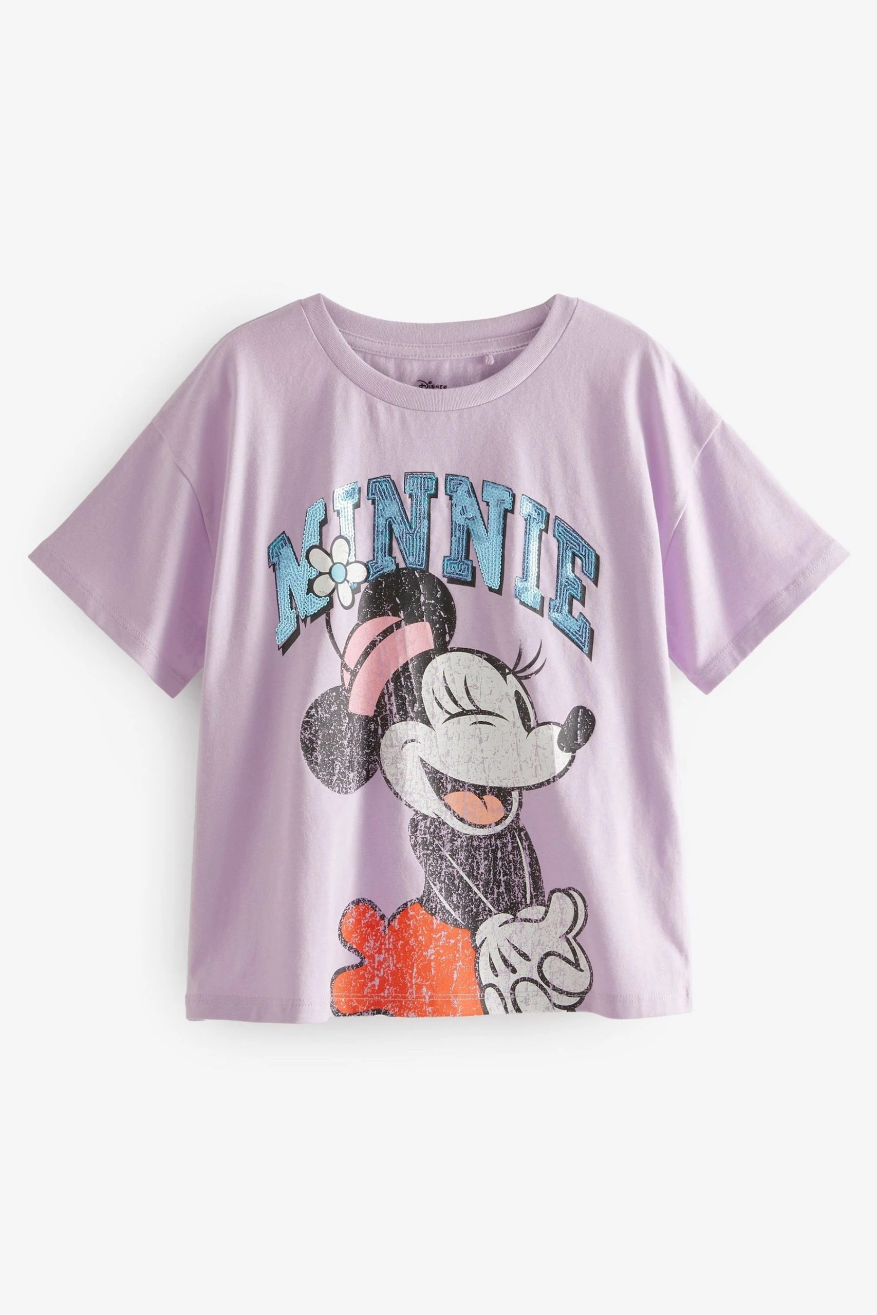 Relaxed fit. 100% Cotton. Sequin embellished. Minnie mouse print artwork. Short sleeves. Crew neckline.