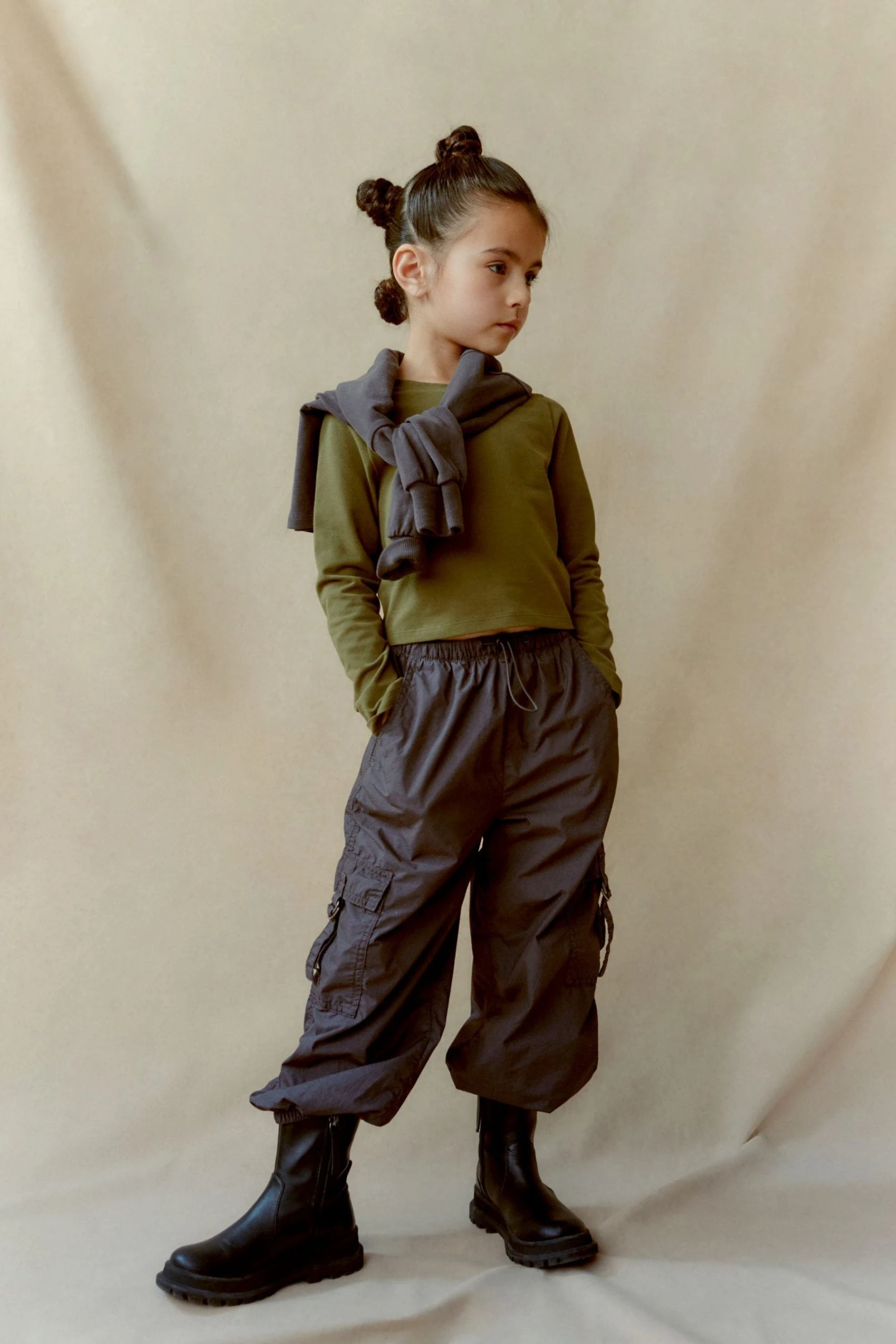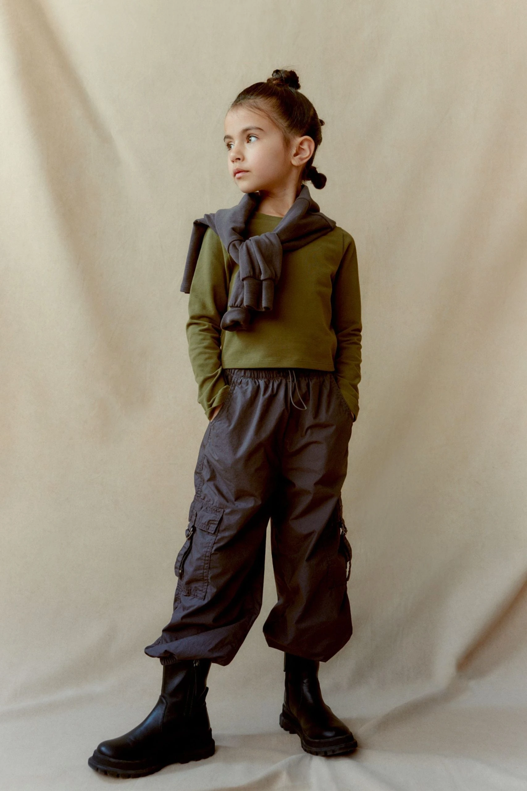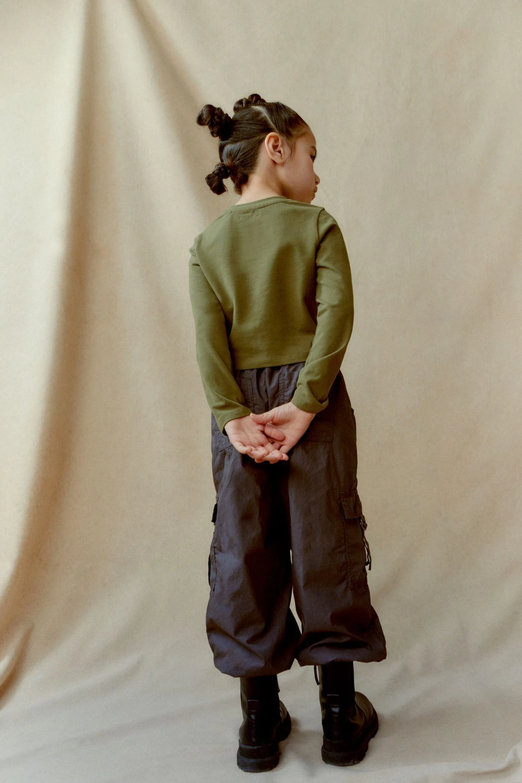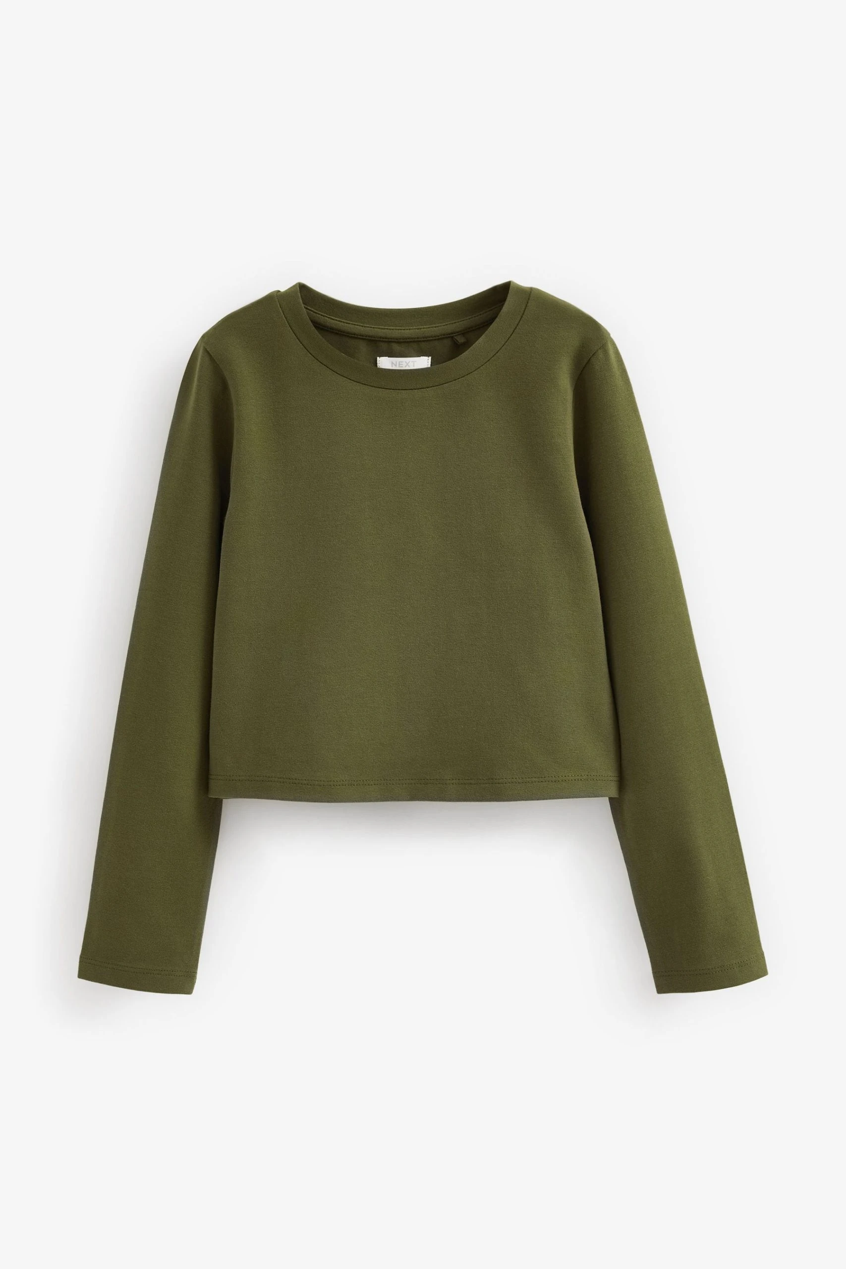 Boxy fit. Stretchable cotton fabric. Short length. Crew neck. Long sleeves.