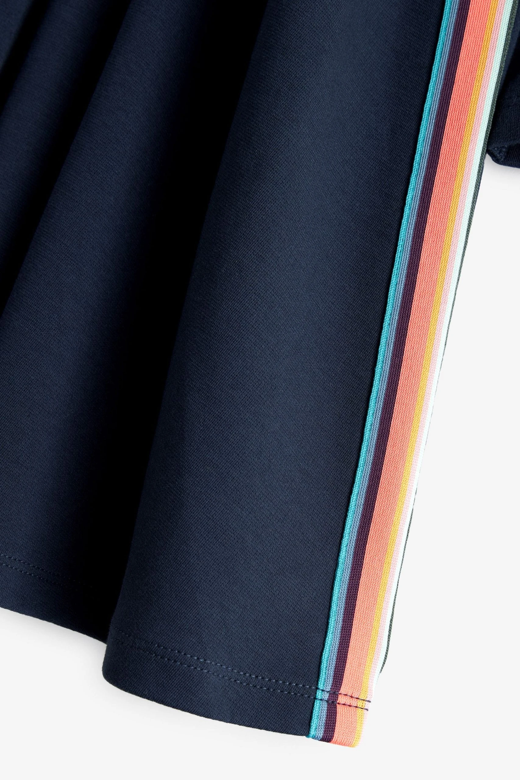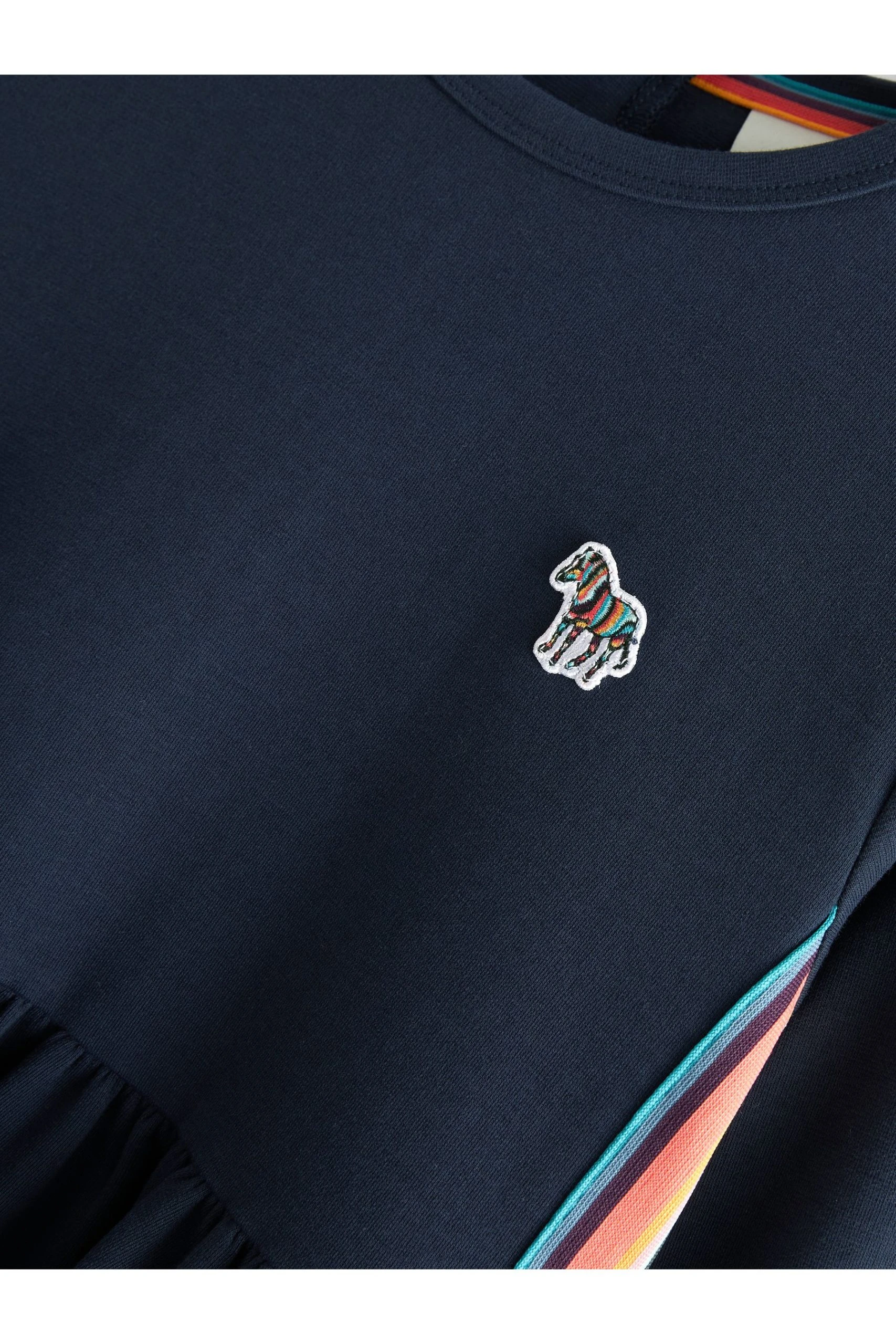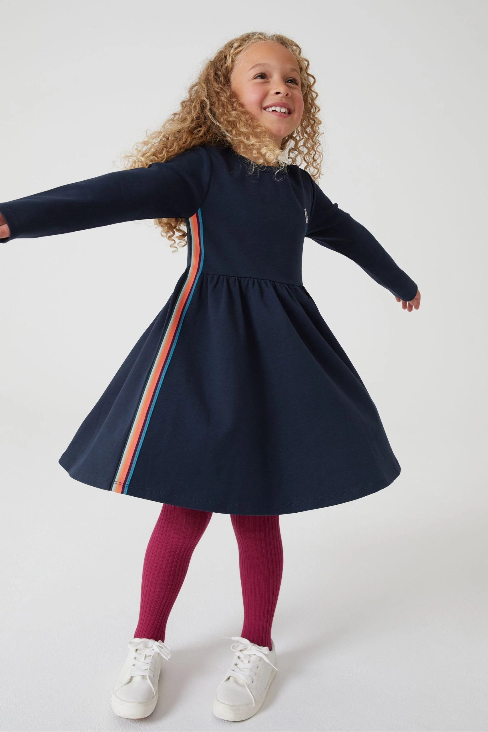 Made from a supersoft cotton ponte fabric, this long sleeve skater style dress from Paul Smith Junior has a softly rounded crew neck. With a neatly fitted bodice, the dress has the signature ‘Artist Stripe’ tape at the side seams and inner neckline and the classic Zebra logo on the chest.