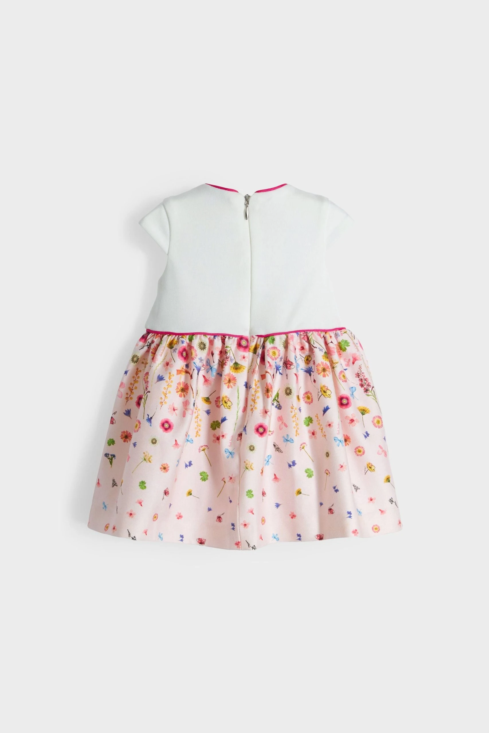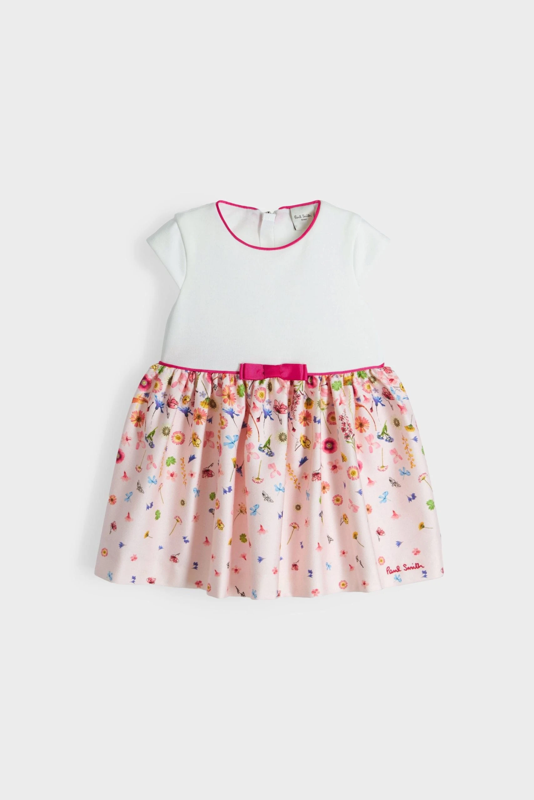 Made from a cotton-rich fabric with a cotton lining, this pretty floral dress from Paul Smith Baby features a Ponte fabric bodice with short sleeves and a rounded neck. Perfect for their occasionwear wardrobe, this pretty all-over floral print skirt has a gathering at the waistline for volume and an adorable bow. ??Occasion dress. Gathered skirt. Contrasting binding. Pretty bow detail. Ponte fabric bodice.