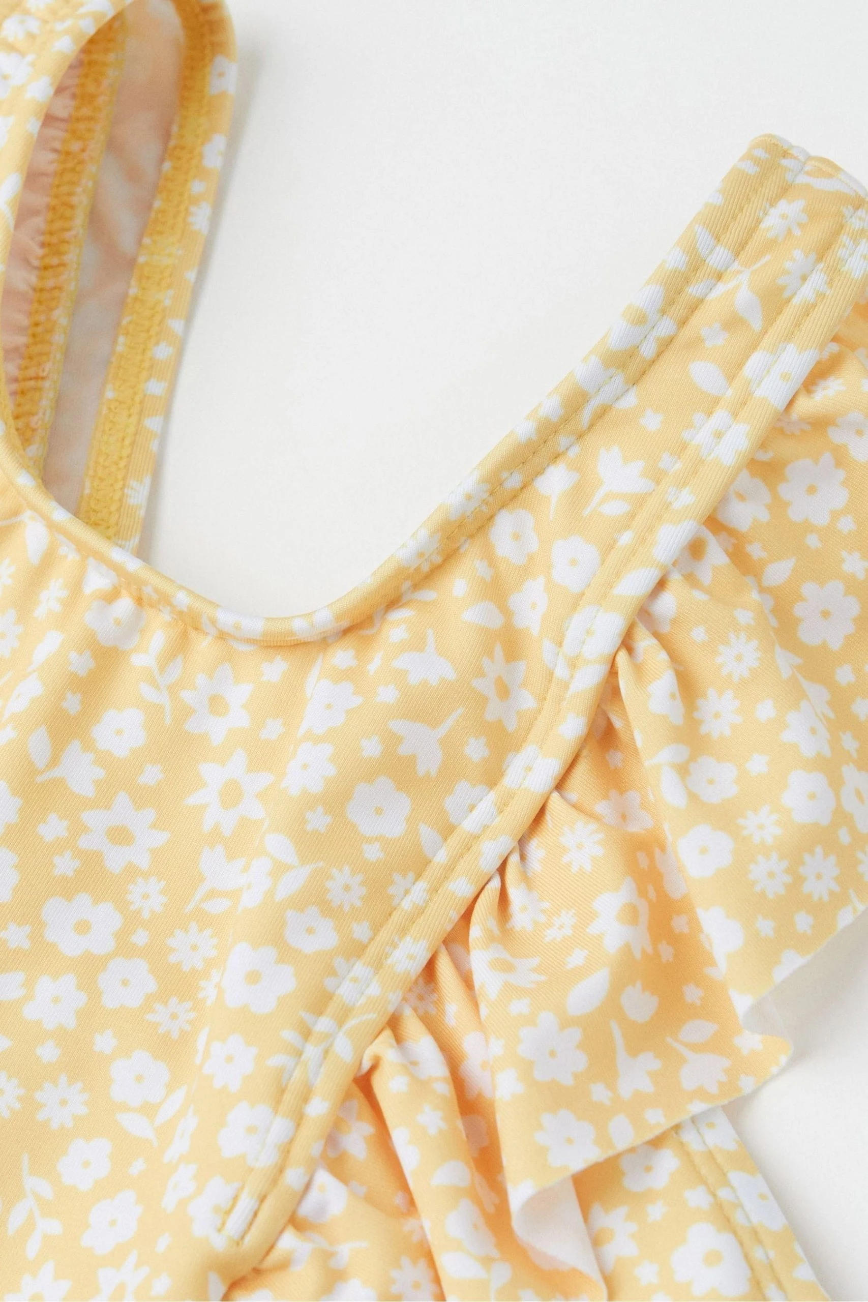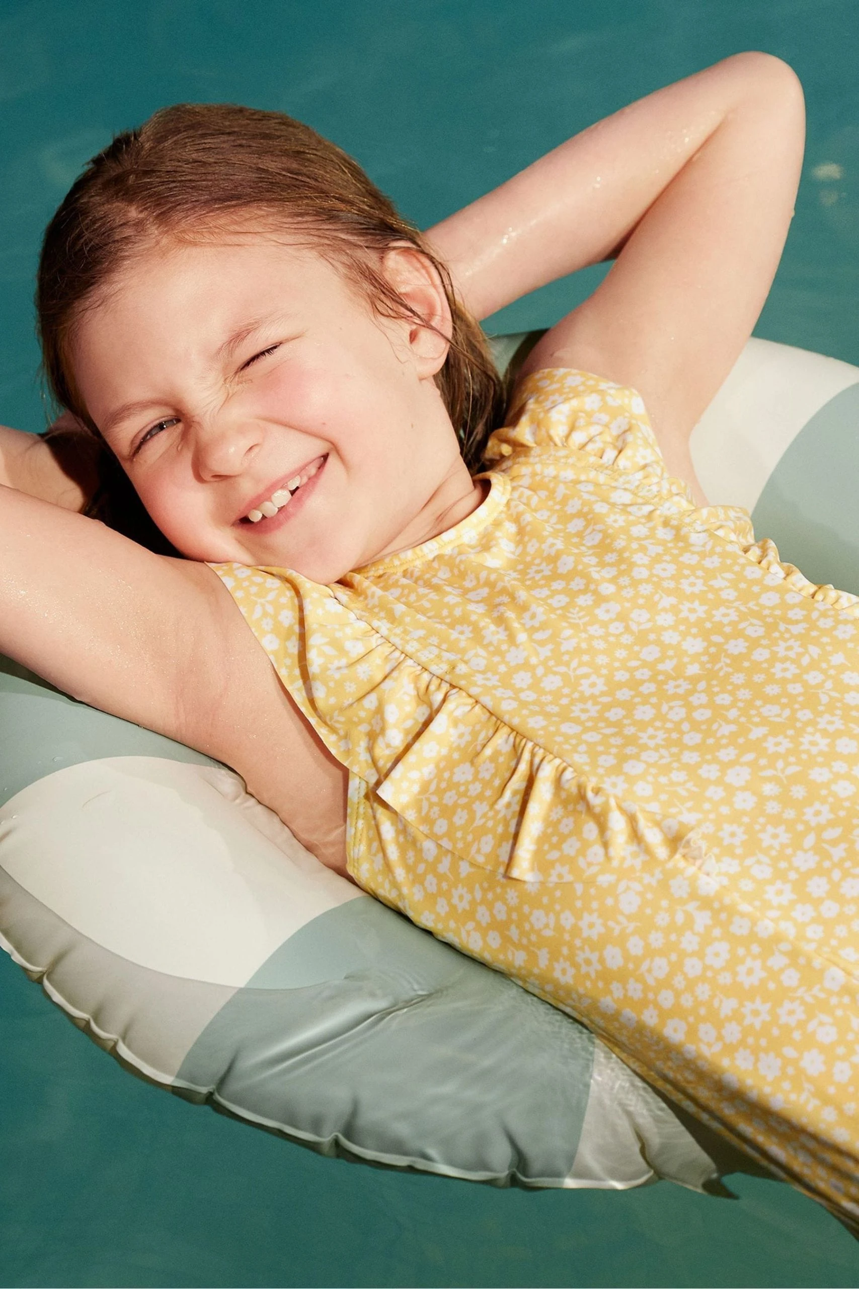 On the beach or in the back garden she’ll love wearing this floral print swimsuit from Polarn O. Pyret. In soft quick-drying fabric it has a round neckline and frilled shoulder straps for a pretty finish. Coordinates with other swimwear and hats in the Polarn O. Pyret collection.