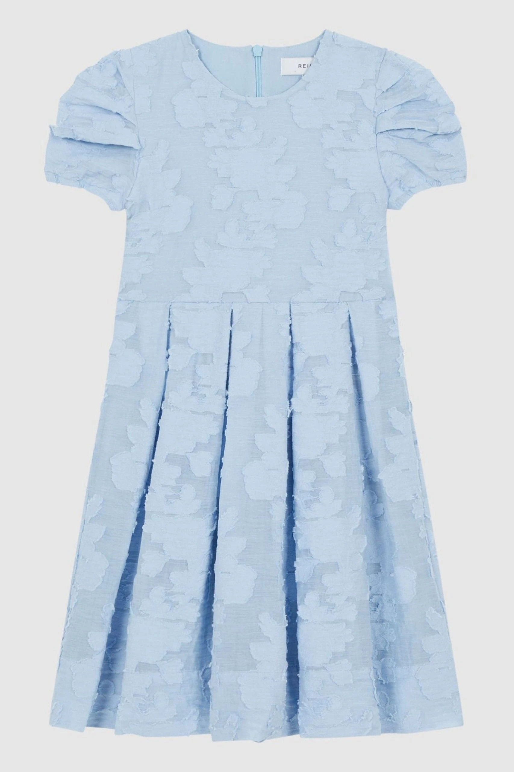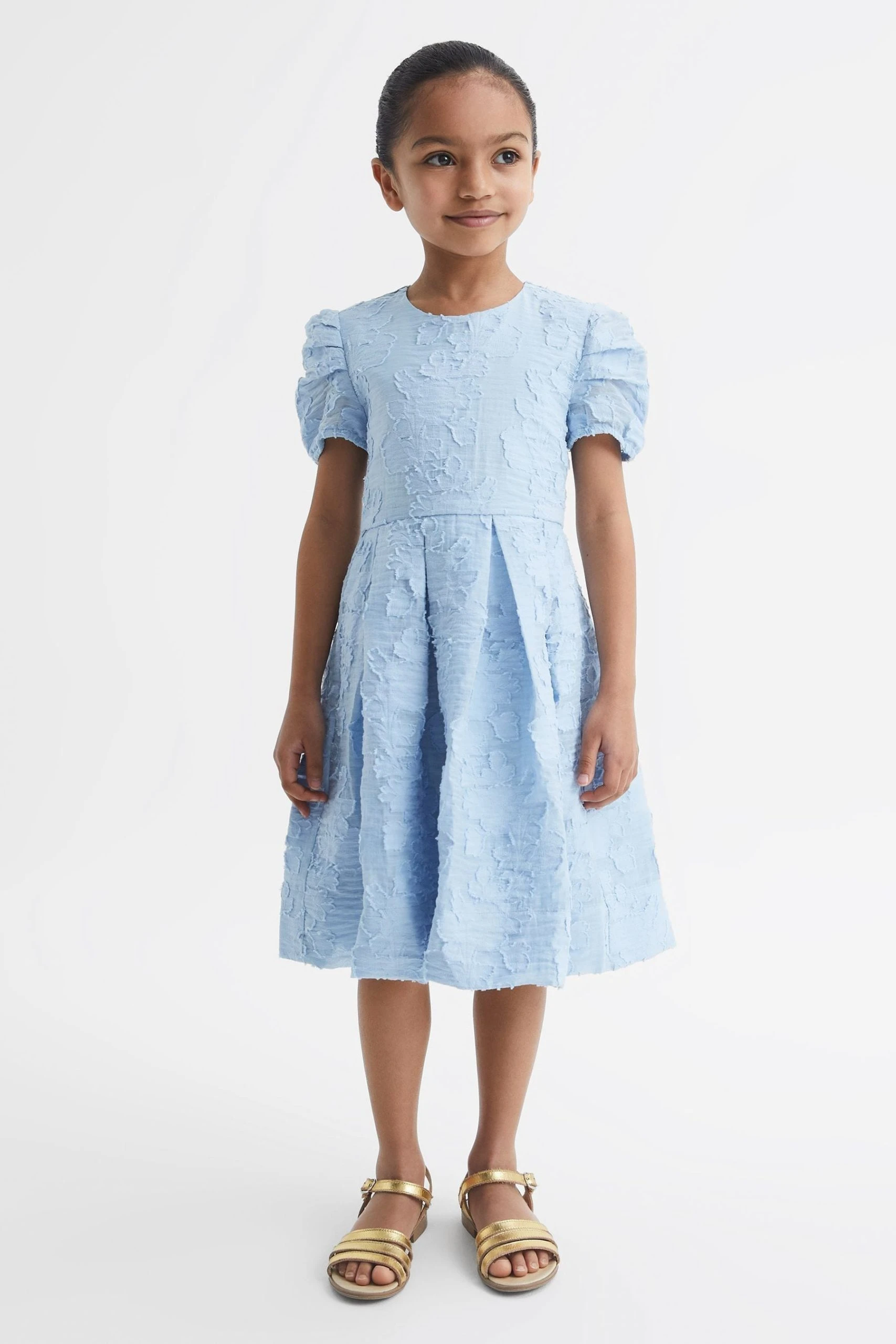The ivory Amalie dress is a feminine pick for special occasions. It’s crafted from a textured, floral printed fabrication and fitted with puff sleeves. The bodice sits slender against the frame and the pleated skirt flares out for a subtle impact. Add a pair of metallic pumps to curate a charming event edit. Floral print. Textured fabrication. Pleated design. Crew neckline. Elasticated puff sleeves. Zip closure to reverse. The model is wearing a size 5-6 yrs Measurements of model: Height 4ft / 123cm.