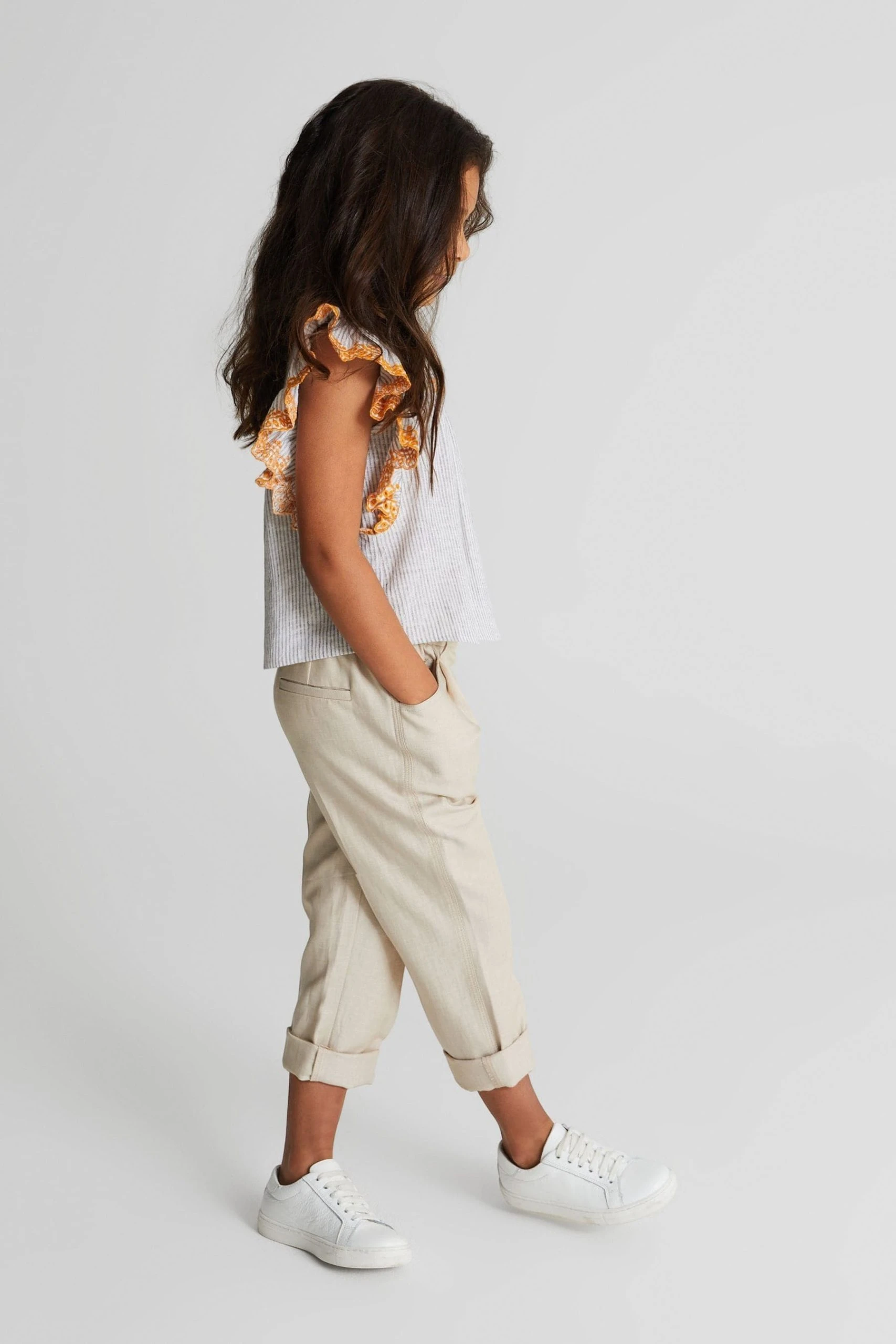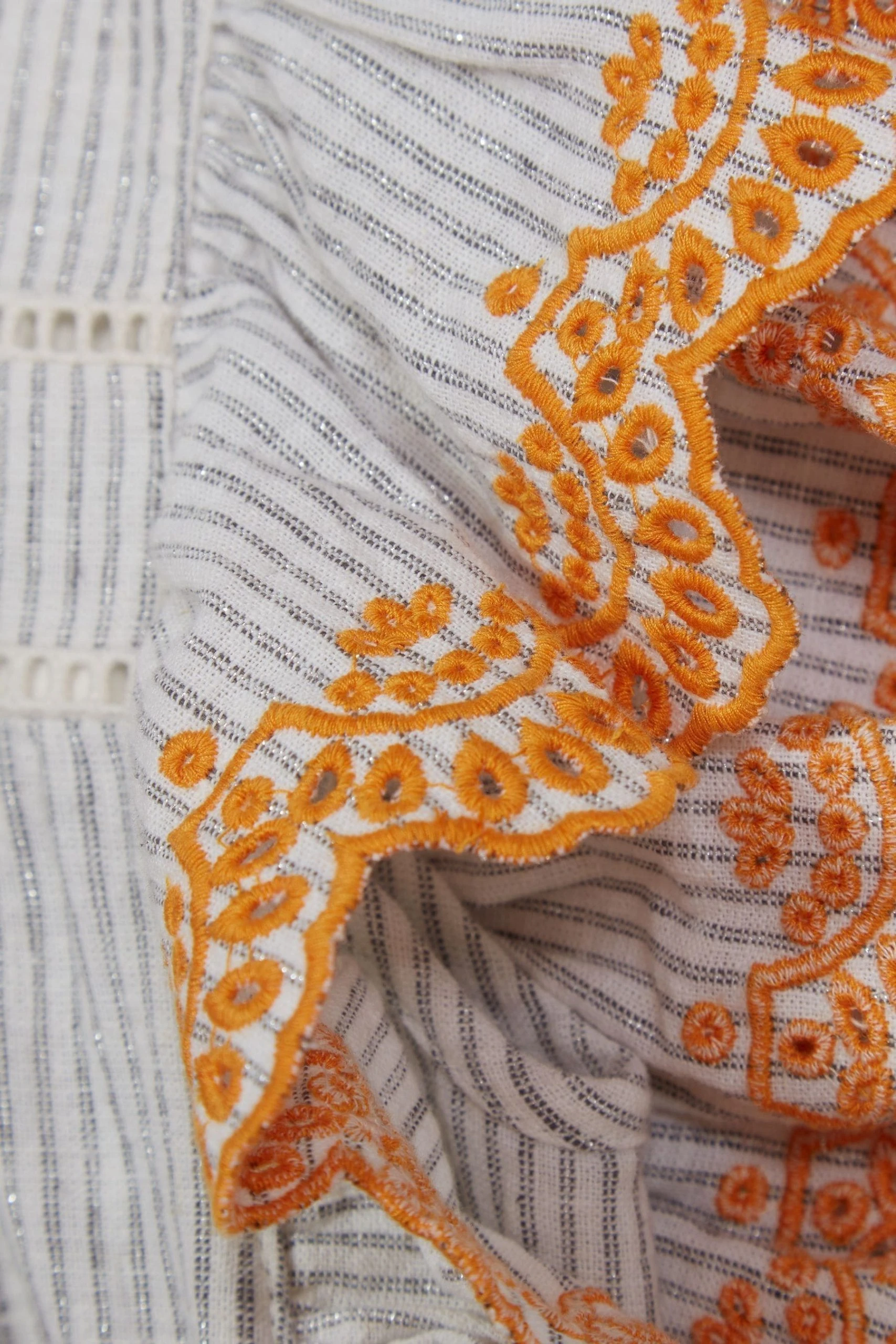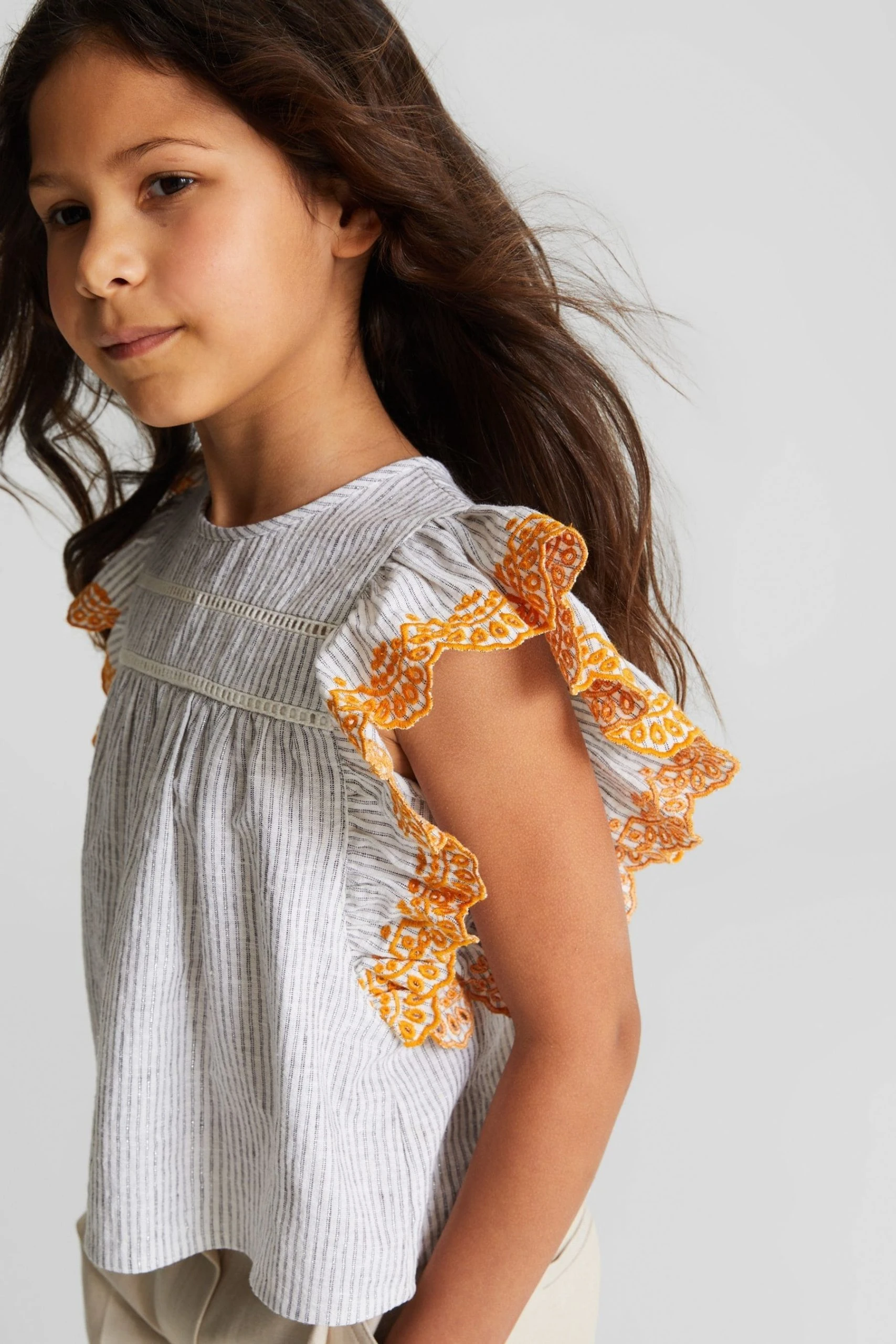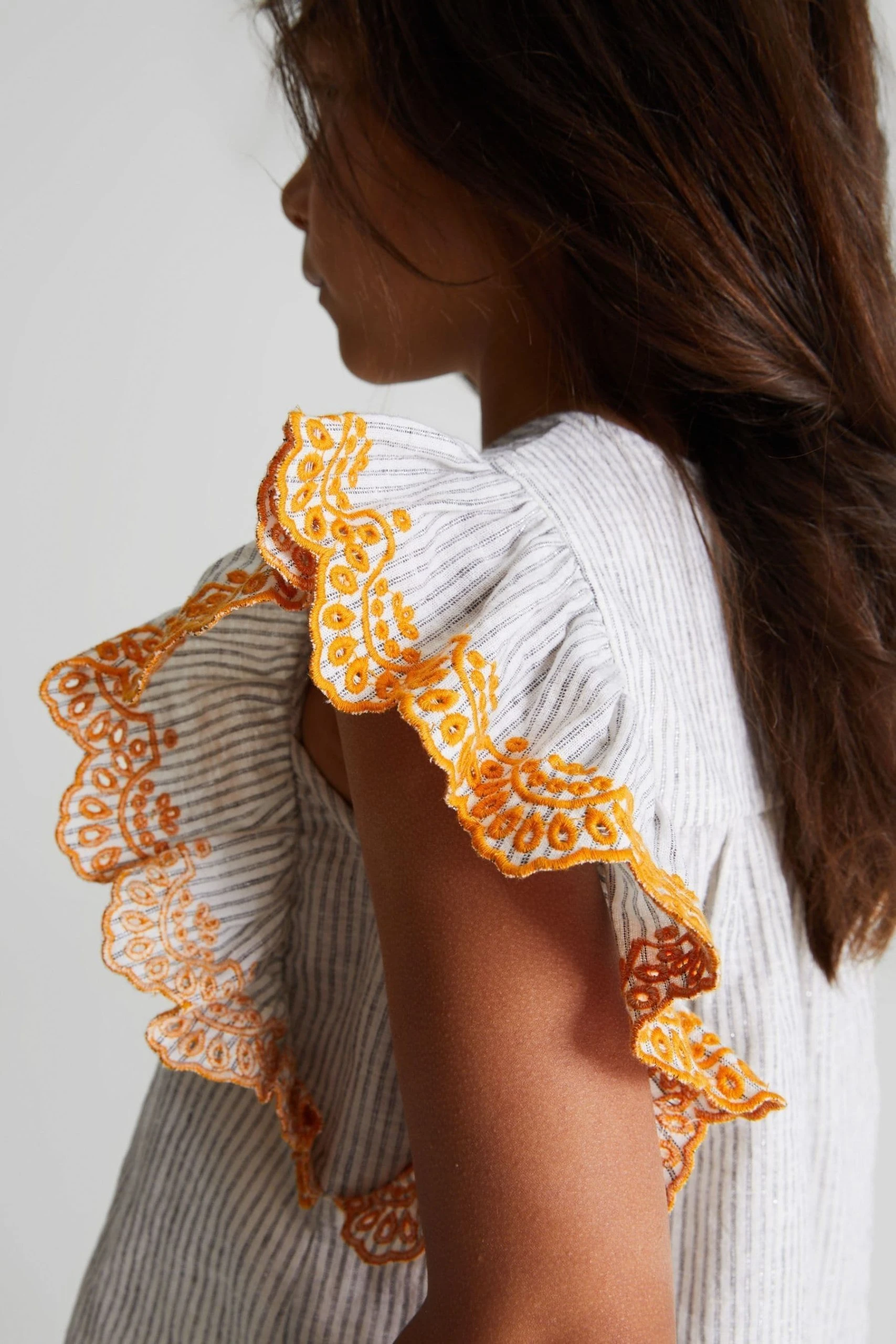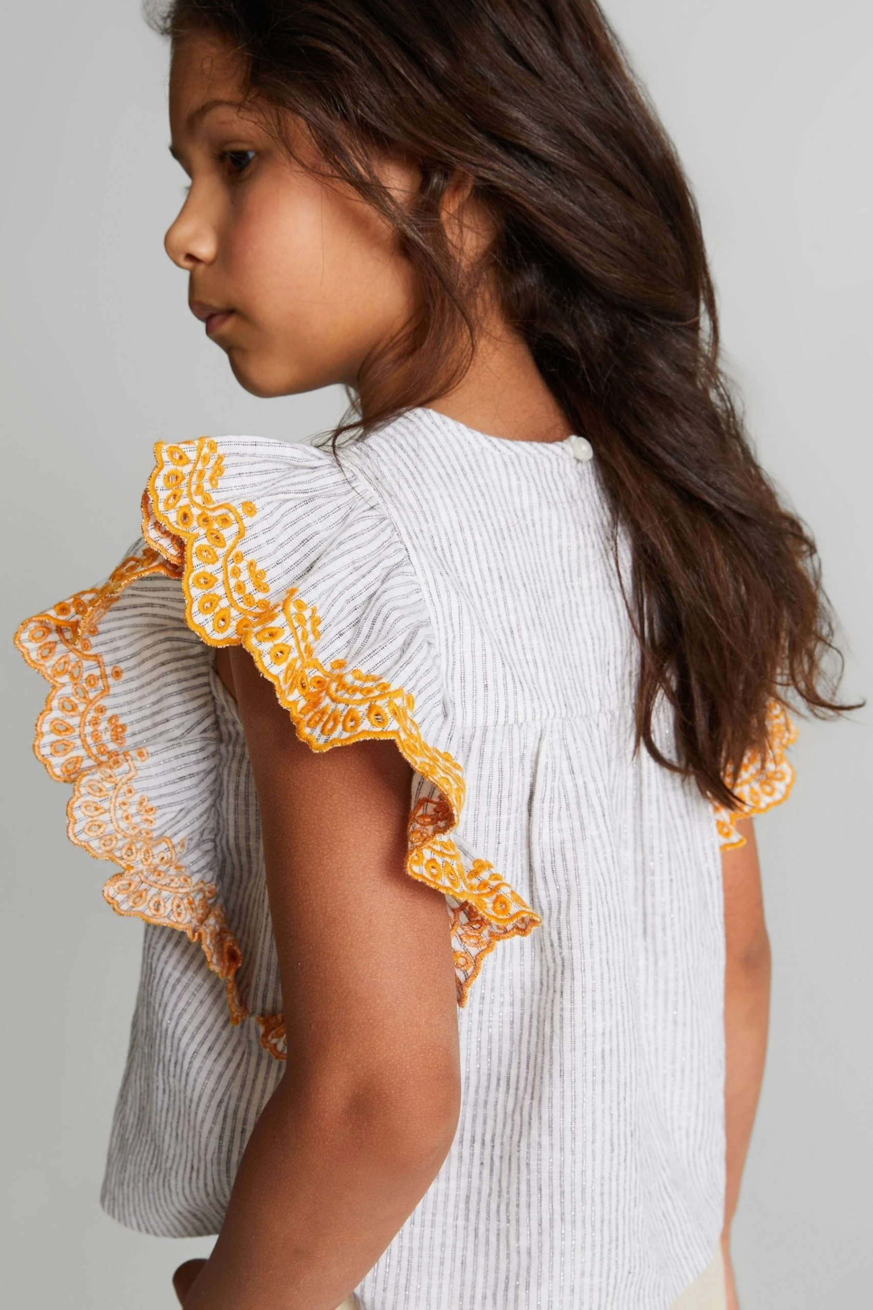 Bring a playful mood to edits with the Casey Jr blouse, crafted in a lightweight linen-cotton blend with metallised fibres for a shimmering finish. This style has a crew neckline and ruffled short sleeves with embroidered detailing. Wear with jeans and sneakers for a fun look. Crew neckline. Short ruffled sleeves. Embroidered sleeves. Shift style. Striped design.