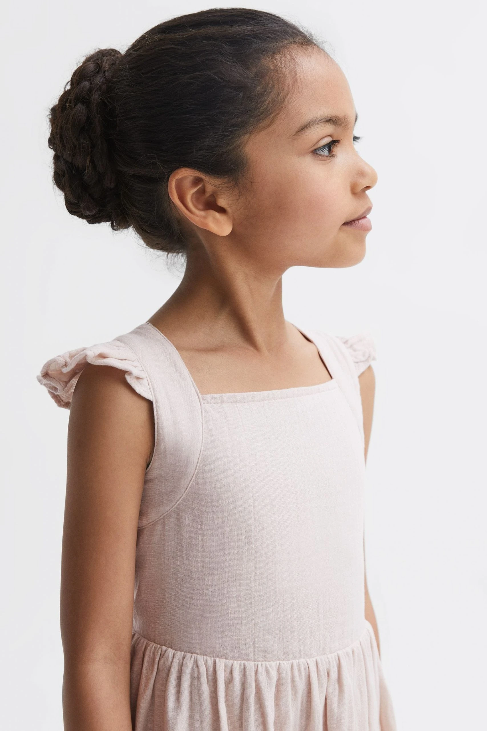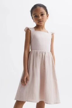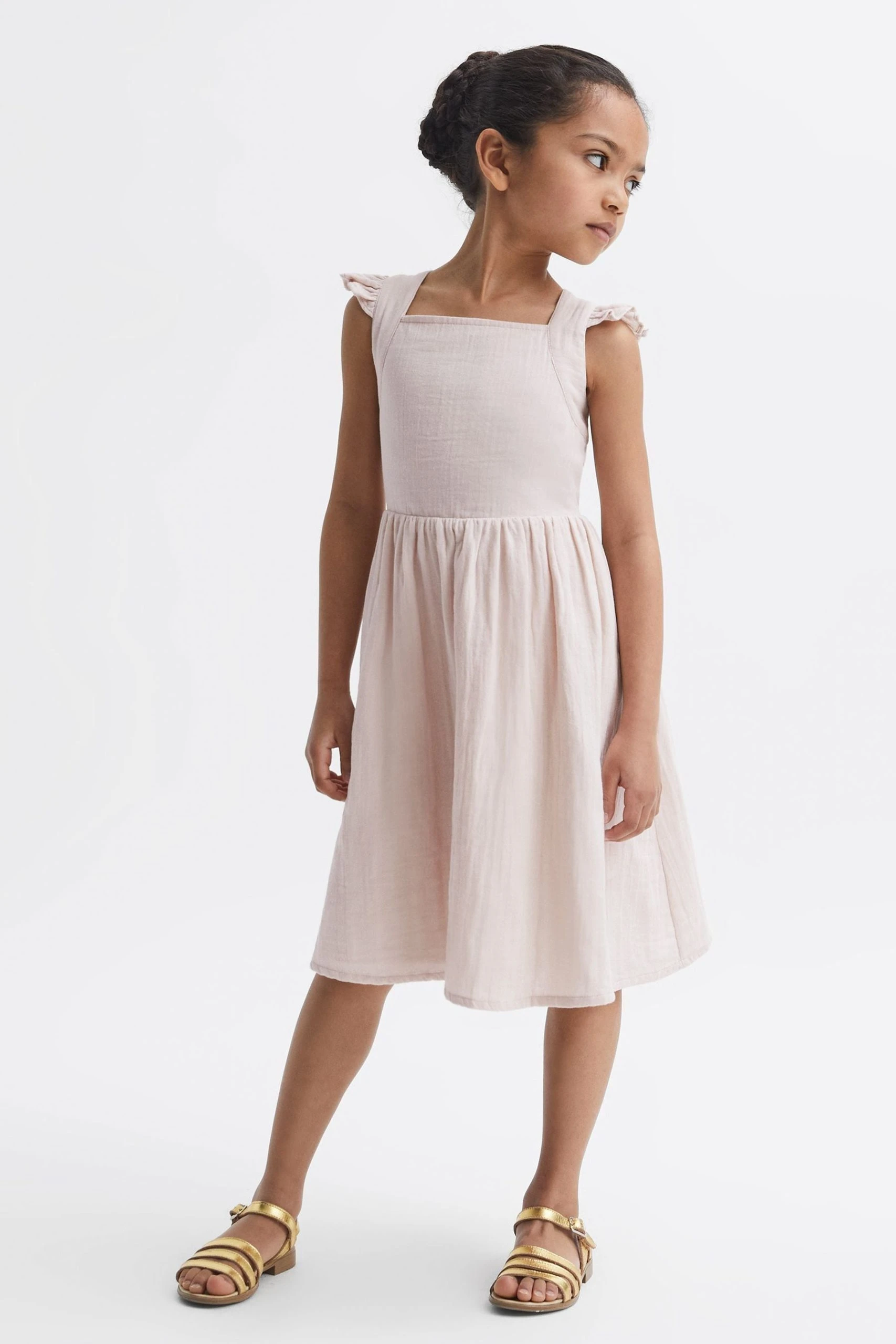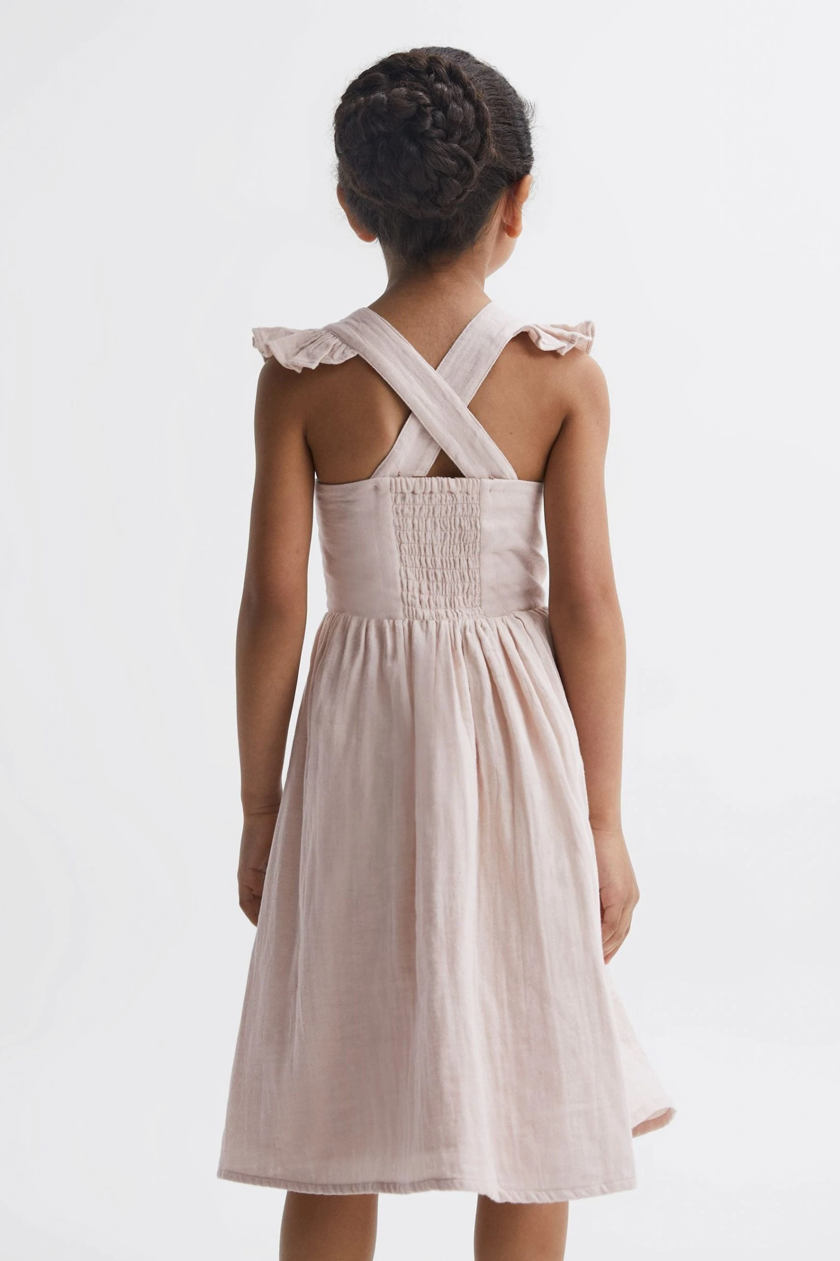 The Cerys dress is a simplistic yet elegant option for special moments. It’s a cross-back design, crafted to sit close to the chest whilst an elasticated panel ensures a comfortable fit. Frill detailing is added to the shoulder straps for feminine appeal, and the skirt drapes naturally to a below-the-knee finish. Its 100% cotton composition lends itself to warm-weather evenings and resort edits. 100% cotton. Cross-back design. Elasticated panel to reverse. Frill detailing.