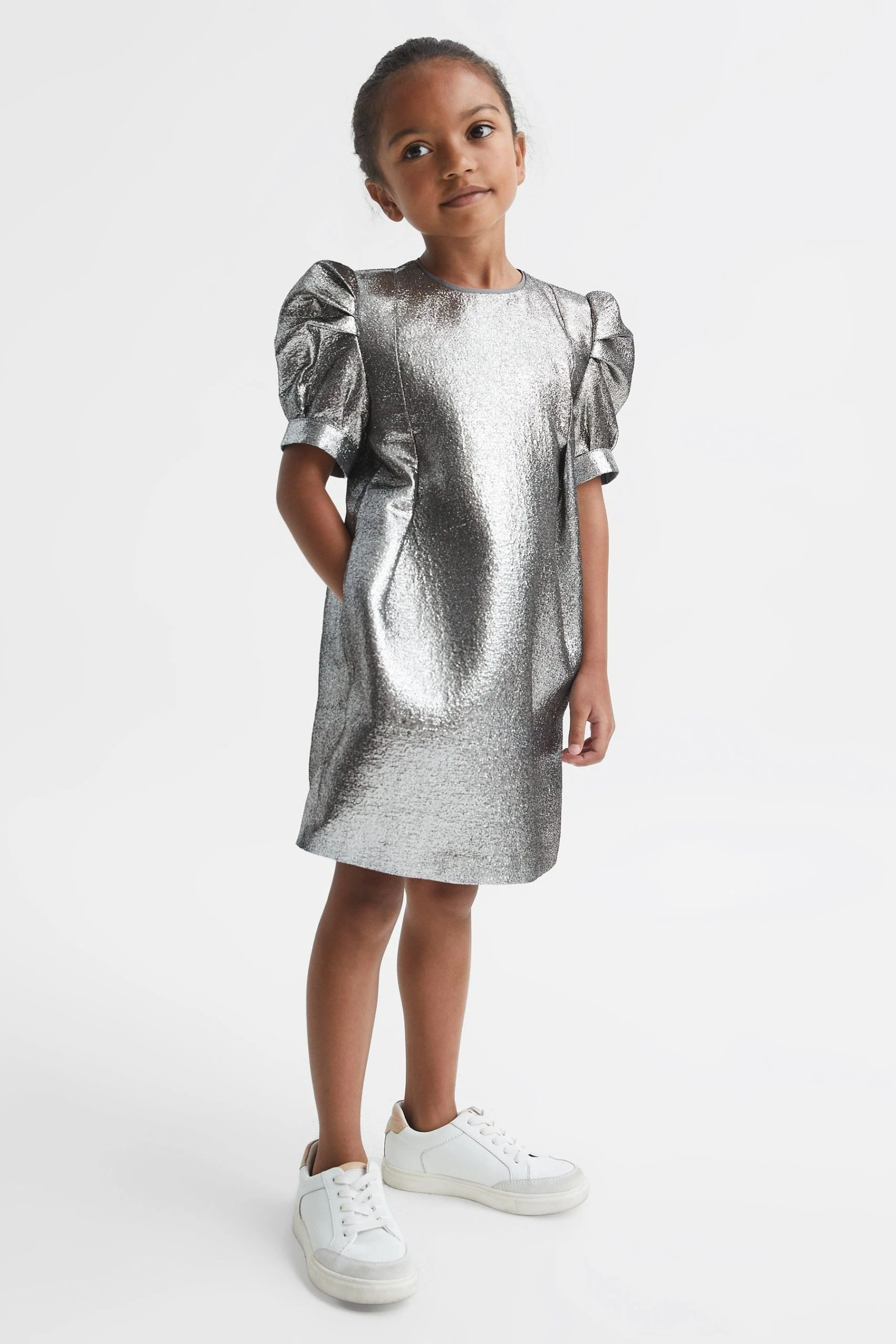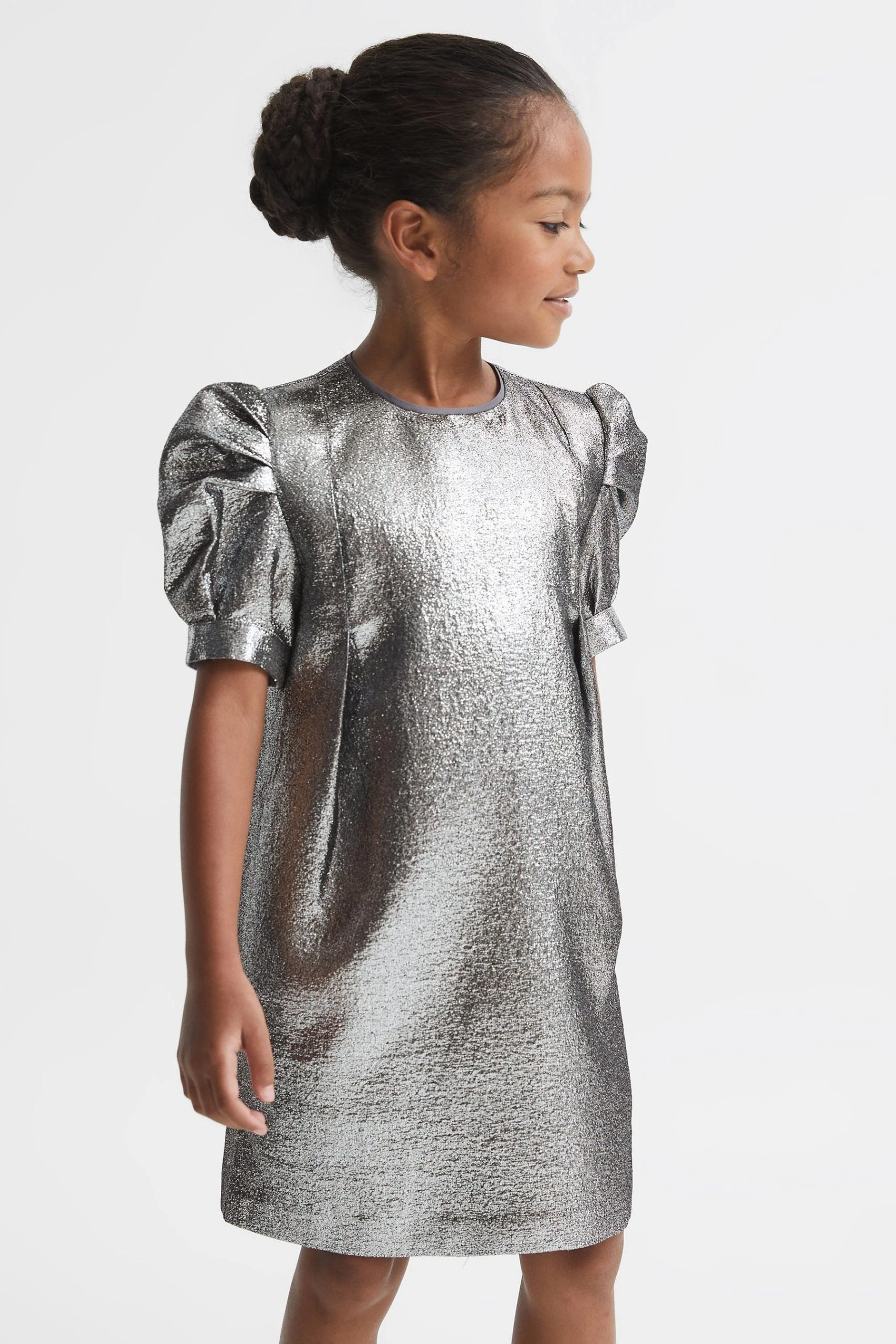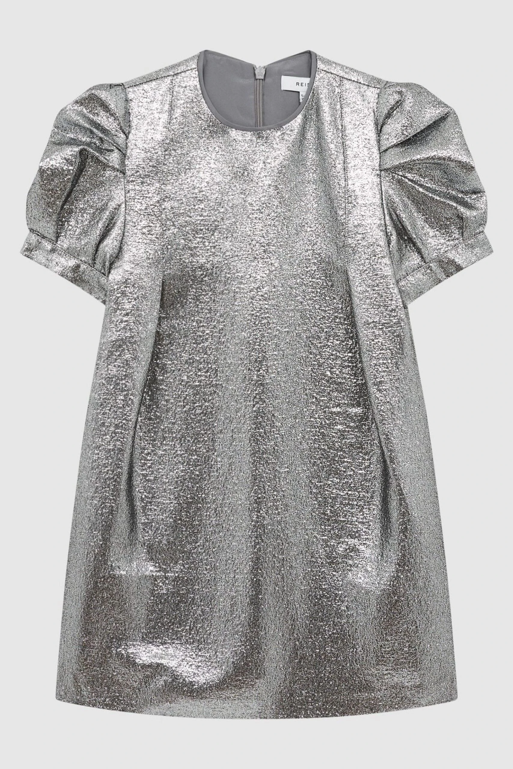 The Ellie is the ideal dress for special occasions, crafted with metallic silver fibres and puff sleeve detailing for a look that is sure to turn heads. Crew neckline. Puff sleeve detail. Metallic fabrication. Zip closure to reverse. Above-knee length. Modern fit. The model is wearing a size 5-6 yrs.