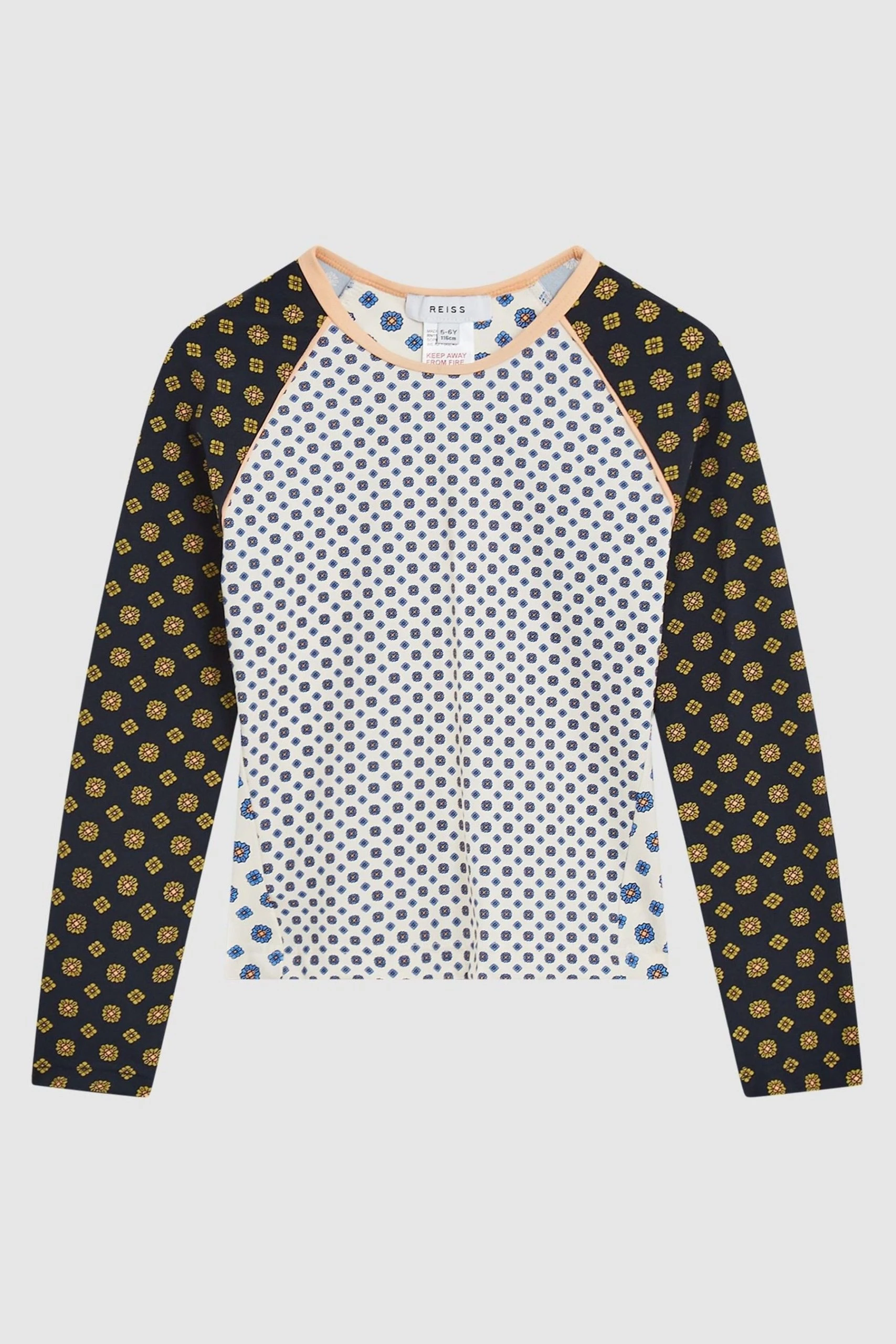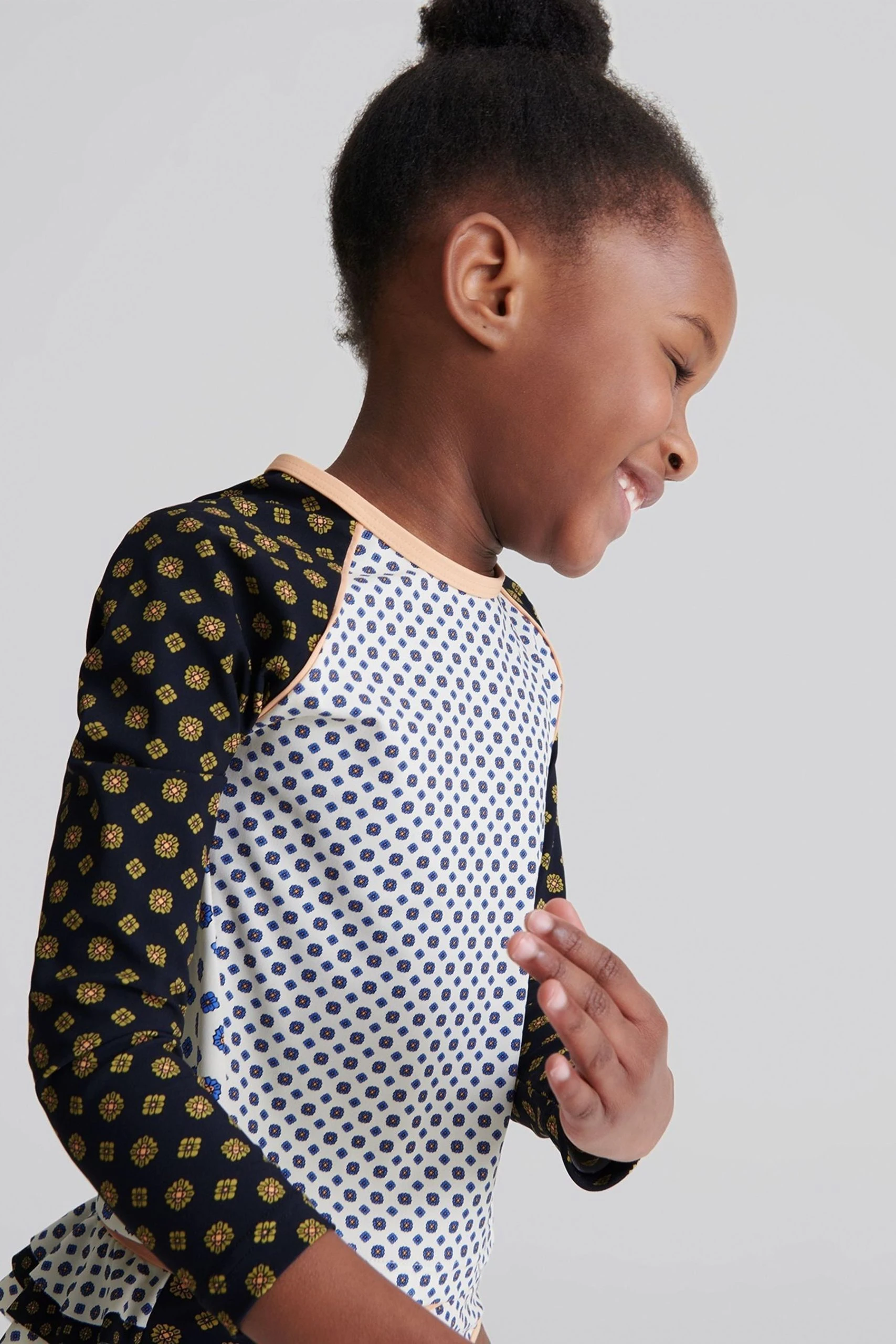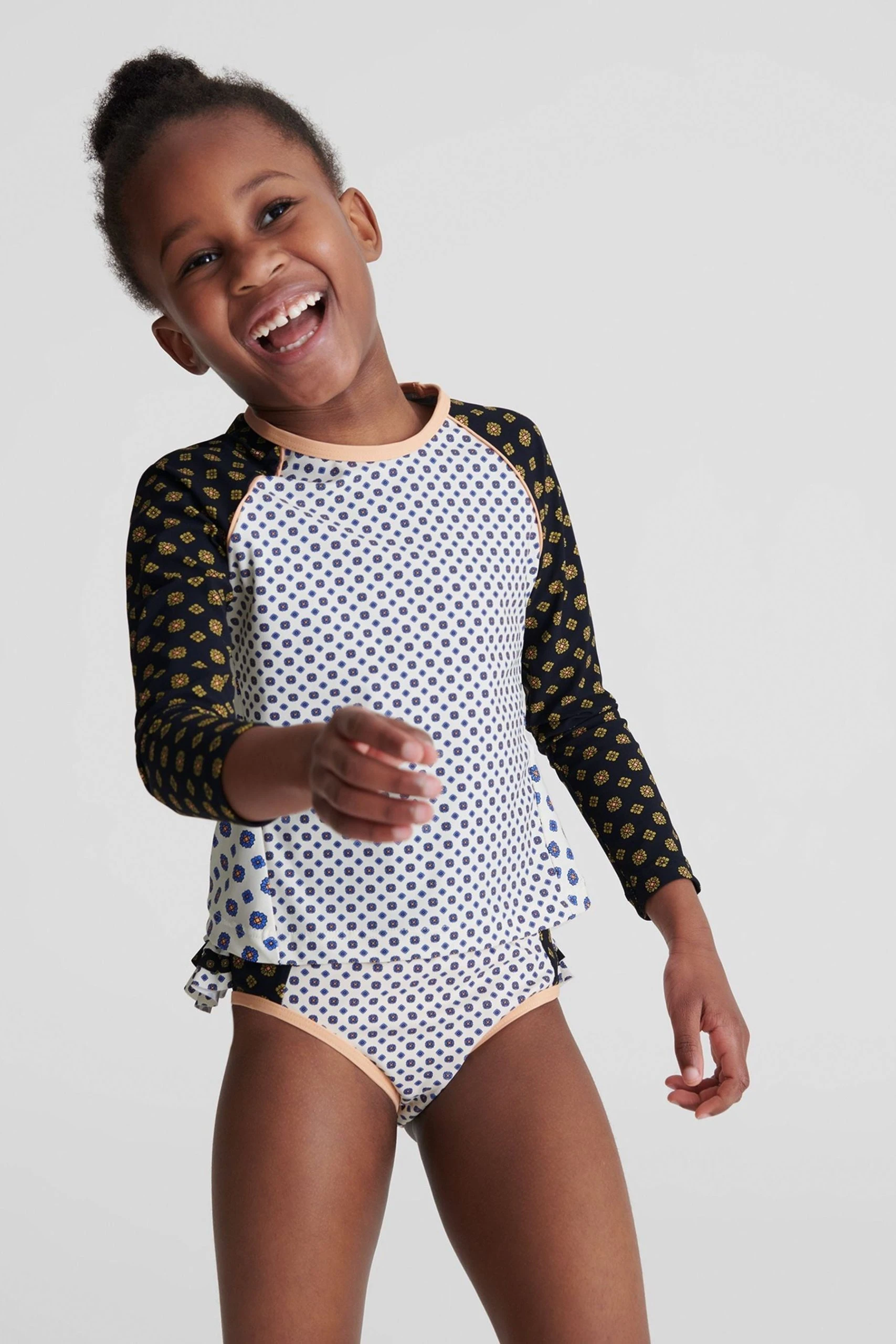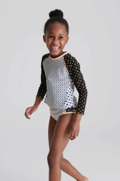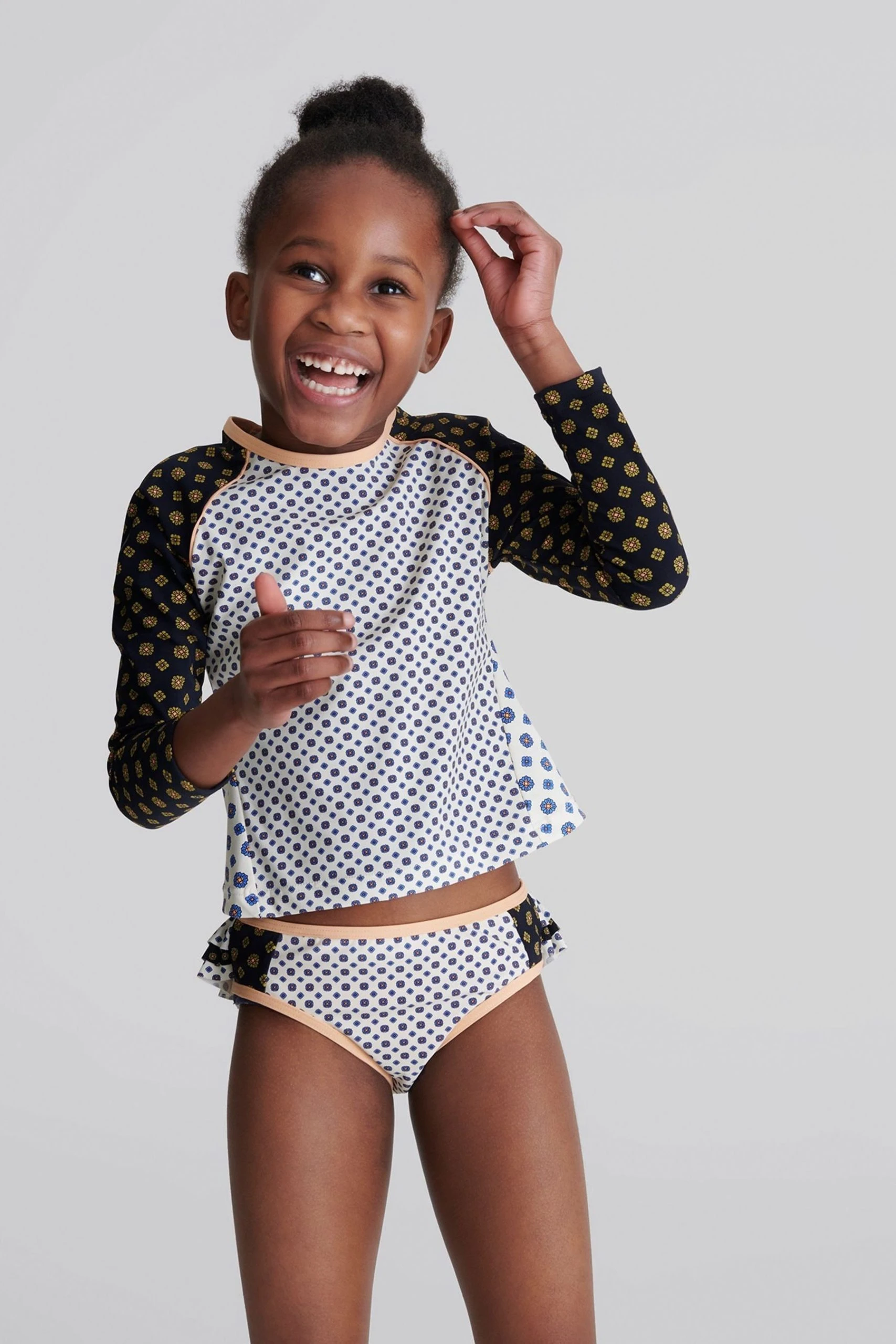 Ideal for those busy holiday days, the Sophie Jr is crafted in a long sleeve top design to increase coverage, helping to reduce the skin s exposure to the sun. It is fabricated with stretch for freedom of movement and is finished in a charming contrast-colour medallion print. Little ones can feel confident and comfortable in this around the beach and pool. Long-sleeve top design. Stretch fabrication. Contrast colour medallion print. The model is wearing a size 5-6 yrs.