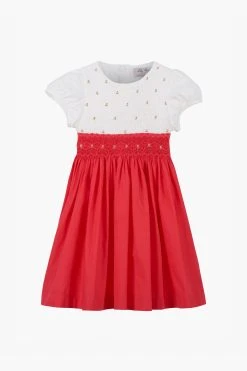 Trotters London Red Willow Rose Hand Smocked Cotton Dress