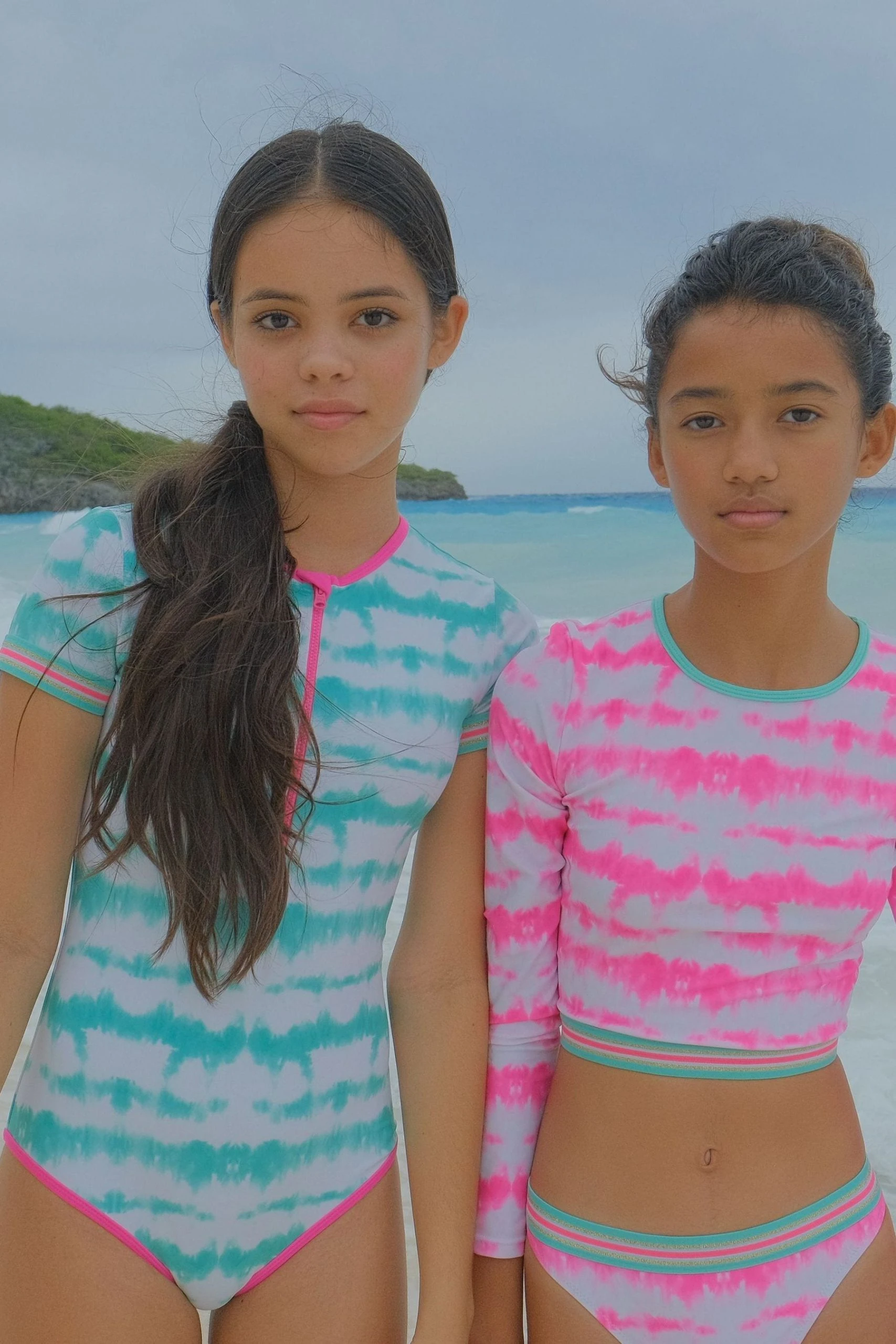Add some colour to any teen girl’s beach wardrobe with our vibrant neon Pink Tie Dye Bikini. Bring bohemian vibes to the beach with this neon pink print trimmed with mint green and pink elastic with a splash of gold to complete the look.