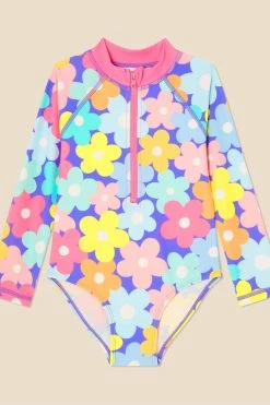 Angels By Accessorize Girls Blue Retro Floral Long Sleeve Swimsuit