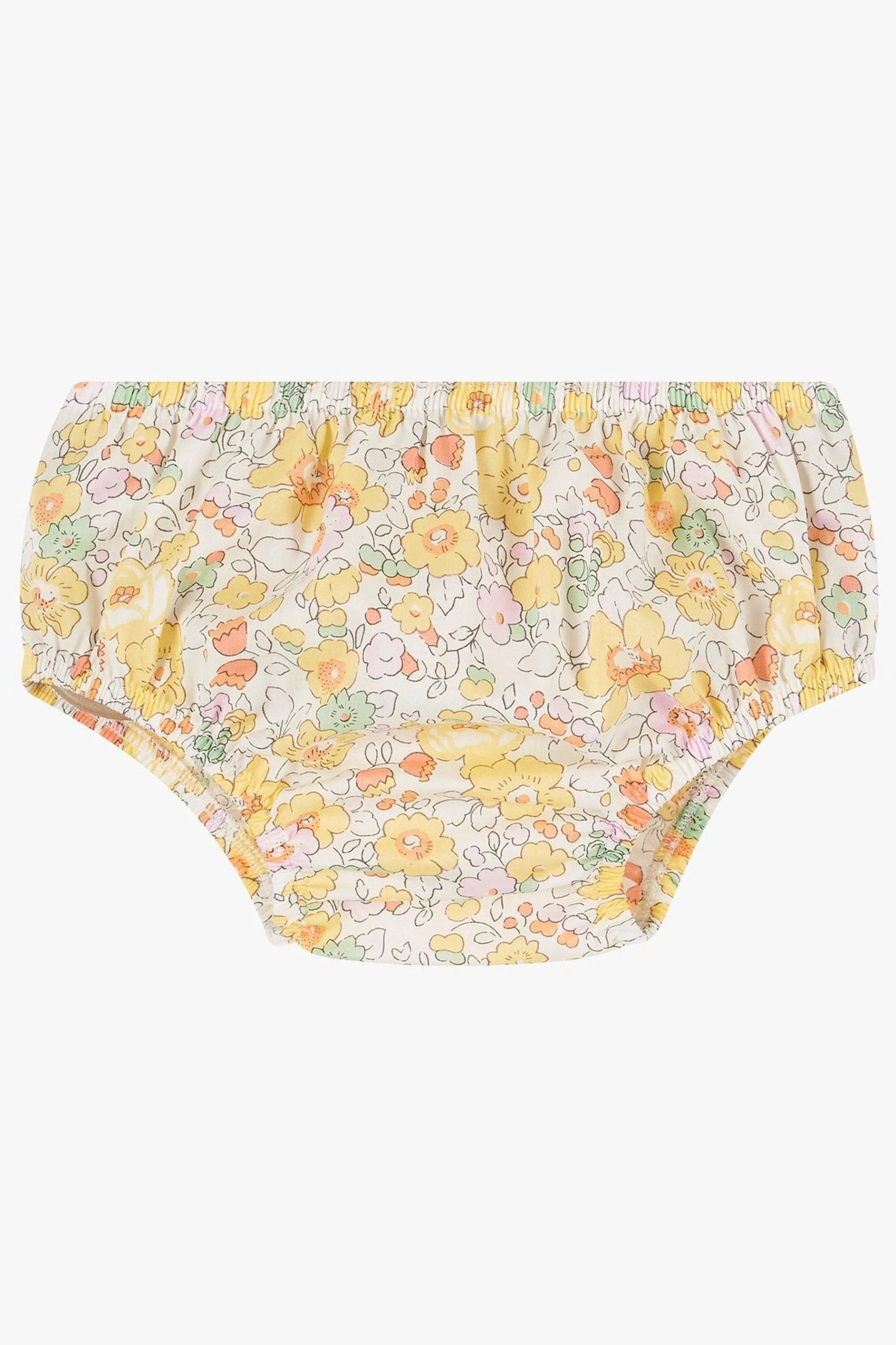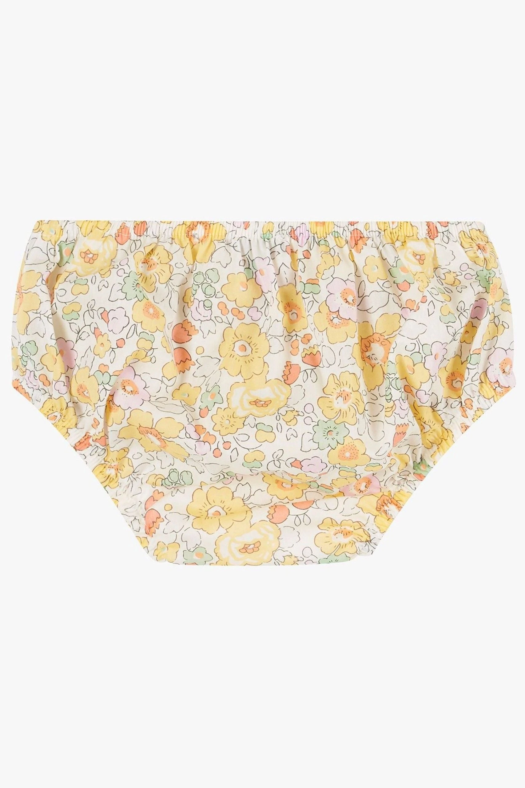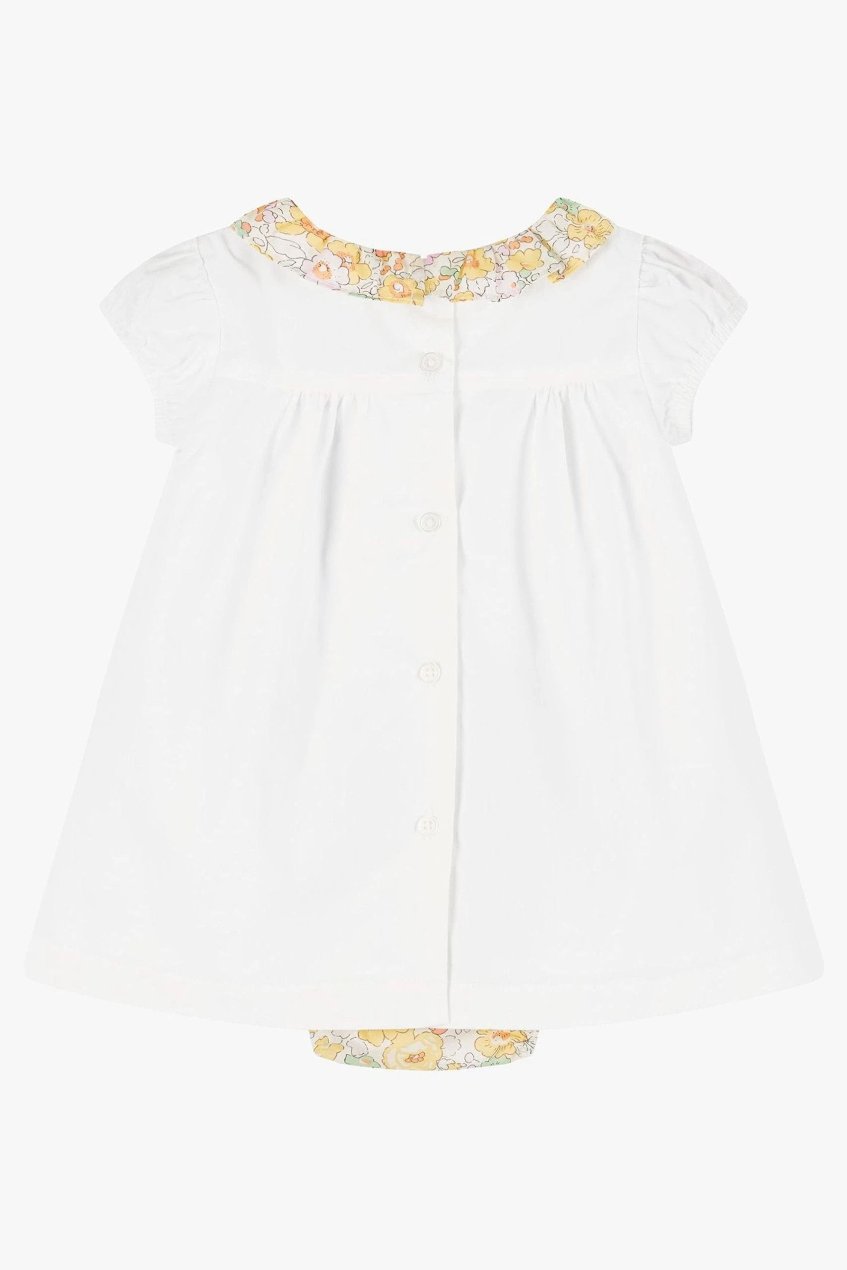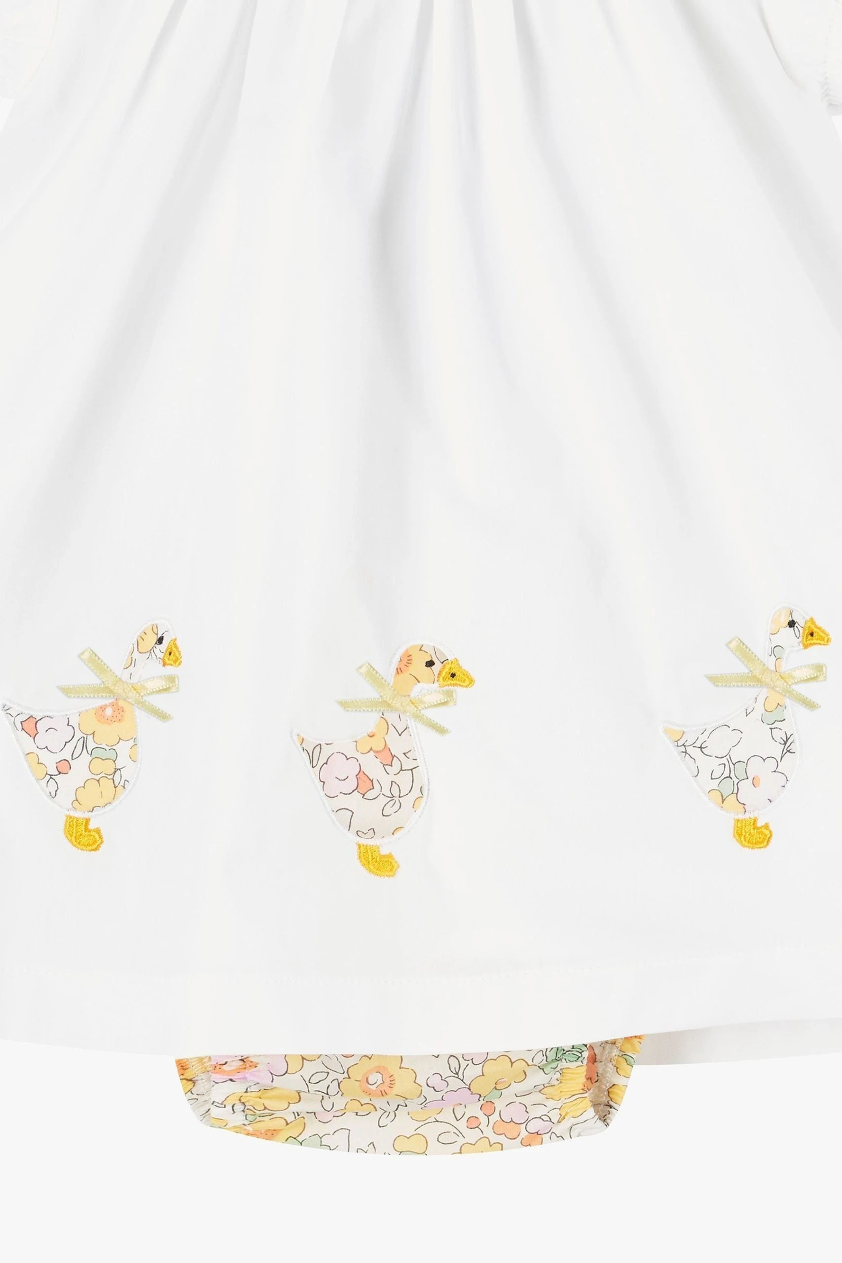 This season, our classic My First Duck Dress is made in a fresh white cotton and comes adorned with a pretty willow collar made in one of Liberty’s most iconic prints; known for its stylised small floral design. A beautiful gift and a wonderful keepsake for any new arrivals, it features short sleeves with elasticated cuffs and our signature appliqué ducks along the hem, complete with yellow satin bow detailing. Fully cotton lined, it’s sold with a pair of matching knickers in Liberty’s Betsy print fabric for the ultimate baby girl outfit.
