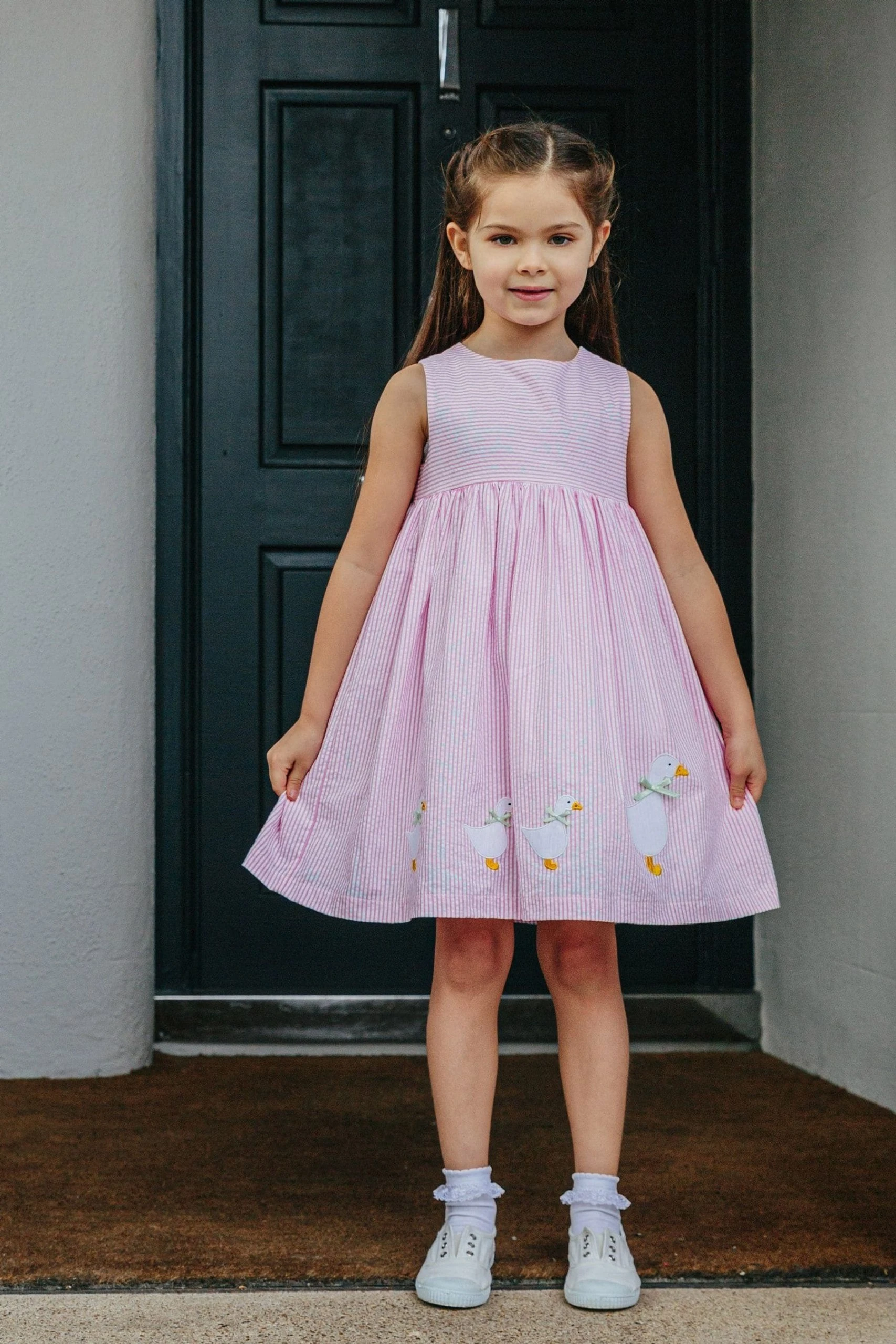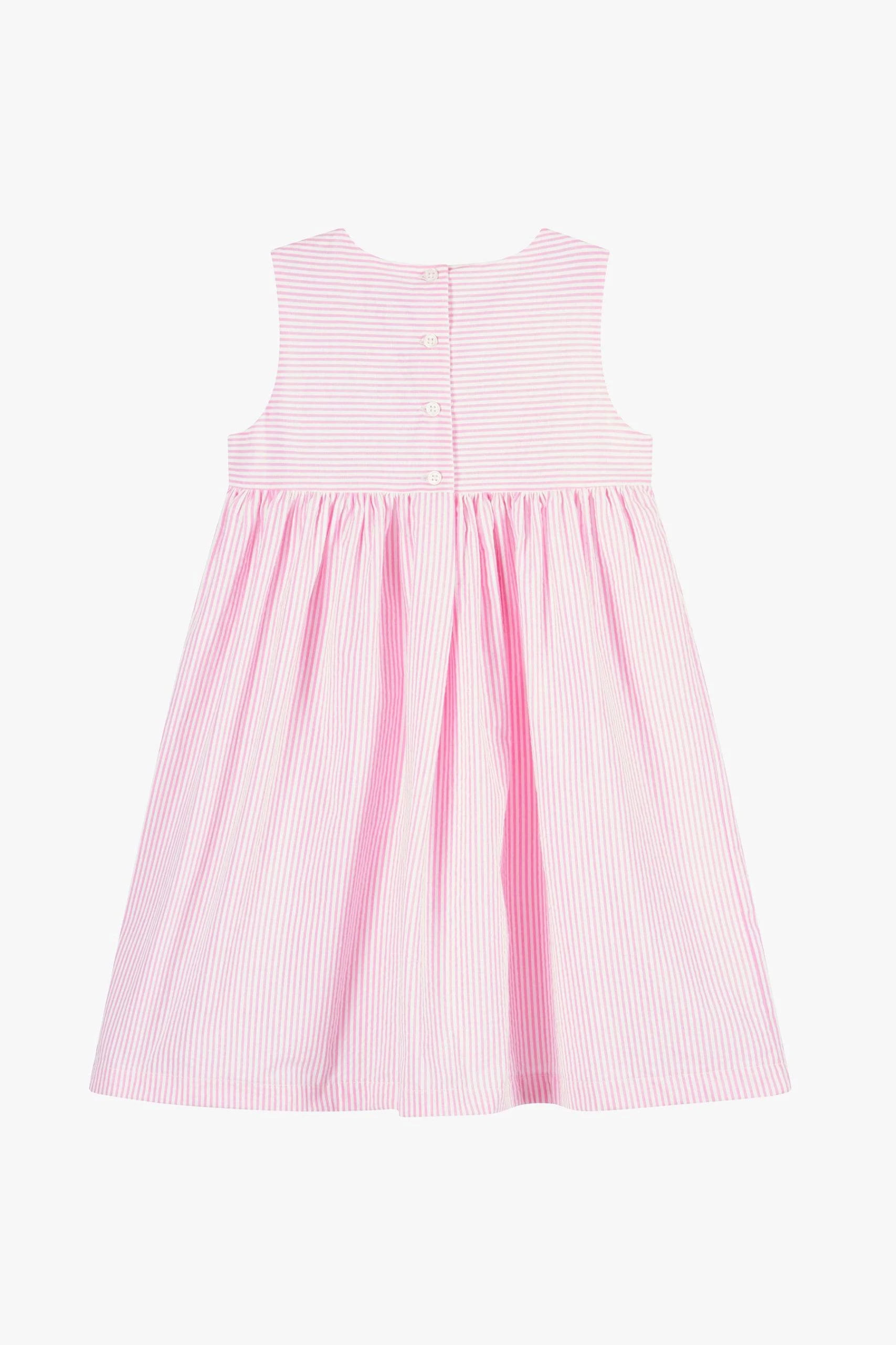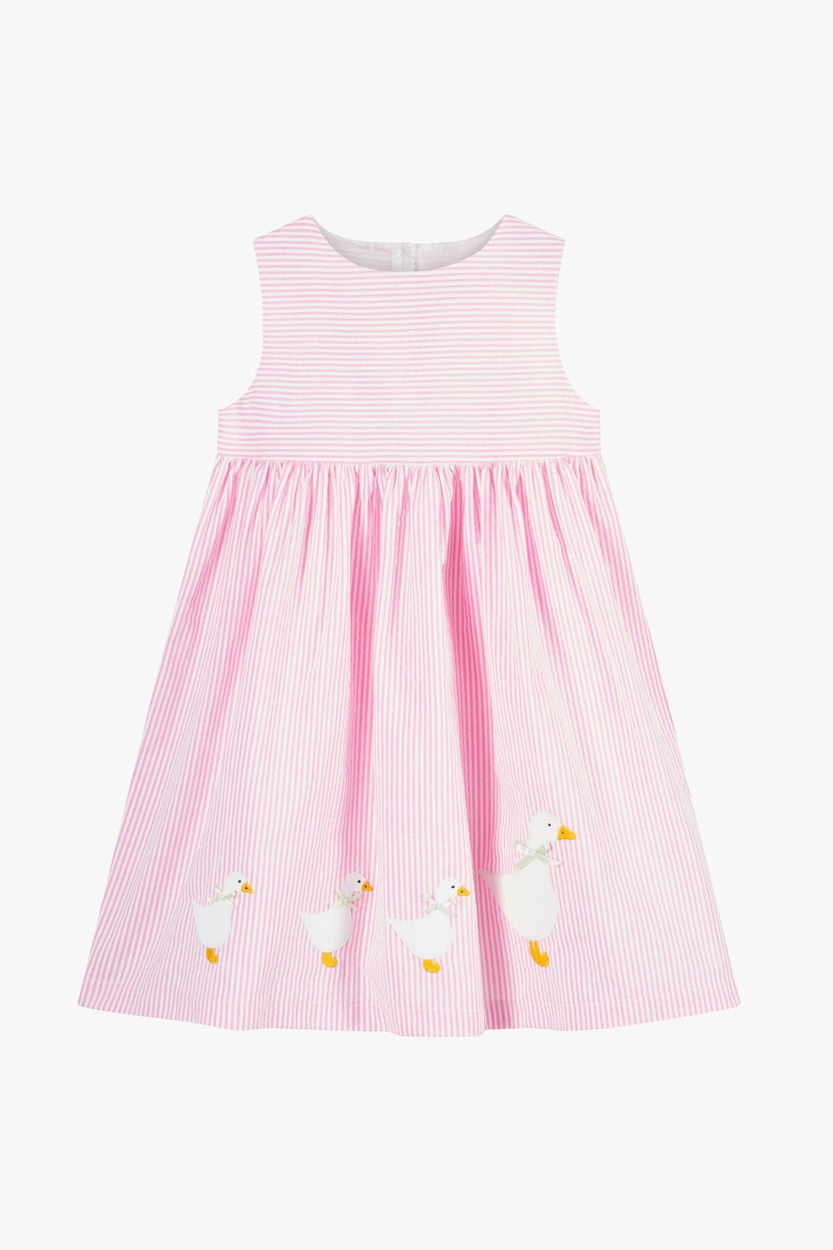 A Trotters classic, our Jemima pinafore comes in pretty pink seersucker stripe this season and is finished with our signature appliqué ducks, complete with complementary mint green satin bows. Fully lined and sitting just below the knee it’s the perfect way to stay cool this summer and makes a sweet, traditional look for girls.
