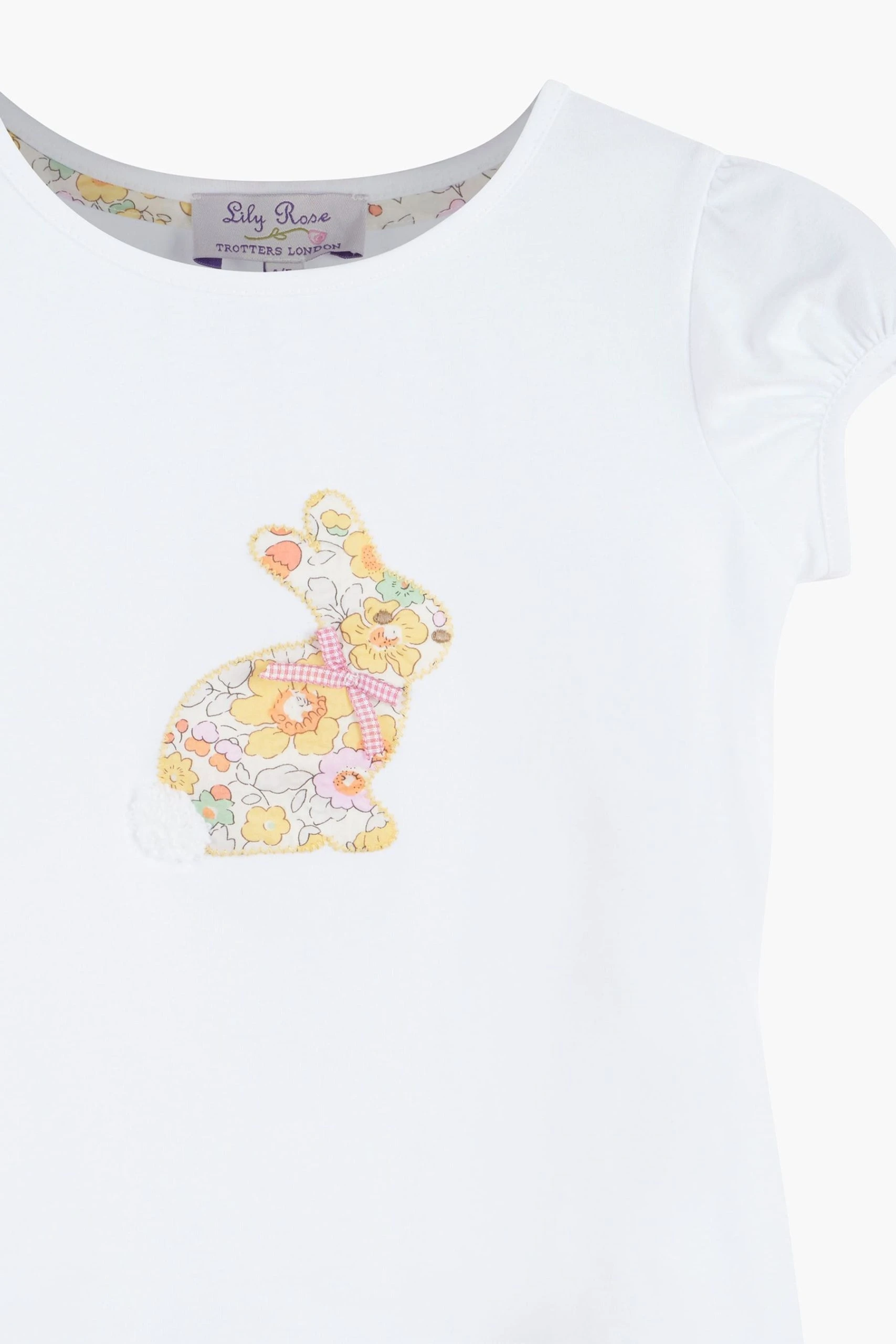 A beautiful twist on a wardrobe staple, this t-shirt features an adorable appliqué bunny on the front made in Liberty’s Betsy print fabric known for its stylised small floral design. Cotton-rich, this lovely white t-shirt with puff sleeves is both comfortable and versatile.